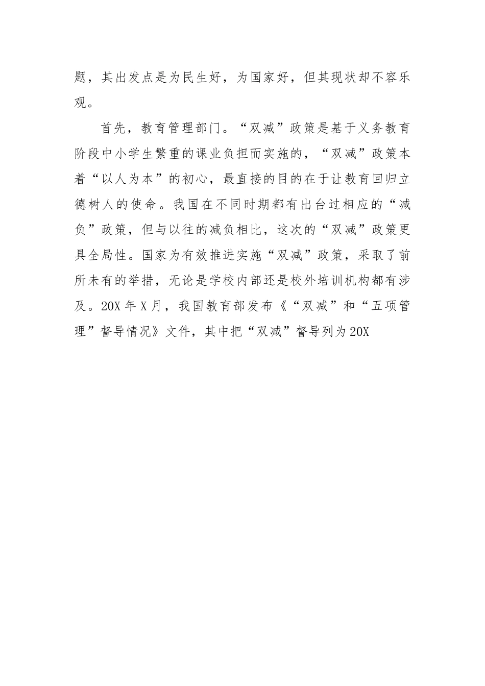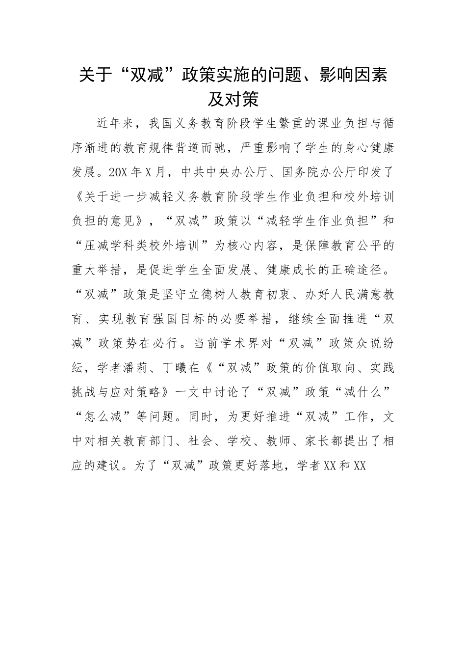 关于“双减”政策实施的问题、影响因素及对策近年来,我国义务教育阶段学生繁重的课业负担与循序渐进的教育规律背道而驰,严重影响了学生的身心健康发展。20X年X月,中共中央办公厅、国务院办公厅印发了《关于进一步减轻义务教育阶段学生作业负担和校外培训负担的意见》,“双减”政策以“减轻学生作业负担”和“压减学科类校外培训”为核心内容,是保障教育公平的重大举措,是促进学生全面发展、健康成长的正确途径。“双减”政策是坚守立德树人教育初衷、办好人民满意教育、实现教育强国目标的必要举措,继续全面推进“双减”政策势在必行。当前学术界对“双减”政策众说纷纭,学者潘莉、丁曦在《“双减”政策的价值取向、实践挑战与应对策略》一文中讨论了“双减”政策“减什么”“怎么减”等问题。同时,为更好推进“双减”工作,文中对相关教育部门、社会、学校、教师、家长都提出了相应的建议。为了“双减”政策更好落地,学者XX和XX聚焦学校课后服务和校外培训来分析“双减”政策,并提出了针对性的对策。在全国各地落实“双减”政策的过程中,面临各种困难及怎样让“双减”政策更好地落实等问题,都值得深入探讨。本文从探讨“双减”政策存在价值取向的误解、实施环境的空缺、运行监督机制的缺乏、实施与反馈的缺位等现实问题入手,来探究影响“双减”政策实施的因素,提出“双减”政策需要明确价值取向、改善实施环境、加大监督力度、加强反馈与评估、调动“双减”政策参与者的积极性与主动性、协调好社会各个方面的利益关系等对策,以期继续推进“双减”政策更好地落到实处。一、“双减”政策的实施现状中共中央办公厅、国务院办公厅印发《关于进一步减轻义务教育阶段学生作业负担和校外培训负担的意见》,“双减”政策正式出台。关于当前教育状况,我国教育部有关负责人曾分析,“义务教育最突出的问题之一还是中小学生负担太重,短视化、功利性问题没有根本解决。一方面是学生作业负担仍然较重,作业管理不够完善;另一方面是校外培训仍然过热,超前超标培训问题尚未根本解决。”“双减”政策立足于教育实践,在实施过程中注重以人为本,具有全局性、操作性、针对性和指向性的特点。“双减”政策出台的初衷就是为解决时下的教育问题,其出发点是为民生好,为国家好,但其现状却不容乐观。首先,教育管理部门。“双减”政策是基于义务教育阶段中小学生繁重的课业负担而实施的,“双减”政策本着“以人为本”的初心,最直接的目的在于让教育回归立德树人的使命。我国在不同时期都有出台过相应的“减负”政策,但与以往的减负相比,这次的“双减”政策更具全局性。国家为有效推进实施“双减”政策,采取了前所未有的举措,无论是学校内部还是校外培训机构都有涉及。20X年X月,我国教育部发布《“双减”和“五项管理”督导情况》文件,其中把“双减”督导列为20X年教育督导工作“一号工程”、建立“双减”专项督导半月通报制度、将“双减”工作纳入省级政府履职督导评价、设立“双减”问题专门举报平台、发布预警提示家长校外培训缴费风险、组织开展实地督查。同时,对中小学生手机、睡眠、读物、作业、体质管理也作出了规定。从“双减”工作实际实施情况来看,地方教育管理部门阳奉阴违的行为屡见不鲜,要做好“双减”工作需要不断总结经验,立足实践,切实做好每一步,从根本上杜绝“新瓶装旧酒”的现象。其次,学校与教师。自“双减”政策出台后,学校仍然有许多问题,即“唯升学率”、学生考试有增无减、教师根据成绩区别对待学生等。“双减”政策目标明确,具有高度的操作性,在作业总量时长、课后服务、规范校外培训、校内教学等方面都提出了具体明确的要求。教育部要求全国各地各校实行5+2课后延时服务,对学校教师也提出了相应的要求。但这样一来,就在无形中增加了教师的工作量,教师群体中消极怠工的行为便悄悄滋生。据报道,一位教师因发布关于课后延时服务的不当言论引发家长怒火,该教师也因此被开除。由此可见,“双减”政策在学校和教师方面相关配套措施和工作还有待完善。最后,社会与家庭。在家庭方面,首先“双减”政策有利于减轻家庭经济负担。家长为教...