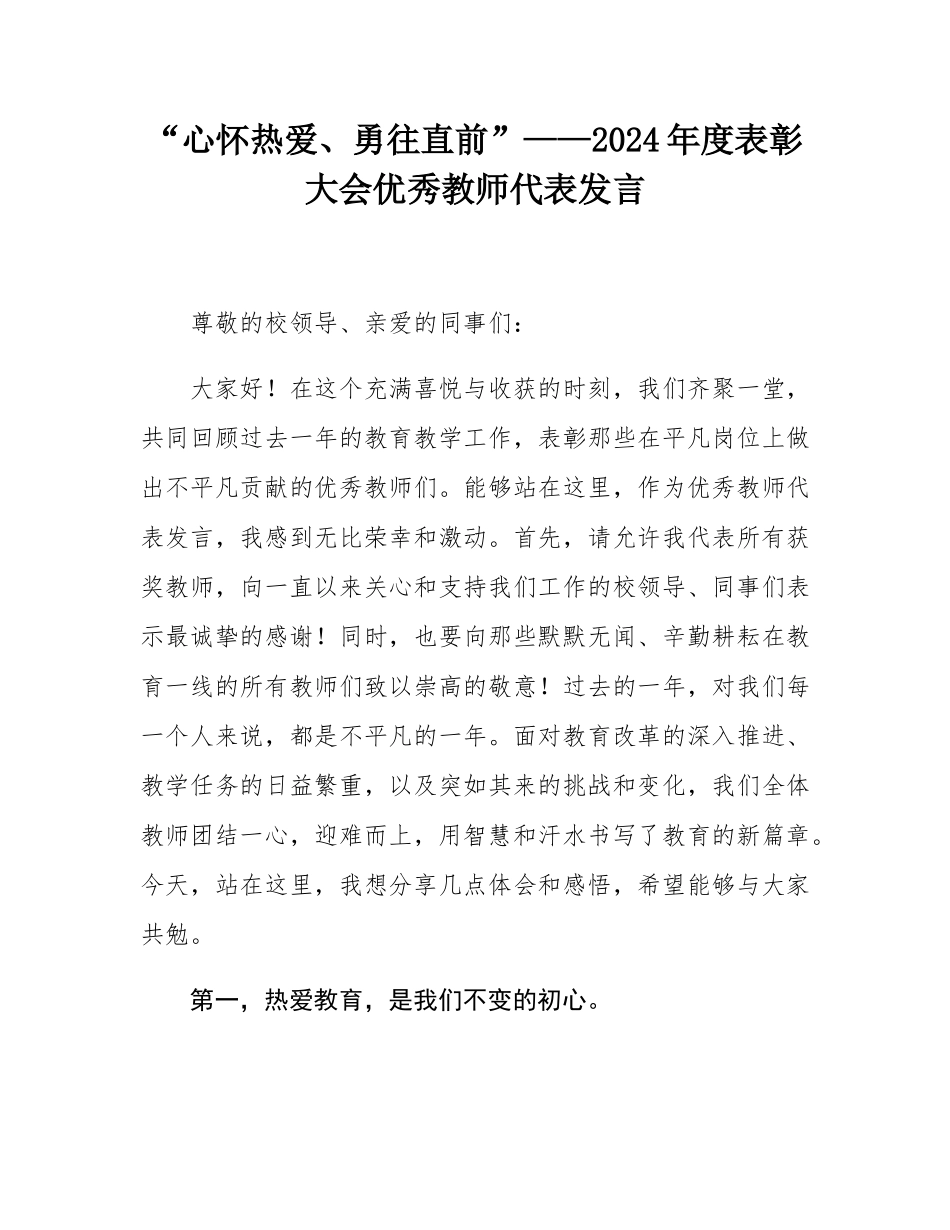 “心怀热爱、勇往直前”——2024年度表彰大会优秀教师代表发言尊敬的校领导、亲爱的同事们:大家好!在这个充满喜悦与收获的时刻,我们齐聚一堂,共同回顾过去一年的教育教学工作,表彰那些在平凡岗位上做出不平凡贡献的优秀教师们。能够站在这里,作为优秀教师代表发言,我感到无比荣幸和激动。首先,请允许我代表所有获奖教师,向一直以来关心和支持我们工作的校领导、同事们表示最诚挚的感谢!同时,也要向那些默默无闻、辛勤耕耘在教育一线的所有教师们致以崇高的敬意!过去的一年,对我们每一个人来说,都是不平凡的一年。面对教育改革的深入推进、教学任务的日益繁重,以及突如其来的挑战和变化,我们全体教师团结一心,迎难而上,用智慧和汗水书写了教育的新篇章。今天,站在这里,我想分享几点体会和感悟,希望能够与大家共勉。第一,热爱教育,是我们不变的初心。选择了教师这个职业,就是选择了奉献和热爱。热爱教育,不仅仅是一句口号,更是我们行动的指南。在过去的一年里,我深刻体会到,只有对教育事业充满热爱,才能在课堂上充满激情,才能用心灵去触动学生的心灵。无论是备课到深夜,还是耐心解答学生的每一个疑问,无论是组织丰富多彩的课外活动,还是关注每一个学生的成长和发展,都是源于我们对教育的热爱和执着。这份热爱,让我们在平凡的岗位上,创造出了不平凡的业绩。第二,勇于创新,是我们前进的动力。教育是一项需要不断创新的事业。在过去的一年里,我们积极探索教育教学的新方法、新途径,努力提升教学质量和效果。我深知,传统的教学方式已经难以满足现代学生的需求,因此,我尝试将信息技术融入课堂教学,利用多媒体、网络等现代教学手段,激发学生的学习兴趣和积极性。同时,我也注重培养学生的创新思维和实践能力,鼓励他们勇于尝试、敢于挑战。这些创新举措不仅提高了教学效果,也让学生在轻松愉快的氛围中收获了知识和成长。第三,关爱学生,是我们神圣的使命。学生是教育的主体,也是我们工作的中心。在过去的一年里,我始终将关爱学生放在首位,用真心去倾听他们的声音,用爱心去温暖他们的心灵。我深知,每一个学生都是独一无二的个体,他们有着自己的梦想和追求。因此,我努力做到因材施教,关注每一个学生的成长和发展,帮助他们找到自己的优势和特长,激发他们的潜能和创造力。同时,我也注重培养学生的品德和素养,引导他们树立正确的价值观和人生观。这份关爱,让我们与学生之间建立了深厚的师生情谊,也让我们在教育的道路上走得更远、更稳。第四,团结协作,是我们成功的保障。教育是一项系统工程,需要全体教师的共同努力和协作。在过去的一年里,我们教研组的老师们团结一心、密切合作,共同研究教学问题、分享教学经验、探讨教学方法。这种团结协作的精神不仅提高了我们的教学水平,也增强了我们的凝聚力和战斗力。我深知,一个人的力量是有限的,但一个团队的力量是无穷的。只有团结协作、相互支持,我们才能共同应对挑战、取得成功。回顾过去的一年,我们取得了可喜的成绩,但也清醒地认识到,前方的道路还很长、任务还很艰巨。在新的学年里,我们将继续秉承“热爱教育、勇于创新、关爱学生、团结协作”的精神,不断提升自己的专业素养和教学能力,为培养更多优秀人才、为学校的蓬勃发展贡献自己的力量。最后,我想用一句话来结束我的发言:“教育之路虽长且艰,但我们心怀热爱、勇往直前!”让我们携手并进、共同努力,为创造更加美好的教育未来而不懈奋斗!谢谢大家!