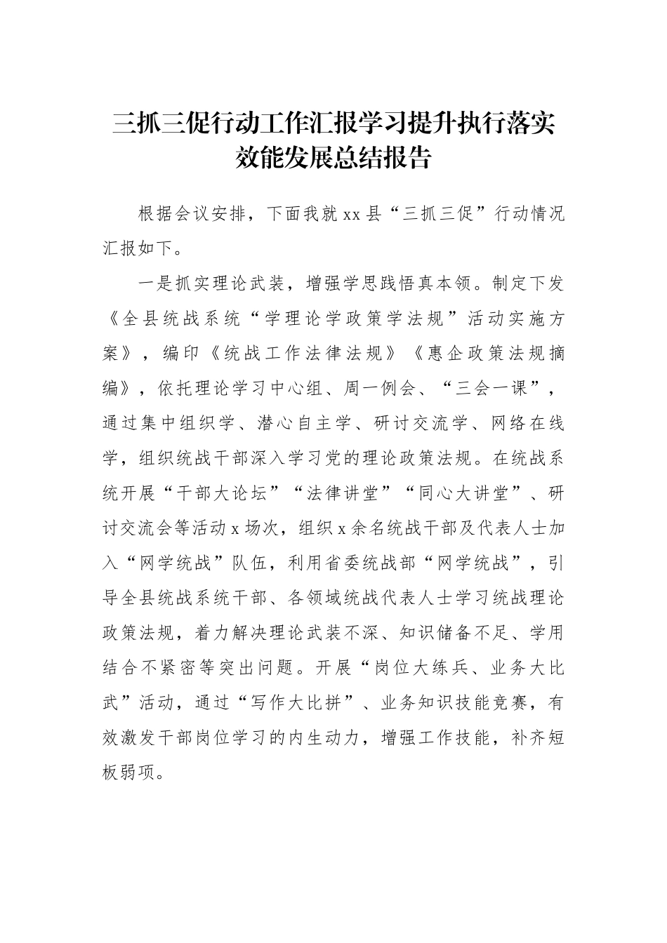 三抓三促行动工作汇报学习提升执行落实效能发展总结报告根据会议安排,下面我就xx县“三抓三促”行动情况汇报如下。一是抓实理论武装,增强学思践悟真本领。制定下发《全县统战系统“学理论学政策学法规”活动实施方案》,编印《统战工作法律法规》《惠企政策法规摘编》,依托理论学习中心组、周一例会、“三会一课”,通过集中组织学、潜心自主学、研讨交流学、网络在线学,组织统战干部深入学习党的理论政策法规。在统战系统开展“干部大论坛”“法律讲堂”“同心大讲堂”、研讨交流会等活动x场次,组织x余名统战干部及代表人士加入“网学统战”队伍,利用省委统战部“网学统战”,引导全县统战系统干部、各领域统战代表人士学习统战理论政策法规,着力解决理论武装不深、知识储备不足、学用结合不紧密等突出问题。开展“岗位大练兵、业务大比武”活动,通过“写作大比拼”、业务知识技能竞赛,有效激发干部岗位学习的内生动力,增强工作技能,补齐短板弱项。二是聚焦痛点难点,全面助企纾困促发展。结合“三抓三促”行动,认真落实“优化营商环境攻坚突破年”活动和优化营商环境对标提升三年行动,纵深推进“最有意义的一件事”咨询问政活动,走访企业x余家,协调解决问题x件。协调召开“政银企”对接座谈会,为x家企业授信x亿元。组织x名民营企业家开展“惠企政策宣讲、能力素质提升”行动暨民营经济高质量发展培训班,组织x多名女企业家举办电商技能培训班、“临字号”产品直播带货培训班,针对民营经济发展壮大开展有针对性的辅导与指导,全面提振民营企业家发展信心。组织女企业家商会为鸭暖镇x名困难儿童捐赠衣服、鞋子等生活用品,为x对“一老一小”留守儿童家庭送去慰问金,为困难老人提供爱心义剪和爱心午餐服务,彰显企业家担当。三是做好结合文章,激发统战工作新活力。把开展“三抓三促”行动与统战工作结合起来,一体化推进。建立部班子成员和统战干部联系包抓乡镇、村(社区)的责任体系,推动各项工作任务落实。班子成员带队,围绕学习宣传贯彻中央民族工作会议精神和全国宗教工作会议精神、基层统战工作提质增效、新阶层人士服务经济社会发展等课题,深入各镇、统战各领域开展走访调研,形成调研报告x篇,提炼更好服务新经济组织经验做法x个方面,查出问题x个,提出对策建议x条。支持各民主党派、无党派人士、工商联围绕全县中心工作,积极建言献策。指导县新联会建立“会长轮值制度”,开展“一月一主题一活动”,至目前,开展政策法规学习、法律宣讲、国学大讲堂等主题活动x场次。四是坚持问题导向,聚焦短板弱项抓整改。班子成员和统战干部分组联系包抓各镇,赴各镇、部门单位开展调研,摸排民族宗教领域突出问题,下发交办单,指导各镇、部门单位全面开展自查自纠,扎实推进问题整改。对照贯彻落实中央和省委民族工作会议精神要求,梳理出问题清单。我们虽然做了大量工作,取得了一定成效,但还存在“三抓三促”行动与统战工作融合不够,统战代表人士思想政治引领方面措施不多等问题。下一步,我们将进一步靠实责任、强化措施,高标准、高质量全面完成各项工作任务。一是在提升能力素质上下功夫。聚焦理论政策法规,利用“干部大论坛”“法律讲堂”“同心大讲堂”“网学统战”等载体,抓实专题学习、专题研讨、专题调研、专题练兵,补足统战干部理论知识短板。将学习理论政策法规融入统战各领域教育实践活动,创新形式载体,丰富方法手段,组织全县统一战线开展大学习、大宣讲、大培训活动和“学理论学政策学法规”活动,通过形式多样的学习培训、研讨交流、宣传宣讲,不断凝聚共同奋斗的政治共识。二是在发挥统战优势上求突破。将统战工作与“三抓三促”行动一体推进,对标党的二十大作出的重大战略部署,围绕市县建设目标,紧盯2023年统战工作要点确定的重点任务,聚焦多党合作、铸牢中华民族共同体意识、新时代民营经济和新的社会阶层人士统战工作、防范风险隐患等方面,整合优势力量,协调各方参与,集中攻坚克难,着力打造xx“统战样板”。三是在抓好整改落实上见成效。坚持问题导向、目标导向、结果导向,紧扣贯彻落实中央和省市民族工作会议精神任务...
