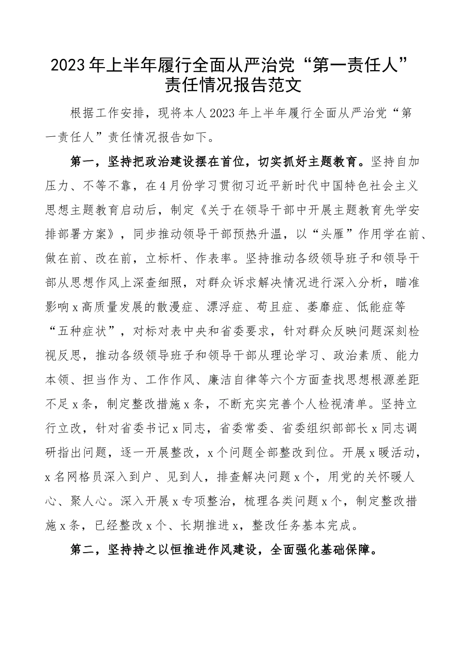 2023年上半年履行全面从严治党“第一责任人”责任情况报告范文根据工作安排,现将本人2023年上半年履行全面从严治党“第一责任人”责任情况报告如下。第一,坚持把政治建设摆在首位,切实抓好主题教育。坚持自加压力、不等不靠,在4月份学习贯彻习近平新时代中国特色社会主义思想主题教育启动后,制定《关于在领导干部中开展主题教育先学安排部署方案》,同步推动领导干部预热升温,以“头雁”作用学在前、做在前、改在前,立标杆、作表率。坚持推动各级领导班子和领导干部从思想作风上深查细照,对群众诉求解决情况进行深入分析,瞄准影响x高质量发展的散漫症、漂浮症、苟且症、萎靡症、低能症等“五种症状”,对标对表中央和省委要求,针对群众反映问题深刻检视反思,推动各级领导班子和领导干部从理论学习、政治素质、能力本领、担当作为、工作作风、廉洁自律等六个方面查找思想根源差距不足x条,制定整改措施x条,不断充实完善个人检视清单。坚持立行立改,针对省委书记x同志,省委常委、省委组织部部长x同志调研指出问题,逐一开展整改,x个问题全部整改到位。开展x暖活动,x名网格员深入到户、见到人,排查解决问题x个,用党的关怀暖人心、聚人心。深入开展x专项整治,梳理各类问题x个,制定整改措施x条,已经整改x个、长期推进x,整改任务基本完成。第二,坚持持之以恒推进作风建设,全面强化基础保障。全面落实中央和省委为基层减负工作部署要求,举一反三整改省委解决形式主义官僚主义为基层减负专项督察反馈问题,制定《关于进一步整治形式主义为基层减负的若干措施》,明确了“x”制度等x条具体举措,与去年同期相比文件、会议总量下降x%,各类督查检查减少x%,全面叫停层层签订责任状和制定责任书,清理机关部门要求基层上报台账表格x项。进一步梳理和调整x权责清单,出台新的《x依法履行职责主要事项》和《x依法协助政府工作主要事项》,减少x工作职责x项。第三,坚持大兴调查研究之风,深入查摆短板弱项。大兴调查研究之风,将2023确定为x调研年,以学习贯彻习近平新时代中国特色社会主义思想主题教育深入调查研究的要求为契机,开展大走访大调研活动,先后发现问题x余个,解决x个,其余问题全部形成解决方案。从领导干部做起,制定《领导干部接访下访工作安排》,截至本月底,领导接访x人次,接待群众x批x人次,化解群众信访问题x件,督办x件。第四,坚持围绕高质量发展目标任务,全力夯实基础。以x次全会通过的《关于加强党的政治建设的意见》为根本,研究制定《中共x委关于加快绿色高质量发展的意见》,截至x年三季度,生产总值x亿元,增长x%,一般公共预算收入实现x亿元,国内招商引资完成x亿元;居民人均可支配收入x元,增长x%,稳中向好的发展态势得到进一步巩固。积极承接x疏解,落地x优质项目x个,协议投资额x亿元,储备x项目x个,协议投资额x亿元。制定《关于加快推进全域城深化的实施方案》,聚焦x地块逐项落实精准拆迁,全力弥补拆迁工作历史欠账,滞留户清零x户,x万平方米,预计年底前将完成拆迁x万平方米拆迁任务。聚焦“查漏洞”“补短板”,全面排查剩余房源和未还迁人员情况,实现以拆迁促还迁,以还迁促拆迁,x户双倍租房费已清零,预计年底前全面解决双倍租房费和滞留户问题。第五,坚持健全传导链条,层层压实党建责任。坚持x常委会研究党建工作机制。今年以来,x常委会会议专题研究基层党建工作x次。强化统筹领导和安排部署,制定《x党的建设工作领导小组2023年工作要点》《x开展全面实施基层党组织组织力提升工程专项行动工作方案》,压紧压实责任链条。抓好带头人队伍建设。坚持问题导向,结合基层党建存在的突出问题,制定整改工作任务书,明确工作任务和责任,以问题整改落实强化责任落地。规范干部选用,严格程序防止不正之风滋生。认真落实《党政领导干部选拔任用工作条例》,严格按照规定选人用人,始终以公开、平等、竞争的方式进行干部的提拔和任用,注重选拔群众公认、注重实绩、在本职岗位上表现优秀的干部,严把干部入口关,防止和纠正选人用人上的不正之风和腐败问题。坚持把《干部选拔任用条例》和四项监督制度等政策法规纳入夜...