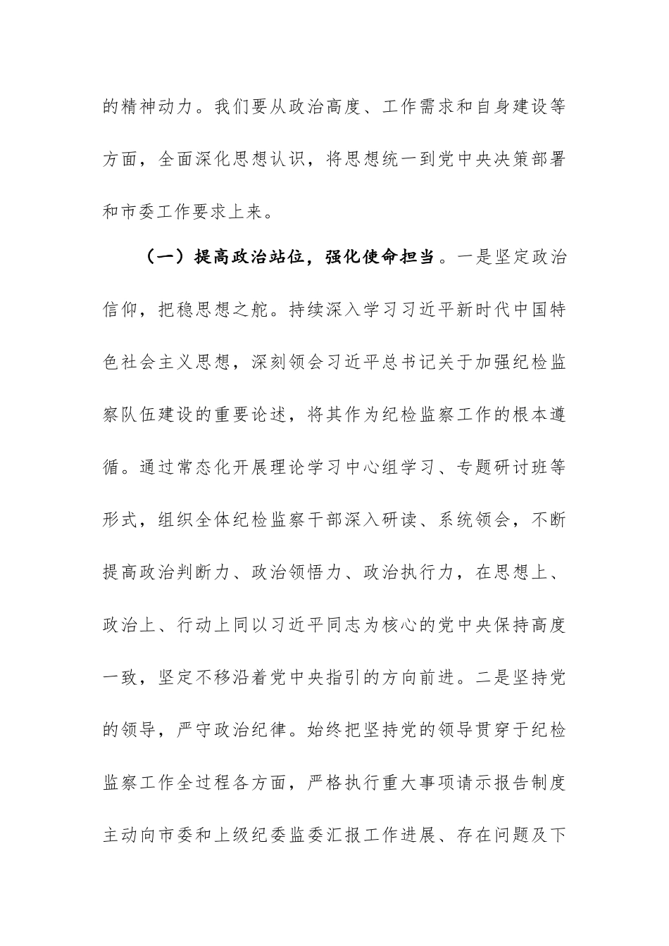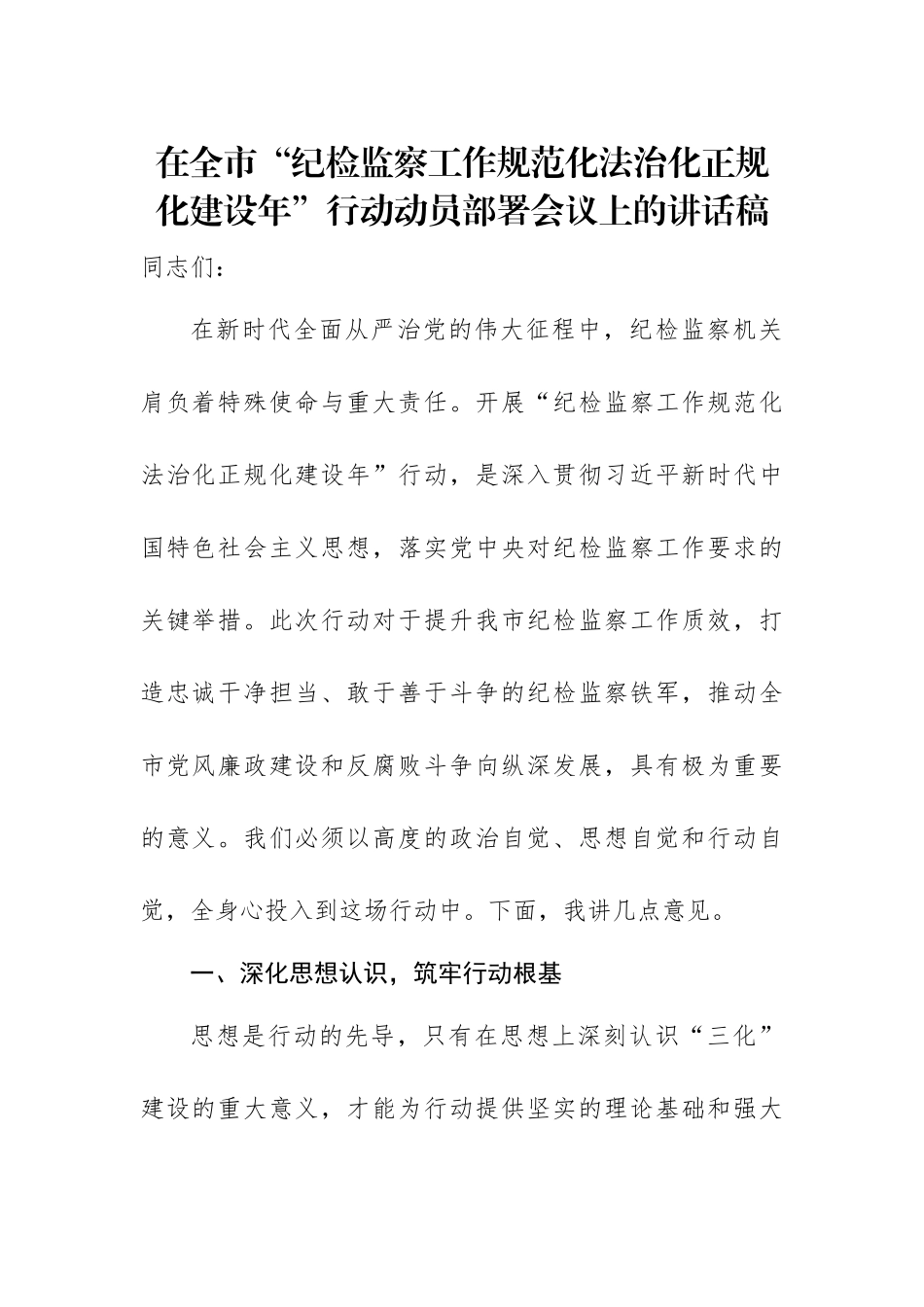 在全市“纪检监察工作规范化法治化正规化建设年”行动动员部署会议上的讲话稿同志们:在新时代全面从严治党的伟大征程中,纪检监察机关肩负着特殊使命与重大责任。开展“纪检监察工作规范化法治化正规化建设年”行动,是深入贯彻习近平新时代中国特色社会主义思想,落实党中央对纪检监察工作要求的关键举措。此次行动对于提升我市纪检监察工作质效,打造忠诚干净担当、敢于善于斗争的纪检监察铁军,推动全市党风廉政建设和反腐败斗争向纵深发展,具有极为重要的意义。我们必须以高度的政治自觉、思想自觉和行动自觉,全身心投入到这场行动中。下面,我讲几点意见。一、深化思想认识,筑牢行动根基思想是行动的先导,只有在思想上深刻认识“三化”建设的重大意义,才能为行动提供坚实的理论基础和强大的精神动力。我们要从政治高度、工作需求和自身建设等方面,全面深化思想认识,将思想统一到党中央决策部署和市委工作要求上来。(一)提高政治站位,强化使命担当。一是坚定政治信仰,把稳思想之舵。持续深入学习习近平新时代中国特色社会主义思想,深刻领会习近平总书记关于加强纪检监察队伍建设的重要论述,将其作为纪检监察工作的根本遵循。通过常态化开展理论学习中心组学习、专题研讨班等形式,组织全体纪检监察干部深入研读、系统领会,不断提高政治判断力、政治领悟力、政治执行力,在思想上、政治上、行动上同以习近平同志为核心的党中央保持高度一致,坚定不移沿着党中央指引的方向前进。二是坚持党的领导,严守政治纪律。始终把坚持党的领导贯穿于纪检监察工作全过程各方面,严格执行重大事项请示报告制度主动向市委和上级纪委监委汇报工作进展、存在问题及下一步计划,积极争取党委的领导和支持。坚决维护党的纪律的严肃性,严肃查处违反政治纪律和政治规矩的行为,确保党的路线方针政策在XX落地生根,为全市改革发展稳定提供坚强政治保障。三是增强政治意识,扛起政治责任深刻认识到纪检监察工作是党的政治工作的重要组成部分开展“三化”建设年行动是履行政治责任的必然要求。从讲政治的高度看待“三化”建设,将其与贯彻党中央全面从严治党战略部署、服务保障XX经济社会高质量发展紧密结合,以强烈的政治责任感和使命感,主动担当作为,为全市政治生态持续向好贡献力量。(二)把握工作需求,提升履职能力。一是聚焦主责主业,提高监督质效。紧紧围绕纪检监察机关监督执纪问责、监督调查处置职责,以“三化”建设为契机,优化监督方式方法,整合监督力量,构建全方位、多层次的监督体系。加强对重点领域、关键环节和重要岗位的监督,及时发现和纠正问题,确保权力规范运行,切实提升监督的针对性和实效性,为党风廉政建设和反腐败斗争提供有力支撑。二是紧跟时代步伐,适应改革要求。随着纪检监察体制改革的不断深入,新的任务和挑战接踵而至。我们要积极适应改革带来的新变化,加强对新政策、新法规的学习研究,不断完善工作机制和流程,提高运用法治思维和法治方式开展工作的能力,确保改革成果得到巩固和拓展推动纪检监察工作在改革中不断前进。三是解决突出问题补齐工作短板。深入分析当前纪检监察工作中存在的薄弱环节和突出问题,如部分干部业务能力不足、工作程序不够规范等,通过“三化”建设,有针对性地加以解决。建立问题清单和整改台账,明确整改措施和责任人员,实行销号管理,以问题整改推动工作提升,实现纪检监察工作的全面进步。(三)加强自身建设,树立良好形象。一是强化纪律意识,坚守廉洁底线。加强对纪检监察干部的纪律教育,深入学习党纪国法和纪检监察干部行为规范,通过开展廉政党课、警示教育活动等,让纪律意识和规矩意识入脑入心。严格执行监督执纪工作规则,加强对权力运行的监督制约,坚决防止“灯下黑”,确保纪检监察干部始终做到廉洁自律、清正廉洁。二是提升业务能力,增强履职本领根据纪检监察工作实际需要,制定系统的业务培训计划,通过专题培训、案例教学、岗位练兵等多种方式,加强对干部的业务培训,提升干部在监督检查、审查调查、案件审理等方面的专业能力。鼓励干部加强学习研究,不断更新知识结构,提高综合素质,努力...