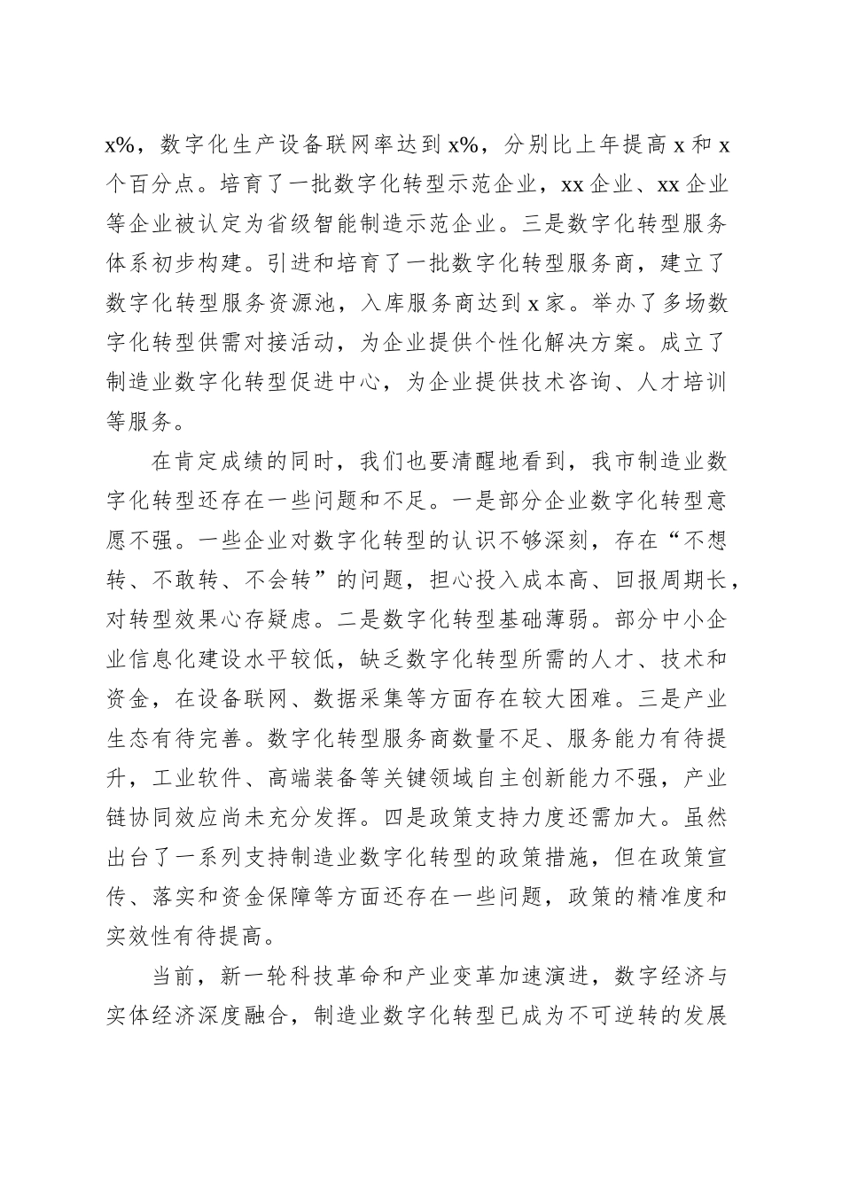 在全市制造业数字化转型工作推进会议上的讲话同志们:今天,我们召开全市制造业数字化转型工作推进会,主要目的是深入学习贯彻习近平总书记关于制造强国的重要论述,全面落实国家和省关于制造业数字化转型的决策部署,总结工作成效,分析存在问题,研究部署下一阶段工作,推动我市制造业数字化转型取得更大突破。刚才,市工信局通报了全市制造业数字化转型工作情况,有关县区、xx企业等单位作了交流发言,讲得都很好,希望大家相互学习借鉴。下面,我讲几点意见。一、肯定成绩,正视不足,切实增强制造业数字化转型的紧迫感和使命感近年来,全市上下认真贯彻落实国家和省关于制造业数字化转型的决策部署,坚持把制造业数字化转型作为推动制造业高质量发展的重要抓手,强化政策支持,加大工作力度,取得了阶段性成效。一是数字基础设施不断完善。全市5G网络覆盖率持续提升,累计建成5G基站x万个,实现了主城区、工业园区和重点乡镇的深度覆盖。工业互联网标识解析二级节点建设稳步推进,已接入企业x家,标识注册量达到x亿个。二是企业数字化水平逐步提高。通过实施智能制造试点示范、“上云用数赋智”等行动,全市规上工业企业关键工序数控化率达到x%,数字化生产设备联网率达到x%,分别比上年提高x和x个百分点。培育了一批数字化转型示范企业,xx企业、xx企业等企业被认定为省级智能制造示范企业。三是数字化转型服务体系初步构建。引进和培育了一批数字化转型服务商,建立了数字化转型服务资源池,入库服务商达到x家。举办了多场数字化转型供需对接活动,为企业提供个性化解决方案。成立了制造业数字化转型促进中心,为企业提供技术咨询、人才培训等服务。在肯定成绩的同时,我们也要清醒地看到,我市制造业数字化转型还存在一些问题和不足。一是部分企业数字化转型意愿不强。一些企业对数字化转型的认识不够深刻,存在“不想转、不敢转、不会转”的问题,担心投入成本高、回报周期长,对转型效果心存疑虑。二是数字化转型基础薄弱。部分中小企业信息化建设水平较低,缺乏数字化转型所需的人才、技术和资金,在设备联网、数据采集等方面存在较大困难。三是产业生态有待完善。数字化转型服务商数量不足、服务能力有待提升,工业软件、高端装备等关键领域自主创新能力不强,产业链协同效应尚未充分发挥。四是政策支持力度还需加大。虽然出台了一系列支持制造业数字化转型的政策措施,但在政策宣传、落实和资金保障等方面还存在一些问题,政策的精准度和实效性有待提高。当前,新一轮科技革命和产业变革加速演进,数字经济与实体经济深度融合,制造业数字化转型已成为不可逆转的发展趋势。我们必须深刻认识制造业数字化转型的重要性和紧迫性,切实增强责任感和使命感,坚定不移地推进制造业数字化转型,加快推动制造业高质量发展。二、明确目标,突出重点,全力推动制造业数字化转型取得新突破根据国家和省的部署要求,结合我市实际,我市制造业数字化转型的总体目标是:到2026年,全市制造业数字化、网络化、智能化水平显著提升,数字基础设施更加完善,企业数字化转型成效明显,数字化转型服务体系更加健全,产业生态更加优化,制造业数字化转型走在全省前列。围绕这一目标,我们要重点抓好以下几个方面的工作:(一)加快数字基础设施建设,夯实数字化转型基础一是加强网络基础设施建设。持续推进5G网络深度覆盖,加快5G网络向工业园区、产业集群和重点企业延伸,到2026年,实现全市规上工业企业5G网络全覆盖。推进工业互联网标识解析体系建设,鼓励企业建设二级节点和企业节点,提高标识解析应用水平。二是完善工业互联网平台体系。培育壮大一批行业级、企业级工业互联网平台,支持平台企业开展技术创新、应用创新和商业模式创新,提升平台的服务能力和影响力。推动工业互联网平台与制造业企业深度融合,引导企业上平台用平台,实现生产设备的互联互通和生产过程的实时监控。三是推进数据中心建设。优化数据中心布局,加快建设绿色、低碳、高效的数据中心,提高数据存储和处理能力。加强数据资源整合和开发利用,建立健全数据安全保障体系,推动数据要素市场化配置。(二)深入实...