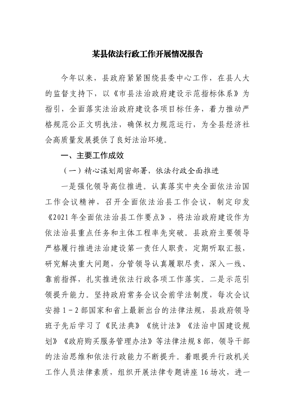 某县依法行政工作开展情况报告今年以来,县政府紧紧围绕县委中心工作,在县人大的监督支持下,以《市县法治政府建设示范指标体系》为指引,全面落实法治政府建设各项目标任务,着力推动严格规范公正文明执法,确保权力规范运行,为全县经济社会高质量发展提供了良好法治环境。一、主要工作成效(一)精心谋划周密部署,依法行政全面推进一是强化领导高位推进。认真落实中央全面依法治国工作会议精神,召开全面依法治县工作会议,制定印发《2021年全面依法治县工作要点》,将法治政府建设作为依法治县重点任务和主体工程率先突破。县政府主要领导严格履行推进法治建设第一责任人职责,定期听取汇报,研究解决重大问题,分管领导认真履职尽责,深入一线、靠前指挥,扎实推进依法行政各项工作落实。二是示范引领提升能力。坚持政府常务会议会前学法制度,每次会议安排1-2部国家和省上最新出台的法律法规,县政府领导班子先后学习了《民法典》《统计法》《法治中国建设规划》《政府购买服务管理办法》等法律法规8部,领导干部的法治思维和依法行政能力不断提升。着眼提升行政机关工作人员法律素质,组织开展法律专题讲座16场次,进一步增强了行政机关工作人员学法尊法守法用法意识。三是强化考评落实责任。坚持将依法行政工作纳入各级领导班子、领导干部政绩考核指标体系,增加平时考核分值比例,将考核成效作为衡量工作实绩的重要内容,以考核倒逼责任落实。严格落实年度法治督察计划,加大日常监督检查力度,先后对依法行政重点工作开展了2轮次专项督查检查,促进了各项工作的有效落实。(二)依法履职主动服务,营商环境持续优化一是加快政府职能转变。对标一流营商环境,制定出台《XX县深化改革创新优化营商环境的意见》、优化营商环境措施40条、促进就业创业措施10条、招商引资和重大项目前期手续部门承包代办责任制等一系列创新性突破性政策措施,营商环境建设实现了行政化、制度化、规范化保障。以新一轮政府机构改革为契机,积极推进机构、职能、权限、程序、责任法定化,编制县政府部门权责清单明确职能定位,规范部门权力运行,形成横向到边、纵向到底的权利制约和协调机制。二是优化政务服务模式。强力推进”三集中三到位”改革,在发改等XX个部门统一增设行政审批和公共服务股室,完善首席代表审批运行机制实现首席代表一次受理、一处审核、一张审批,政务服务水平持续提升。全面清理有碍于营商环境建设的行政性限制规定,公布民生事务、商事登记和投资项目高频事项XX项,”最多跑一次”事项XX项,清理取消县级证明事项XX项,梳理公布实行告知承诺制证明事项XX项,企业和群众办事提交材料总体减少XX%,办理时限总体压缩XX%,XX%的政务服务事项实现”一网通办”。三是加强事中事后监管。深入推进”双随机、一公开”监管和”互联网+监管”工作,制定公布跨部门”双随机、一公开”抽查计划XX个批次,部门内抽查计划XX批次。目前,XX部门协同监管平台迁移至”互联网+监管”系统,由市市场监管局组织开展系统应用。(三)依法合规科学决策,体制机制不断健全一是健全完善行政决策机制。制定印发《XX县人民政府重大行政决策程序规定》等制度2项,对棚户区改造、市政建设等重大决策事项,广泛征求公众意见、邀请专家论证、开展风险评估、召集律师合法性审查、集体研究决定组织召开各类听证会、专家论证会、征求意见会等XX场次,评估重大事项XX项,政府决策透明度和公众参与度不断增强。二是加强规范性文件审查管理。制定印发《XX县全面推行行政规范性文件合法性审核机制若干规定》,严格落实”三统一”制度,严把文件审查关、备案关和登记关,审核各类文件、合同XX件。组织清理涉及行政处罚和营商环境内容的行政法规、地方性法规、规章及行政规范性文件XX件,为经济社会发展创造了良好制度环境。三是深化公共法律服务体系建设。加快”全覆盖”实体平台、”多功能”热线平台、”便捷化”网络平台建设,大力开展”法治扶贫十项行动”、”冬季集中法治宣讲”、”民营企业法治体检”、”宣讲民法典”等活动,为全县XX个村(社县)免费配备法律顾问,”在XX+律师服务、公证服务...