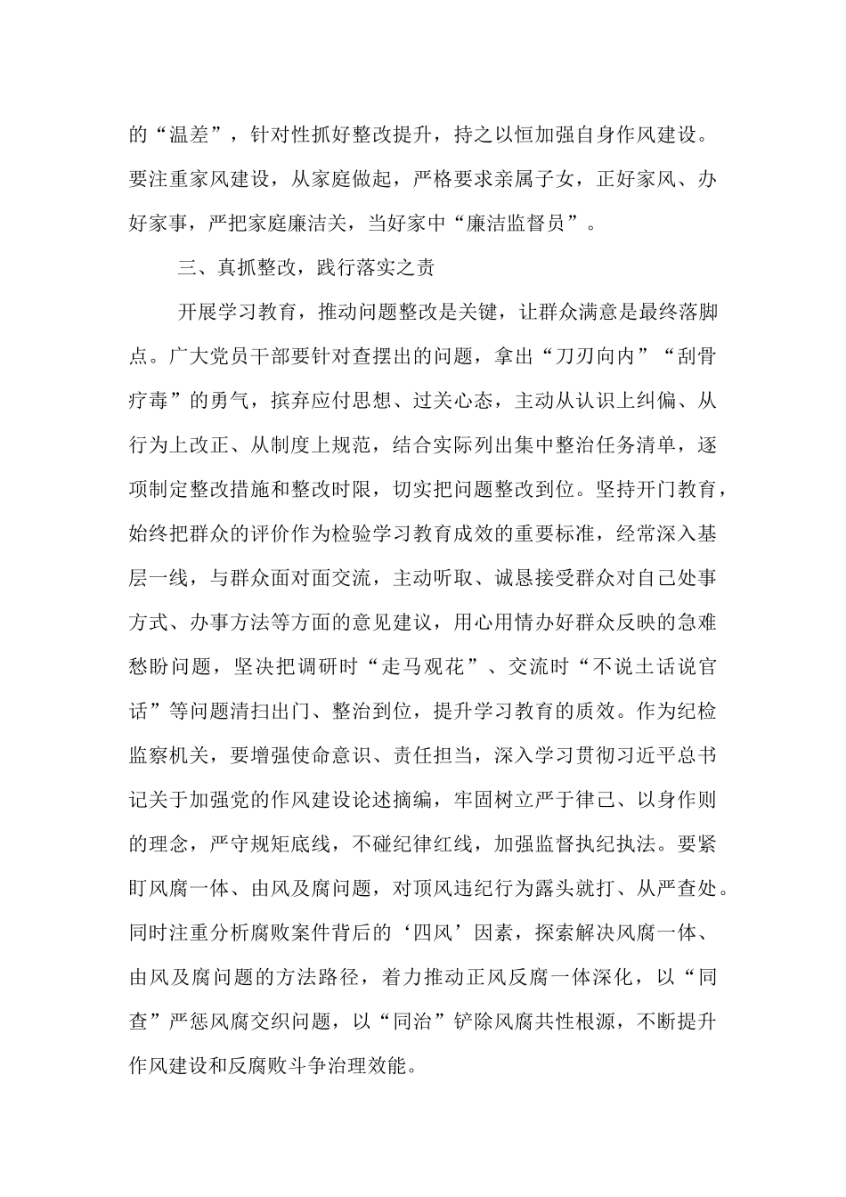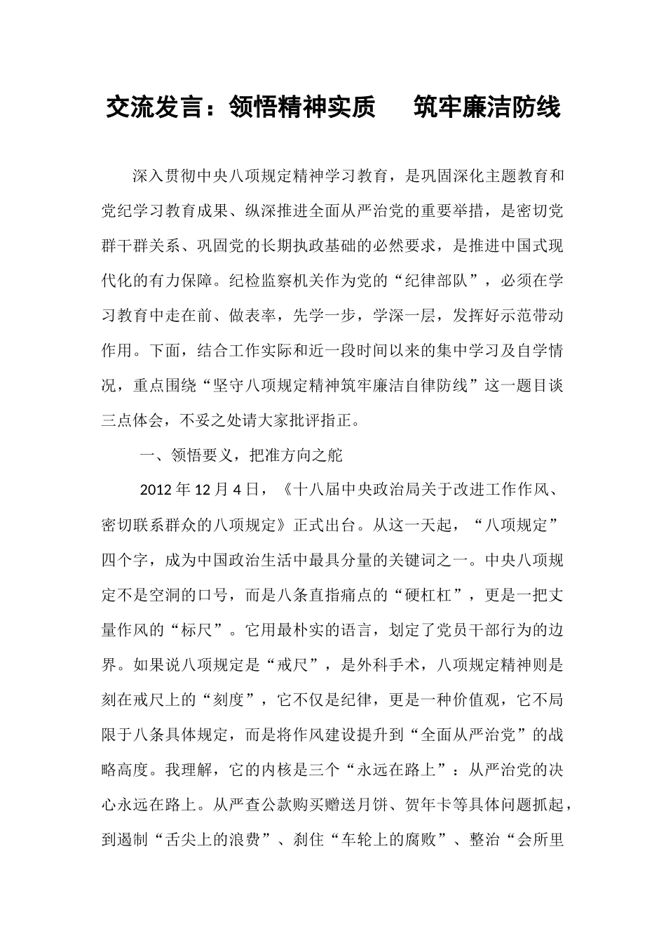 交流发言:领悟精神实质筑牢廉洁防线深入贯彻中央八项规定精神学习教育,是巩固深化主题教育和党纪学习教育成果、纵深推进全面从严治党的重要举措,是密切党群干群关系、巩固党的长期执政基础的必然要求,是推进中国式现代化的有力保障。纪检监察机关作为党的“纪律部队”,必须在学习教育中走在前、做表率,先学一步,学深一层,发挥好示范带动作用。下面,结合工作实际和近一段时间以来的集中学习及自学情况,重点围绕“坚守八项规定精神筑牢廉洁自律防线”这一题目谈三点体会,不妥之处请大家批评指正。一、领悟要义,把准方向之舵2012年12月4日,《十八届中央政治局关于改进工作作风、密切联系群众的八项规定》正式出台。从这一天起,“八项规定”四个字,成为中国政治生活中最具分量的关键词之一。中央八项规定不是空洞的口号,而是八条直指痛点的“硬杠杠”,更是一把丈量作风的“标尺”。它用最朴实的语言,划定了党员干部行为的边界。如果说八项规定是“戒尺”,是外科手术,八项规定精神则是刻在戒尺上的“刻度”,它不仅是纪律,更是一种价值观,它不局限于八条具体规定,而是将作风建设提升到“全面从严治党”的战略高度。我理解,它的内核是三个“永远在路上”:从严治党的决心永远在路上。从严查公款购买赠送月饼、贺年卡等具体问题抓起,到遏制“舌尖上的浪费”、刹住“车轮上的腐败”、整治“会所里的歪风”,十三年间,“越往后越严”的信号始终强烈;人民至上的立场永远在路上。从延安时候军民同甘共苦,到新时代社区干部深入群众、贴心服务,中央八项规定精神在基层的生动实践,充分体现了“以人民为中心”的发展思想;持续深化“四风”永远在路上。从中纪委连续137个月公布查处违反中央八项规定精神问题情况数据来看,“四风”问题树倒根存、禁而未绝,由风及腐、风腐一体,彻底铲除不正之风滋生的土壤还任重道远,抓作风建设只有进行时、没有完成时。二、对标对表,检视作风之弊作风建设是检验党员干部的重要标准,而问题查摆则是推动作风建设的关键环节。深入贯彻中央八项规定精神,必须要有敢于自我革命的斗争精神。党员干部要勇于正视自身存在的问题,不回避、不推诿,以壮士断腕的决心和勇气,向自身的不良作风“开刀”。作为一名纪检监察领导干部,更要破除“小节无害论”,小事小节是一面镜子,最能反映党性和作风,违反八项规定清单内容详细且具体,这是我们的行为准则,守住小节,才能涵养浩然气节。要开展“立体体检”,在思想和行为上以“显微镜”查细节、“探照灯”照盲区,重点实施“穿透式扫描”,既查显性问题,又挖隐形病灶,去除形式化、浅表化倾向,精准定位病灶。要以案为鉴。通过反面典型案例反思自己、警醒自己,对照中央八项规定精神列举的“文山会海”“层层陪同”“迎来送往”等形式主义、官僚主义等问题,深入剖析学习上的“时差”、执行上的“偏差”、效果上的“温差”,针对性抓好整改提升,持之以恒加强自身作风建设。要注重家风建设,从家庭做起,严格要求亲属子女,正好家风、办好家事,严把家庭廉洁关,当好家中“廉洁监督员”。三、真抓整改,践行落实之责开展学习教育,推动问题整改是关键,让群众满意是最终落脚点。广大党员干部要针对查摆出的问题,拿出“刀刃向内”“刮骨疗毒”的勇气,摈弃应付思想、过关心态,主动从认识上纠偏、从行为上改正、从制度上规范,结合实际列出集中整治任务清单,逐项制定整改措施和整改时限,切实把问题整改到位。坚持开门教育,始终把群众的评价作为检验学习教育成效的重要标准,经常深入基层一线,与群众面对面交流,主动听取、诚恳接受群众对自己处事方式、办事方法等方面的意见建议,用心用情办好群众反映的急难愁盼问题,坚决把调研时“走马观花”、交流时“不说土话说官话”等问题清扫出门、整治到位,提升学习教育的质效。作为纪检监察机关,要增强使命意识、责任担当,深入学习贯彻习近平总书记关于加强党的作风建设论述摘编,牢固树立严于律己、以身作则的理念,严守规矩底线,不碰纪律红线,加强监督执纪执法。要紧盯风腐一体、由风及腐问题,对顶风违纪行为露头就打、从严查处。...