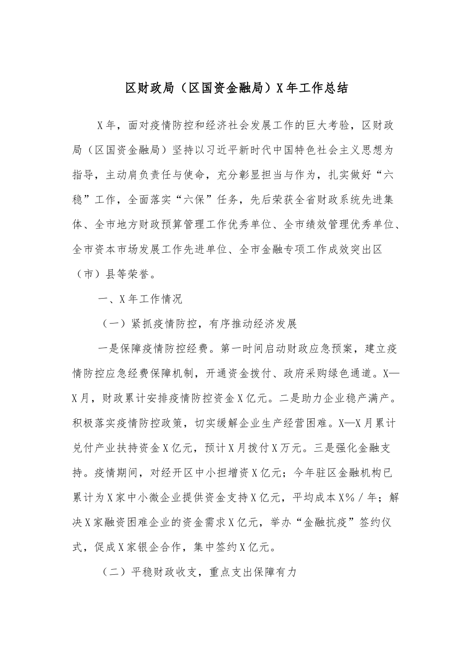 区财政局(区国资金融局)X年工作总结X年,面对疫情防控和经济社会发展工作的巨大考验,区财政局(区国资金融局)坚持以习近平新时代中国特色社会主义思想为指导,主动肩负责任与使命,充分彰显担当与作为,扎实做好“六稳”工作,全面落实“六保”任务,先后荣获全省财政系统先进集体、全市地方财政预算管理工作优秀单位、全市绩效管理优秀单位、全市资本市场发展工作先进单位、全市金融专项工作成效突出区(市)县等荣誉。一、X年工作情况(一)紧抓疫情防控,有序推动经济发展一是保障疫情防控经费。第一时间启动财政应急预案,建立疫情防控应急经费保障机制,开通资金拨付、政府采购绿色通道。X—X月,财政累计安排疫情防控资金X亿元。二是助力企业稳产满产。积极落实疫情防控政策,切实缓解企业生产经营困难。X—X月累计兑付产业扶持资金X亿元,预计X月拨付X万元。三是强化金融支持。疫情期间,对经开区中小担增资X亿元;今年驻区金融机构已累计为X家中小微企业提供资金支持X亿元,平均成本X%/年;解决X家融资困难企业的资金需求X亿元,举办“金融抗疫”签约仪式,促成X家银企合作,集中签约X亿元。(二)平稳财政收支,重点支出保障有力X年我区预计完成一般公共预算收入X亿元,同比增长X%。同时坚持刀刃向内,进一步强化“过紧日子”思想,严格落实一般性支出在年初预算压减X%的基础上再压减X%的要求,降低行政运行成本。X年成功争取债券资金X亿元,其中,专项债券X亿元,全力保障大运会项目、生态环境、教育和医疗卫生等重点项目支出。大运会项目支出X亿元,其中债券资金X亿元,教育、卫生等基本公共服务支出X亿元。(三)持续完善制度,财政改革推进有力以“财政改革两年攻坚”为抓手,纵深推进财政管理制度改革。一是绩效管理改革持续加强。推进绩效管理信息化建设,完善绩效评价指标体系,夯实绩效管理基础,不断提升绩效管理的外延和内涵。二是财政管理不断深入。夯实跨年度预算平衡机制,完善项目库管理,扎实编制政府资产报告,强化国库集中支付管理,持续推进暂付款清理消化工作,推进电子票据管理改革,常态化清理财政存量资金,推进财政资金使用质效双提升。(四)严格债务管理,债务风险防控有力一是稳妥有序化解存量隐性债务。X年计划化解政府隐性债务X亿元,截至目前已通过财政预算资金安排化解隐性债务X亿元。二是积极开展市场化方式重组到期隐性债务。截至目前隐性债务置换审批通过X个项目,金融机构审批通过金额X亿元,有效降低了债务成本,年节约债务利息约X亿元,债务结构进一步优化。三是规范实施PPP项目。X年总投资X亿元的西江河流域水环境综合整治(二期)PPP项目和芦溪河流域水环境综合整治PPP项目完成前期招投标工作。(五)金融环境持续优化,国资工作稳步推进X年新增上市企业X家、四板挂牌企业X家、报会企业X家,累计进入上市辅导期企业X家。为企业落实各级奖补资金X万元,其中区级奖补资金X万元。充分发挥成都经开产投基金引导作用,X年产投基金总规模由X亿元调增至X亿元,实缴资金增加至X亿元,截至目前,已发起设立及参股子基金X支,规模达X亿元。稳步推进国企改革,目前经开国投、经开产投、经开资本已陆续完成公司更名等工商变更流程,进一步理顺管理体制机制,健全企业法人治理结构,朝市场化转型发展。二、X年工作思路X年,区财政局(区国资金融局)将认真落实中央、省市区重大决策部署,抢抓“成渝地区双城经济圈”和“成都东进”等政策机遇,实施更加积极的财政政策,稳步推进财税、国资国企改革,努力提升金融服务实体经济能力,持续优化国际化营商环境,助力区域经济平稳健康运行。(一)狠抓收支管理,持续破解资金难题一是加强财源管理,全力保障财政收支平稳。收入管理方面:在全面落实减税降费政策基础上,全面加强财源建设,持续培育财源增量、做大财源蛋糕;做好税源跟踪监控,加强非税收入征管;加强政府性基金管理,积极盘活闲置低效政府性资产,采取多种手段提高财政收入增量。支出管理方面:严守“三保”底线,强化预算刚性约束;牢固树立“过紧日子”思想,“刀刃向内”大力压缩一般性支出,加大资金统筹和盘活存量资金...