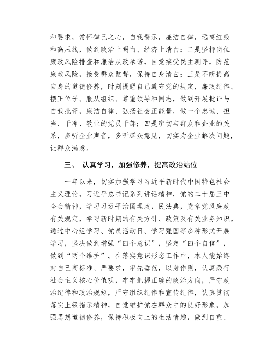领导干部2024年述职述廉报告2024年在区委、区政府及工信局党委的坚强领导下,根据党委分工,认真履职,积极开展工作,全区工业稳定恢复发展,主要经济指标不断转好,担保公司实现良性运行,切实履行全面从严治党主体责任,为xx工业经济高质量、跨越式发展提供了有力的政治保证。现将本人述职述廉落实情况汇报如下:履职尽责,全力做好分管工作主要工作:1.业务工作。截止2024年底,在保企业201户,在保金额31514万元(其中村级集体公司122户,金额12200万元)。积极开展业务创新,2024年6月份开设了授信担保贷款业务,授信担保39户、金额8915万元。努力协调降低企业融资成本,促成合作银行担保贷款利率由上年度8.28%降至7.8%,新合作的银行担保贷款利率为银行的基准利率;针对百福农权贷的村级集体企业,担保公司免收担保费,同时加强与农商行协商,将贷款利率由7.8%下调至7.56%,其他银行利率控制在5.64%/年。公司代偿风险逐步降低,累计代偿率3.58%,较上年度下降0.28%,年度代偿率为3.3%,2.追偿清收工作.继续采取“行政措施收缴一批、法律诉讼执行一批、公安介入震慑一批、资产处置盘活一批、网示失信促进一批”等措施开展清收追偿工作,在法院、公安、经开区、工信局、财政局等部门的大力支持下,特别是法院、公安、经开区主要领导亲自协商调度,营造了“措施得力、依序推进、合力攻坚”的清收氛围。2024年共诉讼企业及个人8起,涉及标的金额1254.8万元,其中诉前调解4家,涉及金额918.04万元;调解还款到账26.09万元,预计12月底有10-20万元左右到账;申请执行判决生效案件3起,涉及金额1160.21万元;清收到账金额756.6万元。3.业务创新工作。开展“授信担保贷款”业务,授信担保两年期限,采取一次授信、两年使用的模式。联合农商行开设“百福农权贷”业务,为全区137家村级集体经济企业提供贷款担保,对乡村振兴涉农担保100万元以下的业务,采取一次授信担保、分期使用,免抵押、免收费,到目前为止,共投放资金5785.4万元,为财政节约利息支付约300余万元。4.乡村振兴工作。做好巩固脱贫攻坚成果与乡村振兴有效衔接方面工作,进一步巩固脱贫攻坚成果,加强基层党建工作,同时配合村两委化解矛盾纠纷。5.其它工作。根据局党组的工作安排,对未改制企业有关材料数据整理并向区政府申报改制申请。二、加强德性教育,做到廉洁自律通过学习习近平总书记系列讲话精神,诵读红色家书、党章、廉政纪律等有关规定,一是认真学习《廉政准则》和各项廉洁自律规定,自觉按照《廉政准则》的相关规定和要求,常怀律已之心,自我警示,廉洁自律,远离红线和高压线,做到政治上明白、经济上清白;二是坚持岗位廉政风险排查和廉洁从政承诺,自觉接受民主测评,防范廉政风险,接受群众监督,保持自身清白;三是不断提高自身的道德修养,时刻提醒自己遵守党的规定,廉政纪律、摆正位子、服从组织、尊重领导和同志,做到开展批评与自我批评,廉洁自律、弘扬社会正能量,做一个忠诚、担当、干净、敬业的党员干部;四是密切与群众和企业的关系,多听企业声音,多听群众意见,切实为企业解决问题,让群众满意。三、认真学习,加强修养,提高政治站位一年以来,切实加强学习习近平新时代中国特色社会主义理论,习近平总书记系列讲话精神,党的二十届三中全会精神,学习习近平治国理政,民法典,党章党风廉政有关规定,学习新时期的有关方针、政策及有关业务知识。通过中心组学习、党员活动日、学习强国等多种形式开展学习,坚决做到增强“四个意识”,坚定“四个自信”,做到“两个维护”。在落实意识形态工作中,本人能始终对自己高标准、严要求,率先垂范,以身作则,认真践行社会主义核心价值观,牢牢把握正确的政治方向,严守政治纪律和政治规矩,严守组织纪律和宣传纪律,认真贯彻落实上级指示精神,自觉维护党在群众中的良好形象。加强思想道德修养,保持积极向上的生活情趣,做到自重、自省、自警、自厉,自觉抵制拜金主义、享乐主义、极端个人主义的侵蚀。四、存在的问题及今后努力方向对新的业务知识学习不够,对新的业务不能充分掌握,创新性开展工作还有很大差距,向领导提出创新建设...