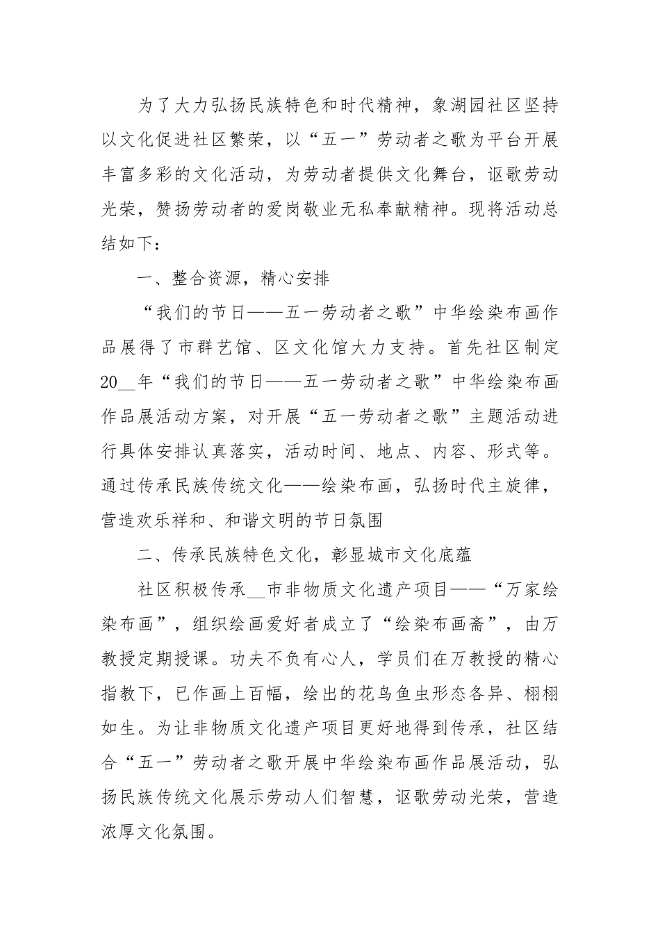 五一劳动节活动主题方案总结【一】在“五、一”国际劳动节来临之际,我校通过开展以“红领巾爱劳动”为主题的系列活动,让同学们了解“劳动节”的由来,了解我国不同时代的劳模风采,将“劳动最光荣”这个主题思想转化到我们每个少先队员的实际行动中,通过在学校、家庭、社区三个层面参与不同类型的劳动,培养少先队员积极劳动的热情,养成爱劳动的好习惯,并能珍惜他人的劳动成果。现将活动总结如下各班开展以劳动最光荣的主题班会。有能力的同学“以劳动者是最光荣的”为主题拍摄在节假日期间仍然坚持在工作岗位上的叔叔阿姨的照片(如:公交车司机、执勤的交警叔叔等)。放假期间与爸爸妈妈一起对自己的住所进行一次彻底的大扫除;知道“谁知盘中餐,粒粒皆辛苦”的含义,并能做到我的餐桌上没有一粒剩饭(菜);学会自己穿衣服;学会自己整理书包;能帮爸爸妈妈做一件力所能及的家务事。清理自己的“小天地”(铺床、叠被子、整理书桌、打扫自己的房间等);帮爸爸妈妈做一件力所能及的家务事;做两件好事,帮助身边遇到困难的人。围绕“我劳动,我光荣;我创造,我幸福”主题,通过查找、阅读有关宣扬劳动美德、赞美人民劳动成果等内容的文章,或发生在自己身边的有关热爱劳动的事例,把自己的感受写下来。体验劳动的甘苦。五一劳动节活动主题方案总结【二】为了大力弘扬民族特色和时代精神,象湖园社区坚持以文化促进社区繁荣,以“五一”劳动者之歌为平台开展丰富多彩的文化活动,为劳动者提供文化舞台,讴歌劳动光荣,赞扬劳动者的爱岗敬业无私奉献精神。现将活动总结如下:一、整合资源,精心安排“我们的节日——五一劳动者之歌”中华绘染布画作品展得了市群艺馆、区文化馆大力支持。首先社区制定20__年“我们的节日——五一劳动者之歌”中华绘染布画作品展活动方案,对开展“五一劳动者之歌”主题活动进行具体安排认真落实,活动时间、地点、内容、形式等。通过传承民族传统文化——绘染布画,弘扬时代主旋律,营造欢乐祥和、和谐文明的节日氛围二、传承民族特色文化,彰显城市文化底蕴社区积极传承__市非物质文化遗产项目——“万家绘染布画”,组织绘画爱好者成立了“绘染布画斋”,由万教授定期授课。功夫不负有心人,学员们在万教授的精心指教下,已作画上百幅,绘出的花鸟鱼虫形态各异、栩栩如生。为让非物质文化遗产项目更好地得到传承,社区结合“五一”劳动者之歌开展中华绘染布画作品展活动,弘扬民族传统文化展示劳动人们智慧,讴歌劳动光荣,营造浓厚文化氛围。三、扎实开展,成效显著在绘染作品展演展示活动中,近百幅南昌市非物质文化遗产——绘染布画作品展出吸引800余名观众纷纷驻足欣赏,让观众零距离领略民族传统文化的魅力。社区文化艺术团精湛文艺节目,结合非物质文化遗产传人——万阳智携四名学员现场演示绘染布画制作流程。20余道工序全靠手工操作让观众惊叹不已,其中“洗画”展示更是夺人眼球。通过活动,进一步增强了社会公众保护文化遗产的意识,使非物质文化遗产保护融入居民群众的日常生活,营造了让非物质文化遗产走进百姓日常生活、惠及于民的浓郁文化氛围。五一劳动节活动主题方案总结【三】4月30日下午,我系组织了大二的党员和大一的青年志愿者到社区慰问老人,出劳动节黑板报和打扫卫生。活动中,我们本着服务社会、奉献爱心的宗旨,为社区居民带去我们节日的问候。青年志愿者们有的认真地在社区黑板报栏上书写着对居民们的热情祝福,有的打扫社区的卫生。尽管当时天气炎热,火辣辣的太阳烤着大家,但同学们任劳任怨,没有一个人叫苦喊累的。还有的同学去慰问了社区的孤寡老人。由于语言不好沟通,青年志愿者们加上一切能想到的手势来和老人沟通,问候了他们后,大家一起与老人合照相片。老人们觉的很开心,他们还说我们就是在为人民服务,这说明我们的活动达到了目的,在这次活动中大家发扬了雷锋不怕累,不怕脏的精神,把为人民服务作为自己的宗旨,从劳动中获得快乐。五一劳动节又为我们提供了一次发扬雷锋精神,做好事的机会。时间是短暂的,生命也同样如此。做好事不难,难得是一辈子做好事。我们希望全体同学在以后的日子中,...