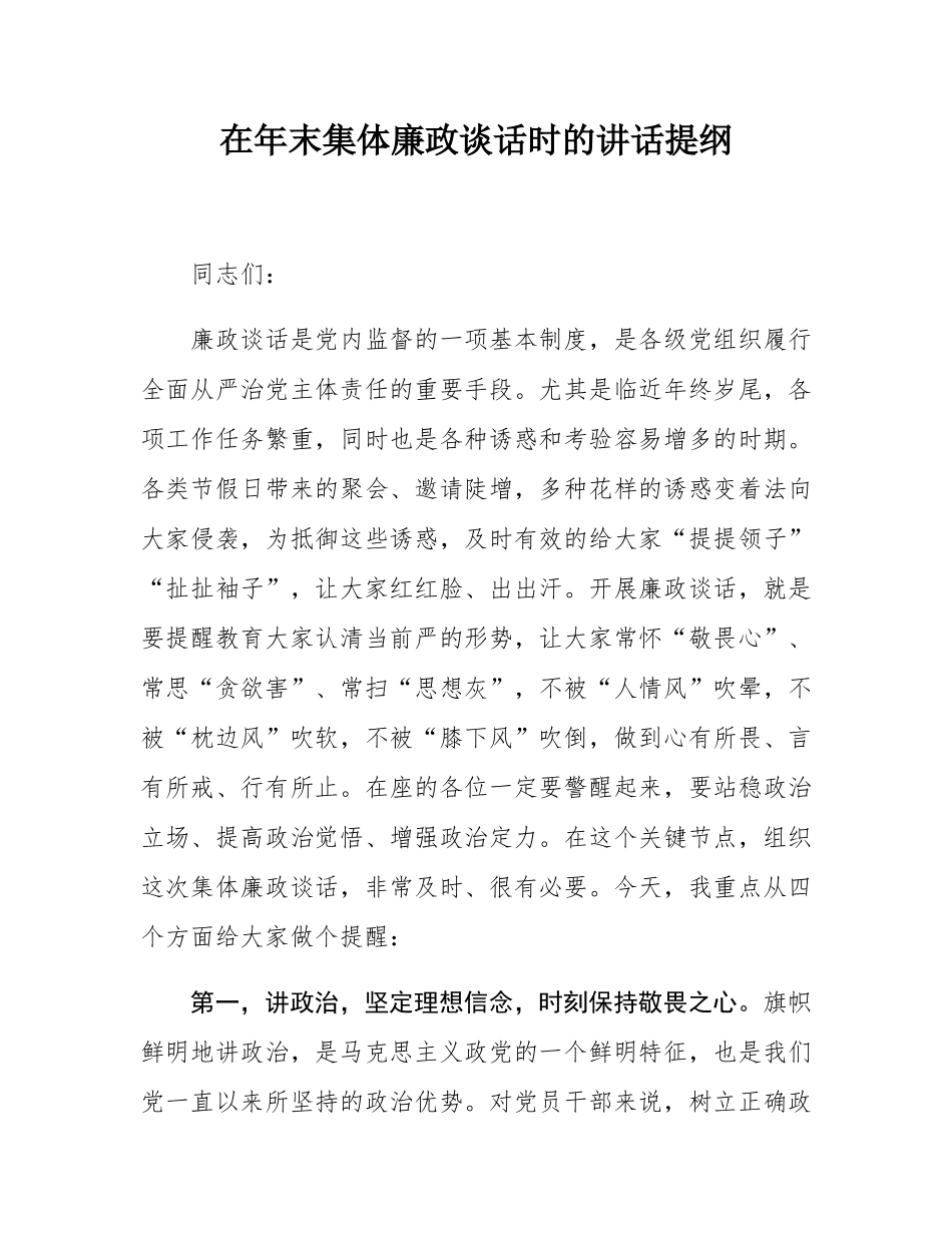 在年末集体廉政谈话时的讲话提纲同志们:廉政谈话是党内监督的一项基本制度,是各级党组织履行全面从严治党主体责任的重要手段。尤其是临近年终岁尾,各项工作任务繁重,同时也是各种诱惑和考验容易增多的时期。各类节假日带来的聚会、邀请陡增,多种花样的诱惑变着法向大家侵袭,为抵御这些诱惑,及时有效的给大家“提提领子”“扯扯袖子”,让大家红红脸、出出汗。开展廉政谈话,就是要提醒教育大家认清当前严的形势,让大家常怀“敬畏心”、常思“贪欲害”、常扫“思想灰”,不被“人情风”吹晕,不被“枕边风”吹软,不被“膝下风”吹倒,做到心有所畏、言有所戒、行有所止。在座的各位一定要警醒起来,要站稳政治立场、提高政治觉悟、增强政治定力。在这个关键节点,组织这次集体廉政谈话,非常及时、很有必要。今天,我重点从四个方面给大家做个提醒:第一,讲政治,坚定理想信念,时刻保持敬畏之心。旗帜鲜明地讲政治,是马克思主义政党的一个鲜明特征,也是我们党一直以来所坚持的政治优势。对党员干部来说,树立正确政绩观,首要前提就是要旗帜鲜明“讲政治”,把“讲政治”贯穿我们工作的全过程和各方面,真正做到政治过硬。一是胸怀“国之大者”。不断提高政治站位,坚定理想信念、铸牢对党忠诚、站稳人民立场,深刻领悟“政治三力”要求,坚定拥护“两个确立”、坚决做到“两个维护”,始终在思想上政治上行动上同以同志为核心的党中央保持高度一致,树牢全局意识、大局观念,努力提高工作预见性和主动性,使讲政治从外部要求转化为内在主动。二是坚持求真务实。切实强化政治担当,紧紧围绕学习贯彻党的二十大、二十届三中全会精神,全面落实党中央及省委、市委的决策部署,积极推动各项工作安排落到实处、取得实效,认真做好本职工作,多做打基础、利长远、出实效、创实绩的事,抓好闭环推进,突出协同联动,注重赋能一线,持续推动进一步全面深化改革走深走实、各项工作做优做强,奋力在担当实干中践行正确政绩观。三是站稳人民立场。永葆为民初心,严守政治纪律,筑牢思想防线,将初心使命内化于心、外化于行,以实际行动为党和人民的事业不懈奋斗。要做到老百姓关心什么,期盼什么,改革就要抓住什么、推进什么,广大党员干部要始终把实现好、维护好、发展好最广大人民根本利益作为全面深化改革的出发点和落脚点,把服务视角向人民群众聚焦,继续围绕群众关心的就业增收、入学就医、托幼养老等急难愁盼问题,多一些雪中送炭的实事、少一些形式主义的虚招,让人民群众有更多获得感、幸福感和安全感。第二,讲担当,敢于攻坚克难,时刻保持进取之心。中国式现代化是全体人民的共同事业,需要包括党员干部在内的全体人民接续奋斗方能实现。当下,个别干部出现了心态“佛系”、状态“躺平”等消极行为,这与党的优良传统和作风建设要求格格不入。新时代党员干部当保持进取之心和拼搏之志,在其位、谋其政,激发“想干事”的自觉,增强“能干事”的本领,提高“干成事”的质效,多到急难险重的岗位建功立业,不惧风雨、勇挑重担、倾情奉献。一是找准方向。坚持以人民为中心是党的根本宗旨所在,也是改革所必须坚持的价值取向。广大党员干部必须始终站稳群众立场,把为民服务融入日常,把为民办实事体现在经常。主动到问题最多、情况最复杂的地方倾听真实想法,向人民群众问计寻策,推动各领域各方面改革举措同向发力、形成合力,真正把改革的实效写到人民的心坎里、写在群众的笑脸上。二是找对焦点。随着改革进入攻坚期和深水区,遇到的阻力越来越大,面对的暗礁、潜流、漩涡越来越多。要善于抓住主要矛盾和矛盾的主要方面,明确优先序、把握时度效,正确处理“立”与“破”的关系,用改革“关键招”激活发展“新动能”。坚持问题导向和目标导向相统一、试点先行和全面推进相促进,敢于打破“惯例”、收住“惯性”,聚焦发展所需、基层所盼、民心所向,把更多“问题清单”列入“改革清单”,谋划一批“小切口、大纵深”的改革举措,以解题实效提升改革实效。三是找清要求。面对全面深化改革中的新目标、新任务、新举措,要始终保持抓工作的韧劲、强化干事业的拼劲,以敢...