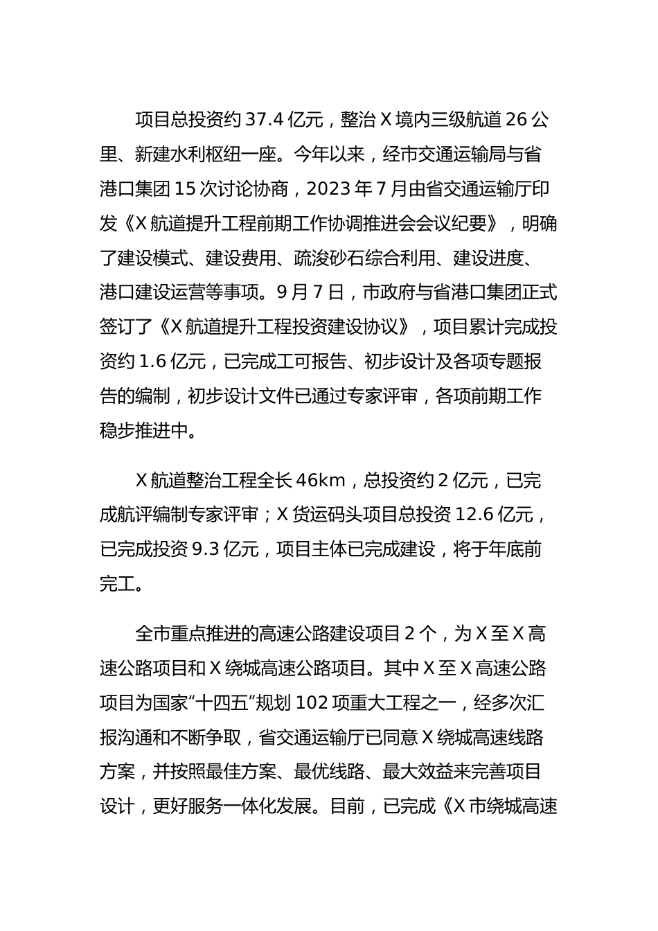 市交通运输局2023年工作总结暨2024年工作安排2023年,是贯彻落实党的XX大精神开局之年,是实施“十四五”规划和交通强市建设关键之年,X市交通运输局坚持以习近平新时代中国特色社会主义思想为指引,在市委、市政府的坚强领导和省交通运输厅的正确指导下,深入学习贯彻习近平总书记考察X重要讲话精神,切实把总书记的殷殷嘱托转化为做好工作的强大动力,不负重托勇担当、不负使命善作为,坚定不移加快推动交通运输高质量发展,为全面建设社会主义现代化X贡献力量。一、2023年工作2023年以来,X市交通运输局全面学习贯彻党的XX大精神和习近平新时代中国特色社会主义思想,按照全省交通运输工作会议部署和交通强市建设要求,聚焦“五新”战略行动,聚力营商环境优化,聚能城市客运服务质量提升,以“走在前、勇争先、善作为”的奋进姿态真抓实干,以只争朝夕、时不我待的精气神抢抓机遇,全市交通运输工作稳中有进。1、掐准时间点,项目建设增强“带动力”紧抓全省水运发展黄金机遇期,把准时间节点有序推进水运项目建设。2023年全市重点水运建设项目3个,项目总投资约52亿元。其中X航道提升工程为全省重点水运项目,项目总投资约37.4亿元,整治X境内三级航道26公里、新建水利枢纽一座。今年以来,经市交通运输局与省港口集团15次讨论协商,2023年7月由省交通运输厅印发《X航道提升工程前期工作协调推进会会议纪要》,明确了建设模式、建设费用、疏浚砂石综合利用、建设进度、港口建设运营等事项。9月7日,市政府与省港口集团正式签订了《X航道提升工程投资建设协议》,项目累计完成投资约1.6亿元,已完成工可报告、初步设计及各项专题报告的编制,初步设计文件已通过专家评审,各项前期工作稳步推进中。X航道整治工程全长46km,总投资约2亿元,已完成航评编制专家评审;X货运码头项目总投资12.6亿元,已完成投资9.3亿元,项目主体已完成建设,将于年底前完工。全市重点推进的高速公路建设项目2个,为X至X高速公路项目和X绕城高速公路项目。其中X至X高速公路项目为国家“十四五”规划102项重大工程之一,经多次汇报沟通和不断争取,省交通运输厅已同意X绕城高速线路方案,并按照最佳方案、最优线路、最大效益来完善项目设计,更好服务一体化发展。目前,已完成《X市绕城高速公路、高速公路X段路线规划报告》编制,并通过省级专家咨询会。按现行规划方案,景上高速X段起于董家桥村,终于X区X镇,全长46.77公里,拟设4处出口互通,总投资约61.82亿元,将于2027年开工建设。X绕城高速公路项目起于X镇接杭瑞高速,终于X镇接济广高速,全长约42公里,拟设3处出口互通,总投资约62亿元,各项前期工作正在有序推进,将于2025年开工建设。两条高速的建设将显著提升X市与周边省市的联系。2、筑牢支撑点,安全为先强化“保障力”坚持以“交通运输安全生产网格化服务管理”、“重大隐患排查整治和重大风险防范化解专项行动”为主线,牢固树立“人民至上、生命至上”意识,坚持每季度定期召开安全生产工作形势分析会和局安委会全体会议,常态化推进铁路沿线安全环境治理和燃气运输安全整治。创新性开展“双源头”治超,协调推动五市联合治超专项行动,与X等县(市、区)完善了联合治超机制,先后印发了《X市货物运输车辆超限超载专项整治方案》、《X市货物运输车辆超限超载治理工作问责办法(试行)》,超限超载治理能力显著提升。2023年10月,全市超限超载率由2022年的3.43%降至的0.36%,治超排名由全省垫底提升至全省第4名。聚焦重点企业、重点人群、重点车辆,建立了企业负责人、安全管理人员、一线驾驶员约谈和谈心谈话制度,持续开展交通运输“两类人员”考试、“两客一危”企业负责人专题培训,持续推动企业安全生产主体责任落实。今年以来,明确一级网格长5人、二级网格长15人、三级网格长634人,组织安全培训6次、观看学习《生命重于泰山——学习习近平总书记关于安全生产重要论述》电视专题片20余场次。同时,扎实开展安全隐患排查整改,排查重大风险源37处,排查一般安全隐患162处,完成整改158处,印发检查通报5份,核查注销不合普货要求企业260家、个体户1143家,注销车辆1780辆,...
