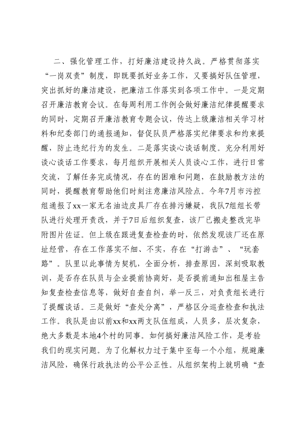 廉洁从政讨论交流发言非常荣幸能参加今天廉洁从政研讨交流会,并且作第一位发言,不足之处请大家批评指正。从21年部队转业到均禾街已近2年时间,主要从事了执法办内勤工作,参加了区委巡视巡查,深入隔离酒店和抗击疫情网格一线,至今年3月份由我临时负责执法办xxx。虽然来街道工作的时间不长,但我都坚持用心干好每一个岗位,按照街党工委关于廉洁从政工作的要求,把纪律和规矩挺在法律前面,严格落实主体责任,以廉洁从政、作风建设、制度建设为着力点,切实筑牢了廉洁思想意识和廉洁工作标准。一、落实主体责任,筑牢思想防线。始终以党的二十大精神为指导,坚定不移把党的政治建设摆在首位,坚决做到“两个维护”,牢固树立“四个意识”,不断增强“四个自信”,形成层层抓落实的工作格局,紧扣街重点工作和执法办二分队中心工作把廉洁建设与业务工作深度融合、同步推进,时刻绷紧廉洁这根弦,筑牢防腐拒变的思想防线。强化对队里的党章党规党纪学习深化对习近平新时代中国特色社会主义思想的学习,筑牢廉洁思想防线。同步落实层级管理,与安监和环保两个线口负责人谈心谈话,落实咬耳扯袖,及时自查自己,纠正存在的“四风”问题不廉洁履职、不守纪行为等问题,切实防止小问题演变为大问题把廉洁落实到每一个工作岗位。二、强化管理工作,打好廉洁建设持久战。严格贯彻落实“一岗双责”制度,即既要抓好业务工作,又要搞好队伍管理,突出抓好的廉洁建设,把廉洁工作落实到各项工作中。一是定期召开廉洁教育会议。在每周利用工作例会做好廉洁纪律提醒要求的同时,定期召开廉洁教育专题会议,传达上级廉洁相关学习材料和纪委部门的通报通知,督促队员严格落实纪律要求和约束提醒,防止违纪行为的发生。二是落实谈心谈话制度。充分利用好谈心谈话工作要求,每月组织开展相关人员谈心工作,进行日常交流,了解任务完成情况,存在的困难和问题,在鼓励教方法的同时,提醒教育帮助他们时刻注意廉洁风险点。今年7月市污控组通报了xx一家无名油边皮具厂存在排污嫌疑,我队7组组长带队进行处理开责改,并于7日后组织复查,该厂已搬走整改完毕附图片佐证。但上级在跟进复查检查的时,依然发现该厂还在原址经营,存在工作落实不细、不实,存在“打游击”、“玩套路”。队里以此事情为契机,全面分析,排查原因,深刻吸取教训,是否存在队员与企业提前协商好,是否提前通知出租屋主告知复查检查信息等,做好自查自纠,举一反三,对负责组长进行了提醒谈话。三是做好“查处分离”,严格区分巡查检查和执法工作。我队是由以前xx和xx两支队伍组成,人员多,层次复杂,绝大多数是本地4个村的同事。如何搞好廉洁风险工作,是考验我们的现实问题。为了化解权力过于集中至每一个小组,规避廉洁风险,确保行政执法的公平公正性。从组织架构上就明确“查处分离”工作要求,行政监督执法过程中,始终要求参与辅助监督巡查的工作人员,不得从事辅助行政执法立案等执法环节。结合辖内实际,成立了8组外巡小组,主要任务是做好日常巡查检查工作,发现屡教不改,多次提醒不听劝的,提供执法线索进行移交;成立两个综合执法辅助小组,专门负责6个线口执法跟进辅助工作,含专门的内勤队伍负责材料收集和处理,各自分工,各自业务不牵扯,从而形成内外联动、各部交叉的工作闭环的工作模式;另外各组的队员经过以责定岗,做到能者上、平者下、劣者汰,规避各种层级人际关系风险。截至8月23日,我街安全生产委托执法处罚立案数累xxx,严格按照规定的程序要求和法条开展;严格上级职能局通知指向检查处罚;严格找到街道工作开展导向进行。三、强化自身廉洁纪律要求。习近平总书记指出,自我革命关键要有正视问题的自觉和刀刃向内的勇气。这就要求我们要主动查找、勇于改正自身的缺点和不足。要善于自省。始终保持身在“聚光灯下”“放大镜下”的警醒,每日三省吾身。心有所畏方能言有所戒、行有所止。下步我将从身边人、身边事汲取深刻教训,坚决守住底线、不踩红线、不碰高压线,坚决同各种不正之风和腐败现象作斗争,不断提高自我净化的能力。要勇于革新要慎于言行,做到慎独、慎微,谨慎对待和正确处置每一...