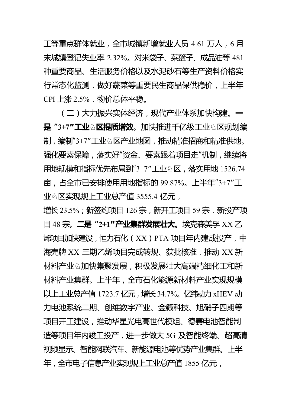 关于XX市2022年上半年国民经济和社会发展计划执行情况的报告今年以来,在市委的坚强领导下,在市人大、市政协的监督支持下,全市上下深入学习贯彻习近平新时代中国特色社会主义思想和习近平总书记对广东系列重要讲话、重要指示精神,深入落实省委“1+1+9”工作部署,认真执行市十三届人大一次会议审议通过的市政府工作报告及2022年国民经济和社会发展计划,坚持稳字当头、稳中求进,坚决落实“疫情要防住、经济要稳住、发展要安全”重要要求,高效统筹疫情防控和经济社会发展,沉着应对风险挑战,攻坚克难经济社会保持平稳健康发展。一、上半年国民经济和社会发展计划执行情况(一)扎实做好“双统筹”,经济大盘持续稳固。一是常态化疫情防控有力有序。坚持“外防输入、内防反弹”总策略、“动态清零”总方针,织密织牢常态化疫情防控网,坚决果断应对国内聚集性本土疫情冲击,今年以来及时妥善处置“0131”仲恺惠东疫情、“0302”惠东疫情等本土疫情,实现疫情零外溢、一线工作人员零感染、临床病例零死亡的目标。严丝合缝做好重点环节和场所防控,抓好外防输入的航空、陆路、水运口岸和人物同防“四个方向”,注重八类特殊场所和学校、企业、建筑工地“8+3”重点场所疫情防控,坚决防止发生聚集性疫情。持续推进疫苗接种,截至6月底,累计接种678.43万人,全人群覆盖率110.95%,不断筑牢疫情防控屏障。二是稳经济政策效果不断显现。认真贯彻落实国家和省扎实稳住经济的一揽子政策措施,制定我市“稳经济127条”,以及“促进服务业恢复发展19条”“支持中小企业和个体工商户23条”“促进工业经济平稳增长24条”等一系列政策举措,千方百计稳住市场主体,以超常规力度和举措推动经济企稳回升。截至6月底,全市新增办理增值税留抵退税106.11亿元、落实“六税两费”减免税费11.99亿元、落实制造业中小微企业延缓缴纳税费37.3亿元。市场主体总量稳中有升,截至6月底全市实有市场主体81.35万户、增长10.2%,其中企业27.79万户、增长15.7%。三是经济增速稳居全省前列。加强宏观政策逆周期调节,强化政策协调落实和预期引导,经济保持较好发展态势。上半年,全市地区生产总值2407亿元,增长3.6%,增速全省第1。规上工业增加值增长9.1%,增速全省第1;工业投资645亿元、增长51.7%,总量和增速均为全省第1。“三驾马车”协调性增强,固定资产投资增长10.9%、增速全省第2,193个市重点项目完成投资568.3亿元,完成年度投资计划56.7%;社会消费品零售总额增长2.2%,增速全省第3;外贸进出口总额增长10%,增速全省第9。四是就业和物价总体稳定。落实稳岗援企政策,延续实施阶段性降低失业保险、工伤保险费率政策及失业保险浮动费率政策,全年可为企业减负6.42亿元;延续实施失业保险稳岗返还政策,截至6月底发放稳岗补贴9200万元。全力落实就业优先政策,稳定高校毕业生、农民工等重点群体就业,全市城镇新增就业人员4.61万人,6月末城镇登记失业率2.32%。对米袋子、菜篮子、成品油等481种重要商品、生活服务价格以及水泥砂石等生产资料价格实行常态化监测,做好蔬菜等重要民生商品保供稳价,上半年CPI上涨2.5%,物价总体平稳。(二)大力振兴实体经济,现代产业体系加快构建。一是“3+7”工业♘区提质增效。加快推进千亿级工业♘区规划编制,编制“3+7”工业♘区产业地图,推动精准招商和精准供地。强化要素保障,落实好“资金、要素跟着项目走”机制,继续将用地规模和指标优先布局到“3+7”工业♘区,落实用地1526.74亩,占全市已安排使用用地指标的99.87%。上半年“3+7”工业♘区实现规上工业总产值3555.4亿元,增长23.5%;新签约项目126宗,新开工项目59宗,新投产项目48宗。二是“2+1”产业集群发展壮大。埃克森美孚XX乙烯项目加快建设,恒力石化(XX)PTA项目年内建成投产,中海壳牌XX三期乙烯项目完成转规、获批核准,推动XX新材料产业♘加快集聚发展,积极发展壮大高端精细化工和新材料产业集群。上半年,全市石化能源新材料产业实现规模以上工业总产值1723.7亿元,增长34.7%。亿纬动力xHEV动力电池系统二期、创维数字产业、金籁科技、旭硝子四期等项目开工建设,推动华星光电高世代...