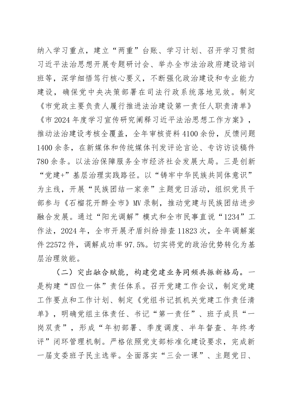 市司法关于以高质量党建引领高水平法治工作情况的报告去年以来,市司法局党组坚持以习近平新时代中国特色社会主义思想为指引,深入学习贯彻习近平总书记关于党的建设“九个坚持”重要论述,对标落实总书记“7·9”重要讲话精神及“7·29”重要批示要求,坚持把政治建设作为“首位工程”,以实施机关党建“三年强基”工程为总牵引,创新构建“铸魂、强基、融合”三维体系,着力破解“两张皮”顽疾,推动形成“党旗红”引领“法治蓝”的生动实践。一、主要工作情况(一)突出凝心铸魂,以新思想引领党建工作新航程。一是深学笃行“两个确立”核心要义。始终将学习贯彻习近平新时代中国特色社会主义思想作为首要政治任务,通过党组理论学习中心组领学、“每周一学”促学、读书班深学、警示教育助学等方式,推动学习入脑入心。2024年,累计开展党组理论学习中心组学习26次、专题研讨13次,组织党纪学习教育读书班1期,观看警示教育片6次,教育引导党员干部深刻领悟“两个确立”的决定性意义,增强“四个意识”、坚定“四个自信”、做到“两个维护”。二是突出政治统领筑牢司法行政根基。严格执行“第一议题”制度,将习近平总书记关于党的建设重要思想、习近平总书记关于全面依法治国的重要论述、习近平法治思想以及习近平总书记视察全省重要讲话指示精神纳入学习重点,建立“两重”台账、学习计划、召开学习贯彻习近平法治思想开展专题研讨会、举办全市法治政府建设培训班等,深学细悟笃行核心要义,不断强化政治建设和专业能力建设,确保党中央决策部署在司法行政系统落地见效。制定《市党政主要负责人履行推进法治建设第一责任人职责清单》《市2024年度学习宣传研究阐释习近平法治思想工作方案》,推动法治建设考核全覆盖,全年审核资料4100余份,反馈问题1400余条,在新媒体和传统媒体刊发评论言论、专访访谈稿件780余条。以法治保障服务全市经济社会发展大局。三是创新“党建+”基层治理实践路径。以“铸牢中华民族共同体意识”为主线,开展“民族团结一家亲”主题党日活动,组织党员干部参与《石榴花开醉全市》MV录制,推动党建与民族团结进步融合发展。通过“阳光调解”模式和全市民事直说“1234”工作法,2024年,全市开展矛盾纠纷排查11823次,全年调解案件22572件,调解成功率97.5%。切实将党的政治优势转化为基层治理效能。(二)突出融合赋能,构建党建业务同频共振新格局。一是构建“四位一体”责任体系。召开党建工作会议,制定党建工作要点和工作计划、制定《党组书记抓机关党建工作责任清单》,明确党组主体责任、书记“第一责任”、班子成员“一岗双责”,形成“年初部署、季度调度、半年督查、年终考评”闭环管理机制。严格依照党支部标准化建设要求,完成新一届支委班子民主选举。全面落实“三会一课”、主题党日、组织生活会及“一报告两评议”等党内制度,2024年支部各项工作达标率100%,获评首批“市直机关创建模范机关先进单位”。二是打造“党建+法治”特色品牌。确定“以党建为引领,全面提升法治建设水平”为党组织书记项目,着力在抓落实、破难题、创载体、见实效上下功夫。打造“党建+法治”支部党建品牌,推动立法、执法、司法、守法、普法全链条融入党建元素。优化法律援助、公证服务、司法鉴定等工作,围绕优化法治化营商环境开展工作。2024年,共受理援助案件2664件、公证件2346件、司法鉴定案件1119件,组织律师队伍开展“法治体检”138余次,助力乡村振兴。三是实施“强基赋能”三大工程。建立“五学”机制(自学+领学+交流学+辅导学+实地学),编印《习近平法治思想学习手册》,举办全市司法行政系统新闻宣传、公文写作能力提升培训班,选派2名党员参加市直机关诵读比赛获第三名。建立“两重”台账(重要讲话、重要思想)并实施司法行政系统“月调度”制度,推动76项重点任务落实落细。(三)突出提质增效,实施“四维工程”锻造坚强战斗堡垒。一是“铸魂工程”深化政治教育。结合“铸忠诚警魂”活动,深化党纪学习教育,开展“学条例、明规矩、守纪律”专题活动,组织全体干部职工赴武都监狱警示教育1次。规范党员管理,对不符合程序发展的1名党员...