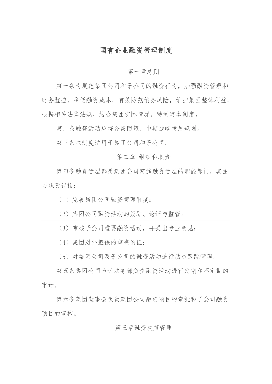 国有企业融资管理制度第一章总则第一条为规范集团公司和子公司的融资行为,加强融资管理和财务监控,降低融资成本,有效防范债务风险,维护集团整体利益,根据相关法律法规,结合集团实际情况,特制定本制度。第二条融资活动应符合集团短、中期战略发展规划。第三条本制度适用于集团公司和子公司。第二章组织和职责第四条融资管理部是集团公司实施融资管理的职能部门,其主要职责包括:(1)完善集团公司融资管理制度:(2)集团公司融资活动的策划、论证与监管;(3)审核子公司重要融资活动,并提出专业意见;(4)集团对外担保的审查论证;(5)对集团公司及子公司的融资活动进行动态跟踪管理。第五条集团公司审计法务部负责融资活动进行定期和不定期的审计。第六条集团董事会负责集团公司融资项目的审批和子公司融资项目的审核。第三章融资决策管理第七条集团融资管理实行审核制、审批制和备案制相结合的方式。第八条实行审核制的融资活动包括:(1)子公司权益性融盗:(2)子公司年度融资计划以外的债务性融资;(3)子公司债务性融资金额在万元以上;(4)子公司之间的互保活动:(5)子公司对外担保;(6)需审核的子公司投资项目的融资方案。第九条上述范围以外的子公司融资活动实行备案制。第十条融资活动审核和审批原则:(1)符合国家产业政策以及集团的长期发展规划:(2)法律手续完善;(3)上报资料齐全、真实、可靠;(4)与公司融资能力相适应。第十一条对于实行审核制的子公司融资活动,根据子公司融资项目审核流程,按照方案提出、审查论证、审议决策、审批实施四个步骤进行管理。第十二条方案提出。子公司的融资方案应包括以下资料:(1)融资款项的用途及用款项目背景情况;(2)用款与还款计划;(3)融资数量与债权人;(4)担保方式与内容:(5)其他需要说明的事项。第十三条审查论证。集团公司融资管理部在收到全部资料后,应组织有关人员审查基本情况,对方案的疑点、隐患提出质询,并提出建议。第十四条需审核的子公司投资项目的融资方案按《投资管理制度》相关规定,集团公司审核投资项目时一并审核融资方案。第十五条对于实行审批制的集团公司融资活动和集团公司为子公司提供的组保,根据集团公司融资活动审批流程,按照方案论证、审议决策、审批实施三个步骤进行管理。第十六条方案论证。融资管理部融资管理人员经过方案论证后提出融资方案,最分管副总。第十七条对于实行备案制的子公司融资活动,由子公司在实施后十五个工作日内向集团公司融资管理部提交备案材料存档,包括融资方案、合同、章程等。第四章融资过程管理第十八条集团内的融资管理实行融资、资金运用和监管相结合的原则。融资单位对触资活动指定融资活动执行人,做到责、权、利相对等,确保融资方案按计划实施。第十九条融资活动执行人应定期将资金运用状况向主管领导作汇报。第二十条集团公司融资管理部对子公司的融资活动进行跟踪检查,帮助解决各种实际问题,协调各方面的关系。第二十一条集团公司审计法务部视情况,定期或不定期对集团公司职能部门和子公司进行专项检查和审计,对违反本制度进行融资的行为和融资管理混乱的单位和责任人,提出处理意见或建议,报经集团公司领导批准后执行。第五章融资结果评价和融资责任第二十二条融资管理部对子公司融资结果进行评价。第二十三条对融资方案因决策失误或审查、把关不严,造成经济损失的,也应追究相关责任人的责任。第二十四条对融资资金因管理不善或用人不当致使资产流失、严重亏损或造成其它严重后果的,要追究相关责任人的责任。第二十五条对融资活动的主管领导、负责人或其它工作人员违反本规定、玩忽职守、滥用职权的要追究相关人员的行政及法律责任。第六章附则第二十六条本制度由集团公司融资管理部起草和修订,解释权归融资管理部。第二十七条本规定如有与相关法律、法规、规定相抵触的,应以相关法律、法规、规定为准。