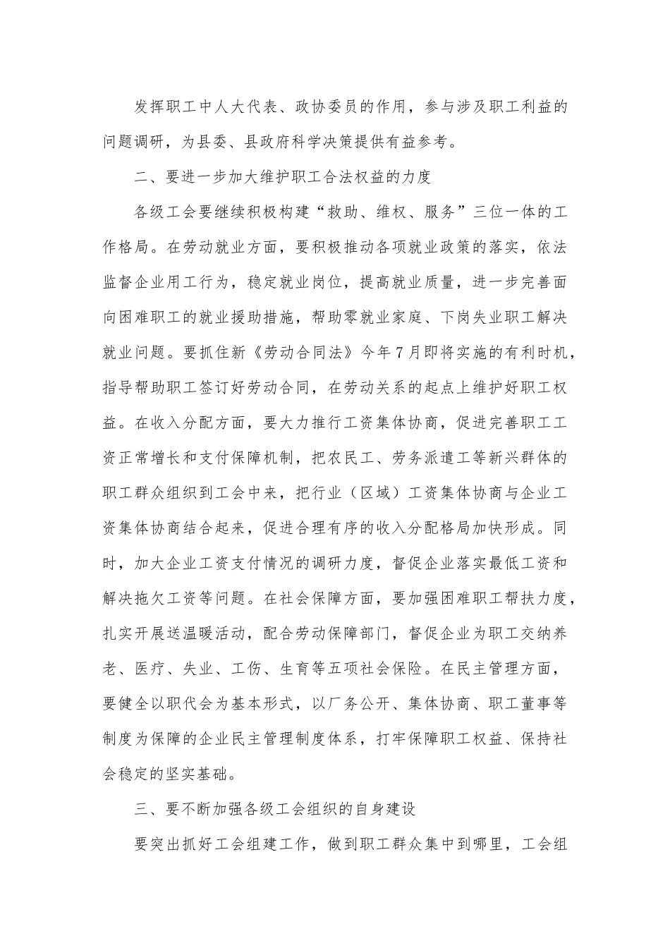 在县总工会2022年度工作会议上的讲话同志们:今天,县总工会在这里召开年度工作会议,刚才,*主席对2021年工作进行了回顾总结,对2022年工作任务作了具体安排。过去的一年,全县各级工会组织紧紧围绕县委、县政府中心工作,充分发挥工会组织群众工作的优势,认真履行职能,扎实推进各项工作,为我县经济社会发展作出了重要贡献。借此机会,我谨代表县委,向全县各级工会组织和工会工作者,向奋战在各条战线上的广大职工,表示衷心的感谢和崇高的敬意!下面,我就今年工作,讲三点意见,供同志们参考。一、要进一步引导职工在推动经济社会发展中建功立业当前,在国内经济下行、增速放慢、消费不旺、投资趋缓的不利因素影响下,我县各企业正经受着严峻的考验。光伏、风电等新特产业处于发展初期未成气候,棉纺、织造等传统产业转型升级还未能完全实现,财政经济压力和社会发展压力很大。各级工会组织要团结和动员广大职工,以业务大练兵、大比武和创建“工人先锋号”“巾帼示范岗”“青年文明号”等活动为载体,爱岗敬业、争当先进,以实际行动与企业风雨同舟、共克时艰。要引导职工立足岗位实际,开展技术革新、工艺改良,千方百计为企业节约成本、降低损耗,为发展循环经济、绿色经济献计献策,打造一批各具特色的技师创新工作室、班组创新工作室和职工创新工作室,不断提高企业的自主创新能力和应对风险能力。要引导职工积极参与全县经济社会事务的管理,充分发挥职工中人大代表、政协委员的作用,参与涉及职工利益的问题调研,为县委、县政府科学决策提供有益参考。二、要进一步加大维护职工合法权益的力度各级工会要继续积极构建“救助、维权、服务”三位一体的工作格局。在劳动就业方面,要积极推动各项就业政策的落实,依法监督企业用工行为,稳定就业岗位,提高就业质量,进一步完善面向困难职工的就业援助措施,帮助零就业家庭、下岗失业职工解决就业问题。要抓住新《劳动合同法》今年7月即将实施的有利时机,指导帮助职工签订好劳动合同,在劳动关系的起点上维护好职工权益。在收入分配方面,要大力推行工资集体协商,促进完善职工工资正常增长和支付保障机制,把农民工、劳务派遣工等新兴群体的职工群众组织到工会中来,把行业(区域)工资集体协商与企业工资集体协商结合起来,促进合理有序的收入分配格局加快形成。同时,加大企业工资支付情况的调研力度,督促企业落实最低工资和解决拖欠工资等问题。在社会保障方面,要加强困难职工帮扶力度,扎实开展送温暖活动,配合劳动保障部门,督促企业为职工交纳养老、医疗、失业、工伤、生育等五项社会保险。在民主管理方面,要健全以职代会为基本形式,以厂务公开、集体协商、职工董事等制度为保障的企业民主管理制度体系,打牢保障职工权益、保持社会稳定的坚实基础。三、要不断加强各级工会组织的自身建设要突出抓好工会组建工作,做到职工群众集中到哪里,工会组织就建设到哪里。要加强分类指导,不断完善基层工会组织的运行机制,改进活动方式,努力把各级工会建设成为组织职工建功立业、维护职工合法权益、丰富职工精神文化生活的“职工之家”。要加强工会干部作风建设,针对我县改制企业、破产企业包袱较重、历史遗留问题较多的的实际,多到生产经营困难多的企业去,多到困难职工比较集中的地方去,了解反映职工群众呼声和要求。要进一步增强创新意识,积极探索做好新时期工会工作的新途径、新方法,实现工会工作的创新与发展。同志们,县委对全县各级工会组织寄予厚望,衷心希望广大工会干部牢记县委的重托和群众的期望,团结动员全县广大职工,同心同德,克难奋进,为全县高质量发展作出新的更大的贡献!