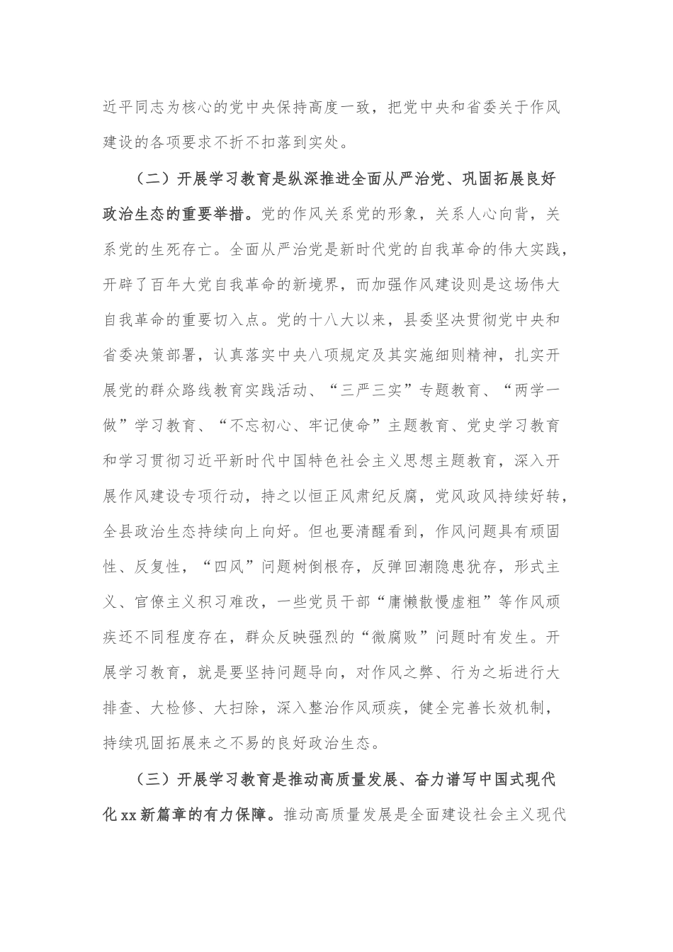 2025县委书记在全县深入贯彻学习教育动员部署会讲话2篇同志们:在深入开展学习贯彻习近平新时代中国特色社会主义思想主题教育之际,党中央决定在全国开展深入贯彻中央八项规定精神学习教育,充分彰显了以习近平同志为核心的党中央驰而不息推进作风建设的鲜明态度和坚定决心。2025年3月xx日,省委召开全省深入贯彻中央八项规定精神学习教育动员部署会,对学习教育进行了全面部署,提出了明确要求。全县各级党组织和广大党员干部要深入学习贯彻习近平总书记关于加强作风建设的重要论述和重要指示批示精神,全面落实中央和省委部署要求,扎实开展好学习教育,持续加固中央八项规定堤坝,以优良党风政风引领社风民风向上向善,为推动中国式现代化xx新实践开好局起好步提供坚强作风保障。下面,根据县委常委会研究的意见,我讲五个方面问题。一、提高政治站位,深刻认识开展学习教育的重大意义党的十八大以来,以习近平同志为核心的党中央从制定和落实中央八项规定开局破题,持之以恒正风肃纪,党风政风为之一新,社风民风持续向好。习近平总书记高度重视作风建设,发表一系列重要论述,作出一系列重要指示批示,为我们加强作风建设提供了根本遵循。我们要认真学习领会,切实把思想和行动统一到党中央决策部署和省委工作要求上来。(一)开展学习教育是捍卫“两个确立”、做到“两个维护”的实际行动。党的十八大以来,面对党面临的重大风险考验和党内存在的突出问题,以习近平同志为核心的党中央把制定执行中央八项规定作为全面从严治党的突破口,以“十年磨一剑”的定力推进作风建设,刹住了一些长期没有刹住的歪风,纠治了一些多年未除的顽瘴痼疾,解决了许多长期想解决而没有解决的难题,推动党和国家事业取得历史性成就、发生历史性变革。实践充分证明,中央八项规定不是五年、十年的规定,而是长期有效的铁规矩、硬杠杠;党中央作出的作风建设部署是完全正确的,得到了全党全国人民衷心拥护和支持。“两个确立”是新时代取得的最大政治成果、最重要历史经验、最客观实践结论,是推动党和国家事业取得历史性成就、发生历史性变革的决定性因素。捍卫“两个确立”、做到“两个维护”是具体的,不是抽象的,体现在坚决贯彻党中央决策部署的行动上,体现在履职尽责、做好本职工作的实效上,体现在党员、干部的日常言行上。开展学习教育,就是要引导全县上下深刻领悟“两个确立”的决定性意义,更加自觉增强“四个意识”、坚定“四个自信”、做到“两个维护”,在思想上政治上行动上同以习近平同志为核心的党中央保持高度一致,把党中央和省委关于作风建设的各项要求不折不扣落到实处。(二)开展学习教育是纵深推进全面从严治党、巩固拓展良好政治生态的重要举措。党的作风关系党的形象,关系人心向背,关系党的生死存亡。全面从严治党是新时代党的自我革命的伟大实践,开辟了百年大党自我革命的新境界,而加强作风建设则是这场伟大自我革命的重要切入点。党的十八大以来,县委坚决贯彻党中央和省委决策部署,认真落实中央八项规定及其实施细则精神,扎实开展党的群众路线教育实践活动、“三严三实”专题教育、“两学一做”学习教育、“不忘初心、牢记使命”主题教育、党史学习教育和学习贯彻习近平新时代中国特色社会主义思想主题教育,深入开展作风建设专项行动,持之以恒正风肃纪反腐,党风政风持续好转,全县政治生态持续向上向好。但也要清醒看到,作风问题具有顽固性、反复性,“四风”问题树倒根存,反弹回潮隐患犹存,形式主义、官僚主义积习难改,一些党员干部“庸懒散慢虚粗”等作风顽疾还不同程度存在,群众反映强烈的“微腐败”问题时有发生。开展学习教育,就是要坚持问题导向,对作风之弊、行为之垢进行大排查、大检修、大扫除,深入整治作风顽疾,健全完善长效机制,持续巩固拓展来之不易的良好政治生态。(三)开展学习教育是推动高质量发展、奋力谱写中国式现代化xx新篇章的有力保障。推动高质量发展是全面建设社会主义现代化国家的首要任务。习近平总书记来xx考察时,赋予xx“在高质量发展上继续走在前列”的重大使命。省委二十届五次全会提出“在高质量发展上继续走...