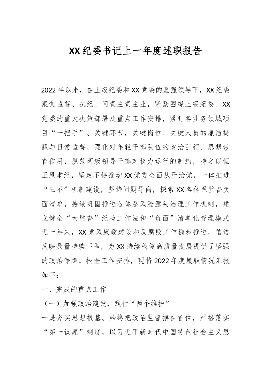 XX纪委书记上一年度述职报告2022年以来,在上级纪委和XX党委的坚强领导下,XX纪委聚焦监督、执纪、问责主责主业,紧紧围绕上级纪委、XX党委的重大决策部署及重点工作安排,紧盯各业务领域项目“一把手”、关键环节,关键岗位、关键人员的廉洁提醒与日常监督,强化对年轻干部队伍的政治引领、思想教育作用,规范两级领导干部对权力运行的制约,持之以恒正风肃纪,坚定不移推动XX党委全面从严治党,一体推进“三不”机制建设,坚持问题导向,探索XX各体系监督负面清单,持续巩固推进各体系风险源头治理工作机制,建立健全“大监督”纪检工作法和“负面”清单化管理模式近一年来,XX党风廉政建设和反腐败工作稳步推进,信访反映数量持续下降,为XX持续稳健高质量发展提供了坚强的政治保障。根据工作安排,现将2022年度履职情况汇报如下:一、完成的重点工作(一)加强政治建设,践行“两个维护”一是夯实思想根基。始终把政治监督摆在首位,严格落实“第一议题”制度,以习近平新时代中国特色社会主义思想武装头脑、指导实践、推动工作。通过党委中心组学习“三会一课”和其他会议将“第一议题”常态化,把学习融入日常、抓在经常。截至目前,党委中心组学习X次,三会一课X次,督促党员干部认真学习党的XX大精神和新修订的《中国共产党章程》,强化思想理论武装,站稳政治立场把准政治方向、增强政治定力,为履行职责打好思想政治基础。二是强化政治监督。协助XX党委抓好维护政治纪律和政治规矩、落实党中央和上级党委重大决策部署,开展XX“把方向、管大局、促落实”情况的全过程监督;制定“大监督”实施细则,推动粗放监督向各业务体系的精准监督转变。三是压紧压实责任。协助党委研究制定工作要点,签订责任书XX份,及时向党委提出管党治党的意见和建议X条,召开X次党风廉政和反腐败工作协调小组会议,研判党风廉政建设及反腐败工作形势。(二)强化问题导向,规范权力运行一是强化同级监督。参与修订“三重一大”决策制度,参与并监督“三重一大”决策事项X项;对班子成员逐一进行“画像”评价,认真开展政治生态分析,对X名领导班子开展廉洁提醒谈话。二是做实日常监督。紧盯权力运行中的风险和监督管理中的薄弱环节,主动预防、超前预防,切实将教育、“红脸出汗”提醒、监督工作做到前面,有效消减和防范风险。整合审计、巡察、职能监督资源,提升监督合力,2022年XX党委开展物资采购、工程分包、领导人员职务消费等专项监督X项,推动职能部门开展监督工作X项,发现管理类问题X项、整改落实问题X项,健全各类制度X项;严把干部任用廉洁关,出具党风廉政意见书和廉洁鉴定X份,开展任前廉谈话X人;为切实保障XX各项目部廉洁高效运行,结合实际制定《廉洁项目建设计划》,围绕“六建四严”,通过“线上+线下”的方式组织对X个项目开展廉洁项目专项检查。三是规范巡察监督。按照XX党委巡察工作安排,对X个项目党支部开展巡察工作,开展谈话X人次,发现问题X项,督导全部完成整改;按照上级党委巡察“成效评估年”相关要求,研究制定“成效评估年”活动方案,对XXX个项目党支部开展巡察整改评估工作,扎实推动巡察整改工作落实。四是深化“专项整治”工作从严从实开展“利益输送、设租寻租、化公为私、影子股东、影子上级”等问题专项整治,召开党委会专题研究靠企吃企工作,成立以党委书记为组长,XX班子成员为副组长,各职能部门负责人为成员的领导小组,协同推进各项专项整改工作落实落地,其中“影子股东、影子上级”问题整治覆盖全体职工X人,“化公为私”问题整治覆盖X名领导干部,经自查排查,暂未发现XX范围内存在相关问题。(三)加强标本兼治,推进“三不”机制一是扎紧“不能腐”的制度笼子。建立党委统一领导的监督体系,制定“大监督”体系,形成统筹贯通、常态长效监督合力;编制监督工作负面清单,从X个方面梳理X条负面清单内容,装订成手册,发放员工学习。二是增强“不想腐”的自觉。聚焦“关键节点”、“关键少数”,集中组织观看警示教育片,全年开展廉洁警示教育X场次,逾X余名员工接受教育;组织经营、财务、设备物资、办公室等关键岗位人员,采用线上+线下...