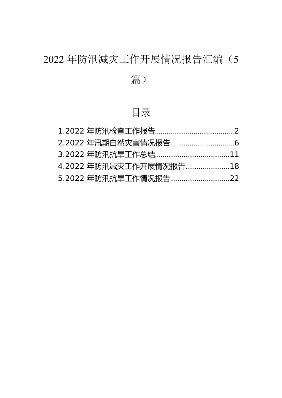 2022年防汛减灾工作开展情况报告汇编(5篇)目录1.2022年防汛检查工作报告.........................................22.2022年汛期自然灾害情况报告.................................63.2022年防汛抗旱工作总结.......................................114.2022年防汛减灾工作开展情况报告.......................185.2022年防汛抗旱工作情况报告...............................222022年防汛检查工作报告为切实做好我乡xxxx年防汛安全检查工作,保障人民群众生命财产安全,根据x水利〔xxxx〕xx号文件要求,xx乡按照文件精神积极做好工作安排,成立汛前安全检查小组,对乡辖区内的水利工程现状、抢险物资管理、水库运行、防汛防台抗旱法规知识宣传、河流等情况开展了一次大检查,及时排除了安全隐患。现将我乡的防汛准备工作报告如下:xx乡水资源十分丰富,有河道x条、水库x座。为做好“防大汛、抗大灾、抢大险”准备工作,在x月中旬就对防汛工作做出安排部署,制定工作措施,做到思想重视,措施落实到位,完善防洪预案,责任落实到人,确保安全度汛。一、汛前准备情况在总结去年防汛工作经验的基础上,我乡积极应对,做到早动员、早部署、早落实,全力抓好xxxx年度各项防汛准备工作。(一)及早部署防汛工作。乡党委、政府高度重视防汛工作。新年伊始,乡政府及时召开会议部署防汛工作。同时要求各驻村干部以电话、短信等形式督促各行政村进行自查自检,根据各村情况差异有针对性地对各村今年的防汛工作作出精心部署。(二)扎实推进基层防汛体系建设。在继续完善基层防汛体系建设工作的基础上,在乡本级建立集防汛、应急、消防、森林防火“四合一”应急分队。继续加强对村级防汛组织建设的督促力度目前全乡xx个行政村已全部建立村级防汛工作组,覆盖率xxx%。(三)切实做好人员值班巡查工作。为做好防御强降雨工作,乡村两级防汛组织在强降雨期间严格实行领导带班值班制度,水库巡查员、地质灾害监测员加强对水库河网、地质灾害点的巡查力度,科学调度,及时掌握汛情,加强预警。(四)严格按照相关规定准备检查相关防汛物资。目前,我乡已储备足够数量的雨衣雨靴救生衣等防汛物资,落实防汛抢险队伍xx支,基本满足防汛抢险需要。(五)加快在建水利工程施工进度。去冬今春以来,我乡抢抓小型农田水利工程,目前重点河道防洪堤工程已基本完成,能在今年汛期中发挥作用。二、汛期检查开展情况根据x防汛〔xxxx〕xx号文件要求我乡进行了今年防汛工作总体安排,各村从二月中旬开始,全面开展了防汛大检查。一是各行政村对所辖范围的农田水利工程、傍水房屋等进行“拉网式”的自查,基本摸清各类防汛安全隐患和存在的问题;二是乡政府组织相关人员对各村基层防汛体系建设情况和水利工程安全度汛情况进行了重点检查。对防汛检查中发现的问题及时进行整改。三是重点对横岭电站、包谢电站的库区进行安全巡查,全力做好安全生产工作。同时,乡政府还会在强降雨期间,对水库巡查员和地质灾害监测员随机进行电话抽查。今年我乡防汛准备工作总体上扎实有效,具体表现在:一是领导高度重视,防汛备汛工作准备充分,以乡党委书记负责制为核心的各项防汛责任制落实明确;二是各村积极配合基层防汛体系建设,修订各种防汛防旱预案,落实防汛值班制度,建立抢险队伍,储备了一定数量的防汛物资;三是各村积极开展自查工作,边查边改,确保各项防汛措施落实到位。三、主要问题(一)基层防汛能力仍然较为薄弱。虽然我乡全面开展了基层防汛体系建设,但各村进展不平衡,一些地方基层防汛体系不完善,基层组织和群众防灾避灾意识淡薄,自救能力不高,特别是一些村由于资金短缺,基层防汛体系建设所要求配备的预警设施、防汛物资以及避灾场所等难以到位,在一定程度上影响防汛抢险工作的正常开展。(二)山区小流域山洪灾害、地质灾害较为突出。我乡地处x西南山区丘陵地区,小流域山洪和地质灾害隐患点面广量大,据统计,全乡共有x个山洪灾害危害村,x个地质工程治理监测点。由于部分村避灾规划缺失,一些通村公路、林路建设安全标准低,安全监管与巡查措施不到位,农民切坡建房存在隐患,有的未采取...