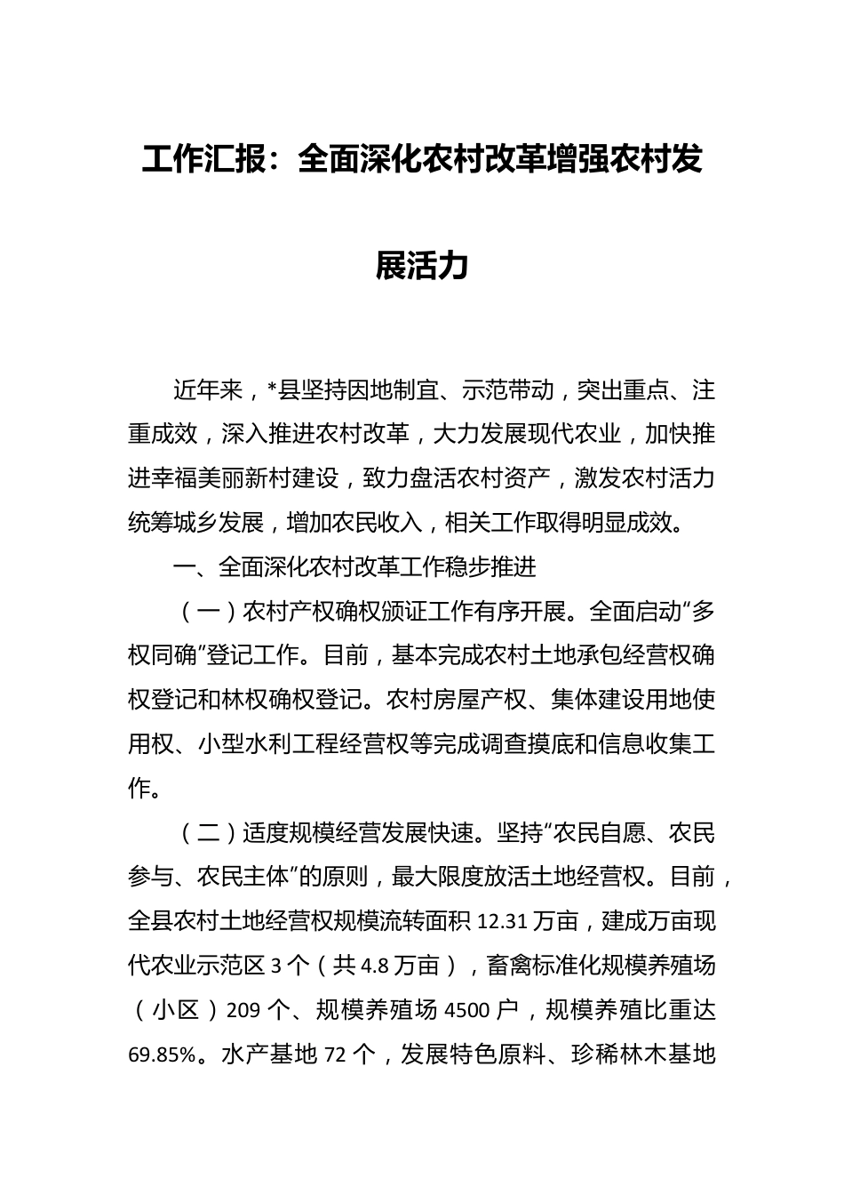工作汇报:全面深化农村改革增强农村发展活力近年来,*县坚持因地制宜、示范带动,突出重点、注重成效,深入推进农村改革,大力发展现代农业,加快推进幸福美丽新村建设,致力盘活农村资产,激发农村活力统筹城乡发展,增加农民收入,相关工作取得明显成效。一、全面深化农村改革工作稳步推进(一)农村产权确权颁证工作有序开展。全面启动“多权同确”登记工作。目前,基本完成农村土地承包经营权确权登记和林权确权登记。农村房屋产权、集体建设用地使用权、小型水利工程经营权等完成调查摸底和信息收集工作。(二)适度规模经营发展快速。坚持“农民自愿、农民参与、农民主体”的原则,最大限度放活土地经营权。目前,全县农村土地经营权规模流转面积12.31万亩,建成万亩现代农业示范区3个(共4.8万亩),畜禽标准化规模养殖场(小区)209个、规模养殖场4500户,规模养殖比重达69.85%。水产基地72个,发展特色原料、珍稀林木基地1.88万亩。(三)新型农业经营主体日益壮大。通过政策引导、资金扶持、技术服务、规范管理,全县扶持发展农业龙头企业51家,建立农民专业合作社3*个,培育家庭农场89户、种养大户2041个。(四)农业社会化服务体系逐步健全。一是加快推进新型农民职业化。依托县农技机构与农广校等,完成新型职业农民队伍培训20.3万人次。二是大力推进农业生产机械化。全面推进省农业机械化示范县建设,耕种收综合机械化水平达46.1%。三是着力推进病虫防控基层化。建成农村庄稼医院5个,农业病虫害防治基层化水平不断提升。四是加快发展农产品电商化。*电子商务产业园建设加快,致力建成集商品贸易、平台建设、物流配送、融资支持等为一体电子商务中心。(五)农村金融改革初显成效。*信用联社成功改制为农商银行,中银富登村镇银行挂牌营业,各银行机构主动下沉基层,不断增设服务网点,提升服务水平,成为真正意义上农民家里的银行。同时,扎实开展农村产权抵押融资试点工作,不断创新金融产品,增强金融服务“三农”发展的能力。二、农村集体资产股份制改革试点工作有序开展(一)组织领导得力,责任落实到位。县委、政府高度重视农村集体资产股份合作制改革试点工作,多次召开专题会议,学习领会文件精神、剖析改革试点精髓、研究部署相关工作。县上成立由县委副书记任组长,政府分管副县长任副组长,县农工委、农业局、林业局、财政局等有关单位为成员的*县农村集体资产股份合作制改革试点工作领导小组,领导小组下设办公室于县农业局,局长(兼)任办公室主任,主抓日常工作。试点乡镇和试点村社分别成立相应领导小组,全力抓好各项具体工作。全县上下形成了分工明确,责任到位,上下联动的工作格局。(二)宣传发动给力,氛围营造浓厚。县农工委统筹农业局牵头,法制办、民政局及候选乡镇等配合,通过入户走访,召开村(社)务会、党员会、村民代表座谈会,放广播、登板报、发手册、贴公开栏、办讲座等形式,向农民群众宣传推进此项改革的目的、意义及政策,在全县营造了良好改革氛围,使广大干群思想高度统一,参与改革意识强烈。(三)具体措施有力,工作进展顺利。一是敲定试点村社。按照省上要求,经过反复调查论证,敲定白坪—飞龙新农村示范区核心区“园中村”的飞龙镇卢山村7社作为*试点。二是制定实施方案。通过深入基层认真调研,结合实际制定了《*县农村集体资产股份合作制改革试点实施方案》。三是核定村社资产。组织专门力量,对卢山村7社的集体资产进行了全面、严谨、科学统计,分类登记造册。据初步核实,该社现有经营性资产35.5万元、非经营性资产29.9万元,正在张榜公示。下步工作中,*将严格按照省上的工作部署,切实增强做好农村集体资产股份制改革试点工作的责任感和紧迫感准确把握改革试点的具体要求,坚持制度创新,兼顾常住人口和迁入、迁出人口的核心利益,合理核定股权股份,确保集体资产保值增值,发挥集体资产最大效益,让该社集体经济组织成员得到改革试点带来的更多实惠。