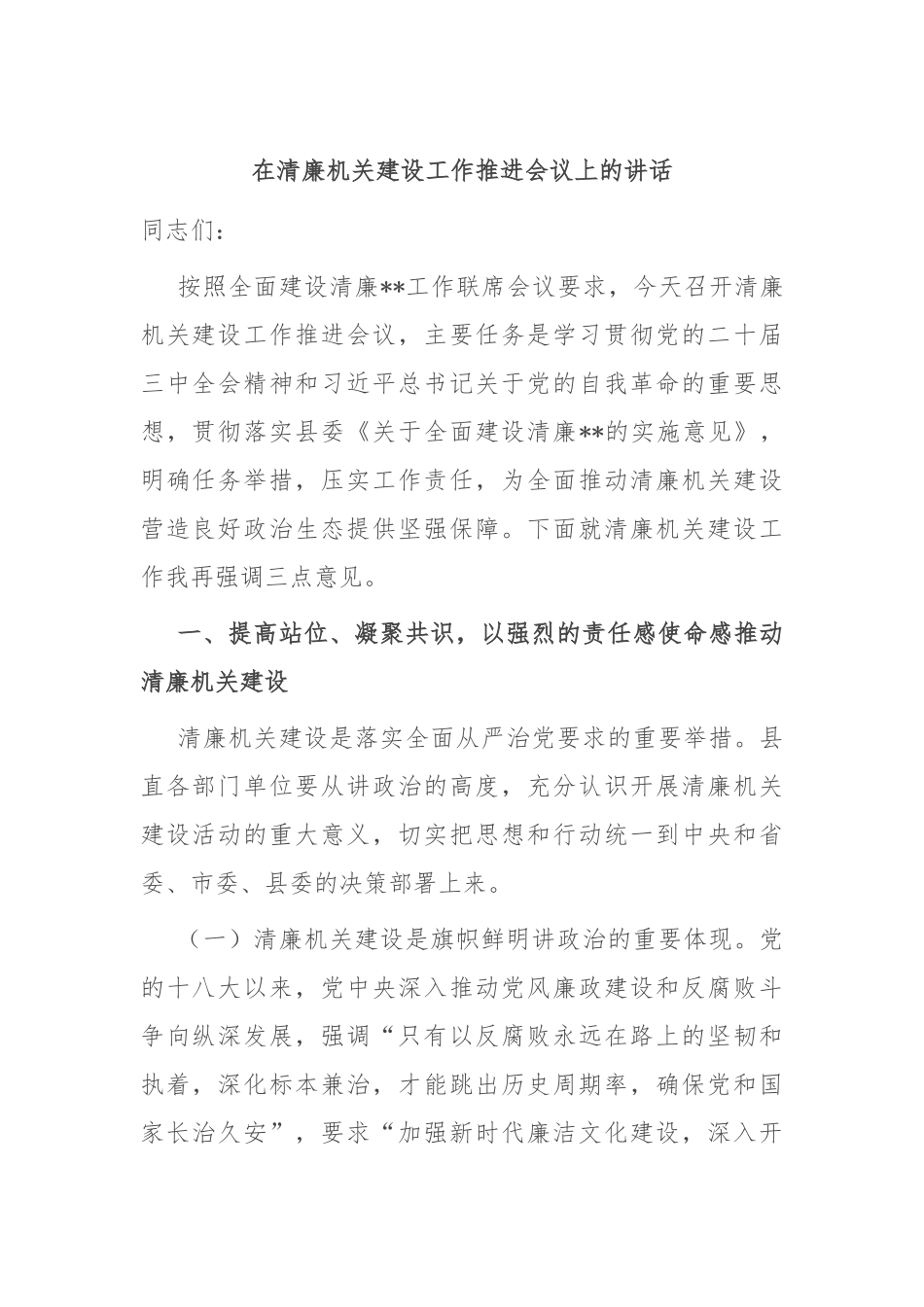 在清廉机关建设工作推进会议上的讲话同志们:按照全面建设清廉**工作联席会议要求,今天召开清廉机关建设工作推进会议,主要任务是学习贯彻党的二十届三中全会精神和习近平总书记关于党的自我革命的重要思想,贯彻落实县委《关于全面建设清廉**的实施意见》,明确任务举措,压实工作责任,为全面推动清廉机关建设营造良好政治生态提供坚强保障。下面就清廉机关建设工作我再强调三点意见。一、提高站位、凝聚共识,以强烈的责任感使命感推动清廉机关建设清廉机关建设是落实全面从严治党要求的重要举措。县直各部门单位要从讲政治的高度,充分认识开展清廉机关建设活动的重大意义,切实把思想和行动统一到中央和省委、市委、县委的决策部署上来。(一)清廉机关建设是旗帜鲜明讲政治的重要体现。党的十八大以来,党中央深入推动党风廉政建设和反腐败斗争向纵深发展,强调“只有以反腐败永远在路上的坚韧和执着,深化标本兼治,才能跳出历史周期率,确保党和国家长治久安”,要求“加强新时代廉洁文化建设,深入开展党性党风党纪教育,积极宣传廉洁理念、廉洁典型,营造拒腐崇廉的良好风尚”。省委把清廉山东建设作为一体推进“三不腐”的重要载体和平台。市委高度重视全面建设清廉**工作,8月15日,市委常委会审议通过了《关于以“清廉单元”为载体全面建设清廉**的实施意见》及联席会议制度,于8月30日正式印发。9月3日,全面建设清廉**工作联席会第一次全体(扩大)会议召开。10月11日,全面建设清廉**工作联席会议第一次全体(扩大)会议召开。清廉机关建设作为清廉***建设的重要单元,是时代要求、人民期盼,更是我们必须完成好的政治任务。我们必须按照习近平总书记指明的政治方向、确定的前进路线和省委、市委、县委相关要求,开展党风廉政建设和反腐败斗争,在抓落实、求实效上提高政治执行力,真正做好清廉机关建设工作。(二)清廉机关建设是一体推进“三不”机制的重要抓手。习近平总书记在二十届中央纪委三次全会指出:经过新时代十年坚持不懈的强力反腐,反腐败斗争取得压倒性胜利并全面巩固,但形势依然严峻复杂。我们对反腐败斗争的新情况新动向要有清醒认识,对腐败问题产生的土壤和条件要有清醒认识,以永远在路上的坚韧和执着,精准发力、持续发力,坚决打赢反腐败斗争攻坚战持久战。坚决贯彻落实党中央作出的重大战略部署,要把反腐败工作作为一项系统工程,加快构建“三不”长效机制,坚定不移、精准有序、标本兼治,实现“三不”同向发力,以永远在路上的坚韧和执着,巩固和发展反腐败斗争压倒性胜利。在清廉机关建设中,严肃查处腐败案件的要求等体现了“不敢腐”的震慑;扎紧制度笼子、深化改革促进公权力阳光运作、强化系统治理的方略任务体现了“不能腐”的约束;加强党纪国法教育、开展廉洁文化建设、树立廉洁家风等内容体现了“不想腐”的措施。清廉机关建设贯穿着纪律、法律、制度、规矩要求,与“三不”机制建设是一个整体,相互融合、交互作用、有机统一,体现了一体推进“三不”机制的政治自觉和行动自觉,有利于推动全面从严治党主体责任层层落实,有利于增强党员干部纪律意识、规矩意识和底线意识。(三)清廉机关建设是实现我县高质量发展的重要保障。廉政是重要的投资环境和政务环境。实践证明,一个地方腐败案件频发,给当地经济社会发展带来的负面影响是不可估量的。风清气正的政治生态,是***高质量发展的保障。党的十八大以来,县直各部门单位认真贯彻习近平总书记关于全面从严治党的重要论述精神,坚决落实党中央和省委、市委、县委的决策部署,以党的政治建设为统领,切实扛起管党治党的政治责任,驰而不息纠治“四风”,坚定不移惩治腐败,从严治党主体责任有效落实,干部教育监督管理扎实推进,各项制度规定更加完善,一大批群众反映强烈的突出问题和作风顽疾得到有效解决,政治生态持续净化。二、聚焦重点、精准施策,以坚定的执行力行动力推动清廉机关建设清廉机关建设是一项深远影响、事关全局的长期任务,其范畴广泛,需要县直各部门单位上下的广泛参与、密切协作与共同努力。县直各部门单位要主动肩负起历史使命勇于面对挑战,以务实...