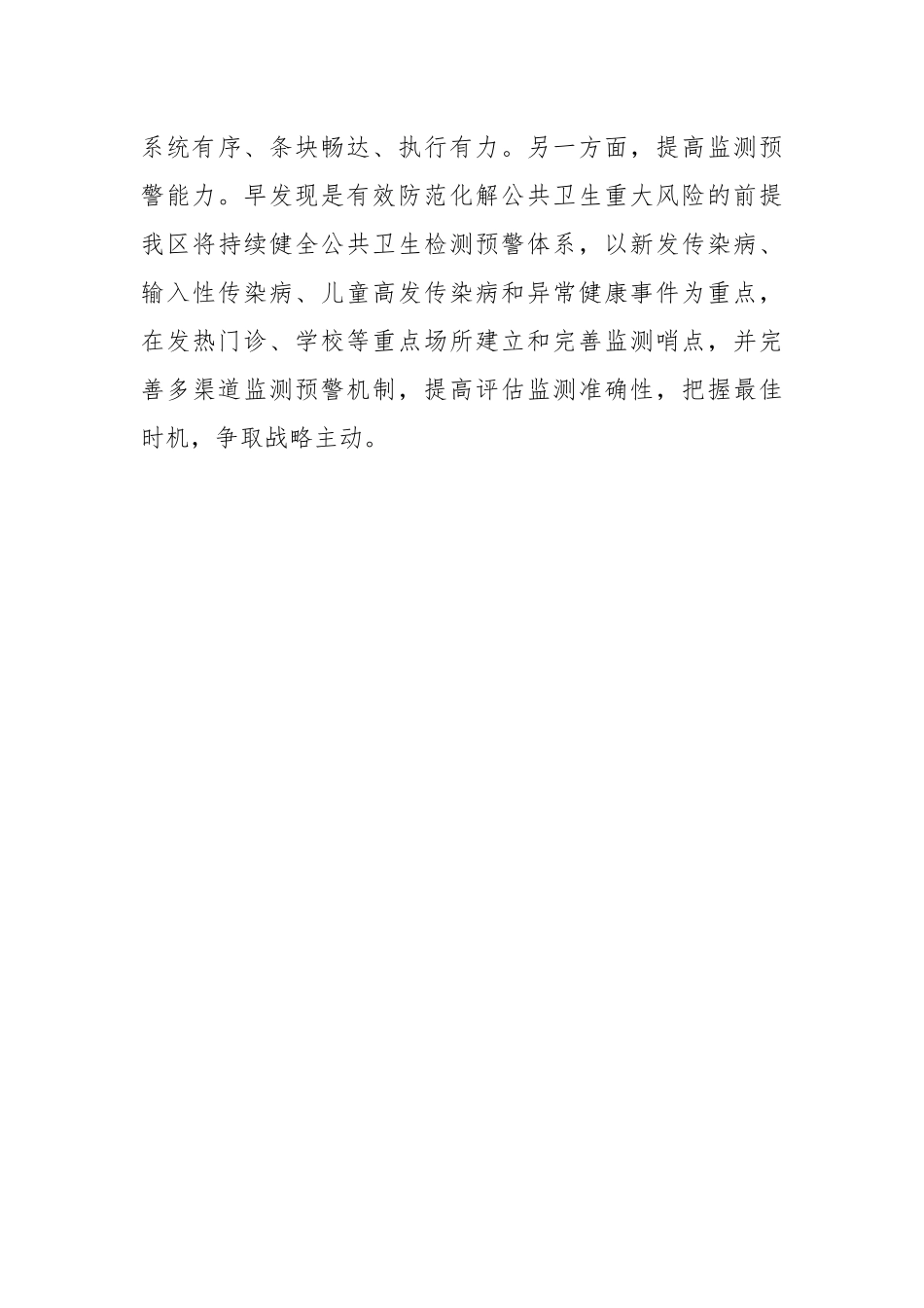 在应急管理专题培训班上的研讨发言(2187字)习近平总书记强调:“人民安全是国家安全的基石,突发急性传染病往往传播范围广、传播速度快、社会危害大,是重大生物安全问题,我们要强化底线思维,增强忧患意识,时刻防范卫生健康领域重大风险”。提高应对突发公共卫生事件能力是维护国家安全和社会稳定的迫切需要,及时稳妥应对处置突发公共卫生事件关系国家安全与发展,关系经济社会大局稳定。今天下午,XXX结合学习贯彻习近平总书记关于提高突发公共卫生事件应对能力的重要指示批示精神,围绕总体形势、重点工作、应急处置等方面,进行了全面系统地解读和培训,具有很强的针对性指导性和可操作性。通过聆听讲座,我受益匪浅,收获良多,对积极应对突发公共卫生事件,有力维护国家公共卫生安全有了更加深入的理解和认识,进一步提升了防范化解公共卫生事件的紧迫感和责任感。下面,结合自己学习我先谈几点体会,与大家作交流。一是以“思危之心”织密“居安之网”。党的二十大报告提出:“我们必须增强忧患意识,坚持底线思维,做到居安思危、未雨绸缪,准备经受风高浪急甚至惊涛骇浪的重大考验。”习近平总书记强调,“我国是一个有着十四亿多人口的大国,防范化解重大疫情和重大突发公共卫生风险,始终是我们须臾不可放松的大事”。习近平总书记关于公共卫生安全的一系列重要论述,为有效应对突发公共卫生事件指明了方向和路径,提供了根本遵循。当前,新冠肺炎疫情虽趋于平缓,但其他领域公共卫生风险依然存在,作为一名党员领导干部,不能有丝毫放松,必须以“时时放心不下”的紧迫感,坚持底线思维,强化忧患意识,把困难估计得更充分一些,把风险思考得更深入一些凡事从最坏处准备,既下好未雨绸缪的“先手棋盘”,又练好见招拆招的“对攻术”,才能当风险到来时,做到有的放矢、从容应对,掌握主动权,进而有效控制和降低风险危害,提高防范化解重大风险的能力和水平。二是以“治理之能”筑牢“防护之墙”。提高应对突发公共卫生事件能力是提升国家治理能力的内在要求。习近平总书记在今年2月3日召开的中央政治局常务委员会会议上强调:“要针对这次疫情应对中暴露出来的短板和不足,健全国家应急管理体系,提高处理急难险重任务能力”。一方面,提高指挥调度能力。建立高效融合、反应灵敏、决策科学的组织指挥体系,完善重大风险研判、评估、决策、防控协同机制,统一领导、统一指挥、统一行动,切实提升指挥协调效率和能力,确保做到指令清晰、系统有序、条块畅达、执行有力。另一方面,提高监测预警能力。早发现是有效防范化解公共卫生重大风险的前提我区将持续健全公共卫生检测预警体系,以新发传染病、输入性传染病、儿童高发传染病和异常健康事件为重点,在发热门诊、学校等重点场所建立和完善监测哨点,并完善多渠道监测预警机制,提高评估监测准确性,把握最佳时机,争取战略主动。三是以“体系之善”建设“健康之城”。一是健全完善预防体系。围绕建设“共建共享、医养普惠”的健康XXX,以争创“国家级卫生城市”为抓手,全方位干预健康影响因素,广泛开展爱国卫生运动,在全区范围内动员开展“三减三健”等健康教育活动,持续改善全区环境卫生条件,提高全面健康素养,力争年底达到国家级卫生城市创建标准,建成省级卫生乡镇XXX个、省级卫生村街占比达到XXX以上。同时,聚焦“一老一小”,实施妇幼健康促进行动、中小学健康促进行动、职业健康保护行动、老年健康促进行动“四大行动”,年底适龄儿童免疫规划疫苗接种率保持在90以上,学生体质健康达标率达到53以上,65至74岁老年人失能发生率较上年下降率不低于5。二是健全完善救治体系。以医疗集团建设为支撑,全面提升医疗服务能力。加快医疗机构项目建设步伐,强化功能定位,打造三类发展体系:以区级医院为“龙头”,着力提升急危重症救治能力;以区中医院和区妇幼保健院为“特色”建设区域中医诊疗中心和妇幼诊疗中心,发展中医综合能力和妇幼保健综合能力。同时,健全乡镇卫生院发展体系以需求为导向,结合区位优势,健全基层卫生公共服务体系;并完善村卫生室设施,聚焦预防,组织健康宣教,体检筛查,倡...