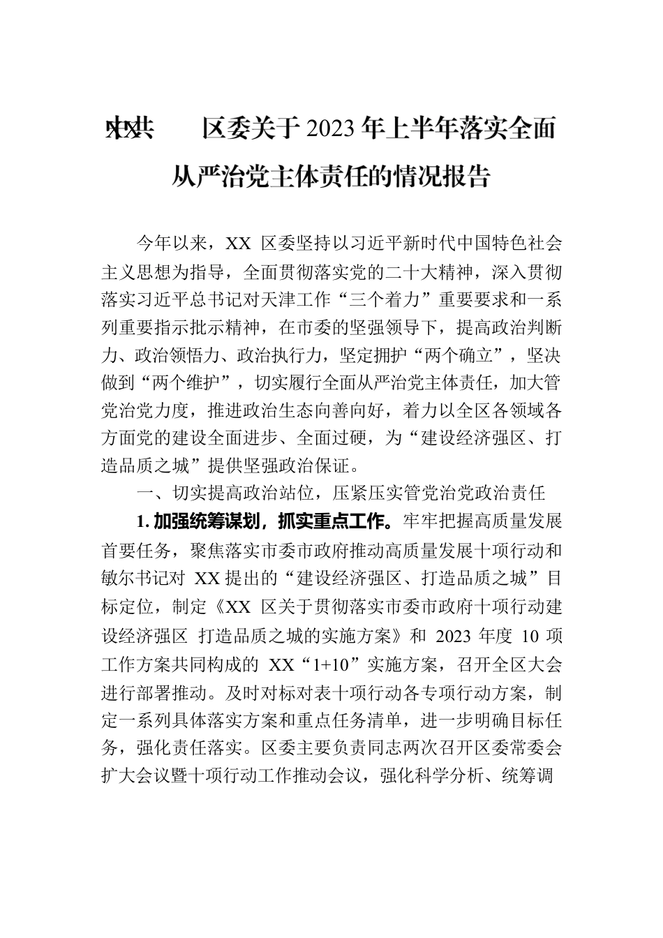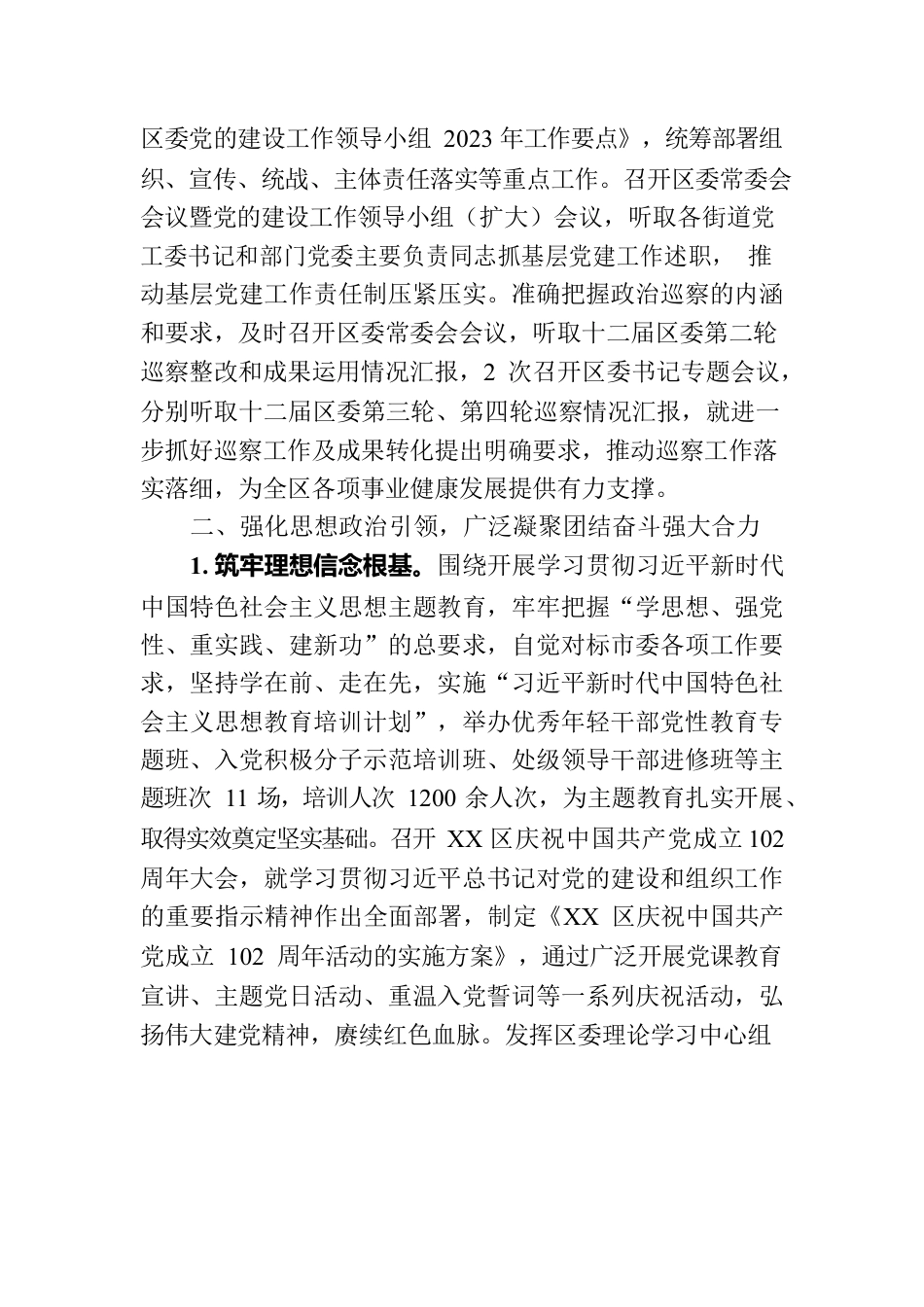 XX2023今年以来,XX区委坚持以习近平新时代中国特色社会主义思想为指导,全面贯彻落实党的二十大精神,深入贯彻落实习近平总书记对天津工作“三个着力”重要要求和一系列重要指示批示精神,在市委的坚强领导下,提高政治判断力、政治领悟力、政治执行力,坚定拥护“两个确立”,坚决做到“两个维护”,切实履行全面从严治党主体责任,加大管党治党力度,推进政治生态向善向好,着力以全区各领域各方面党的建设全面进步、全面过硬,为“建设经济强区、打造品质之城”提供坚强政治保证。一、切实提高政治站位,压紧压实管党治党政治责任1.加强统筹谋划,抓实重点工作。牢牢把握高质量发展首要任务,聚焦落实市委市政府推动高质量发展十项行动和敏尔书记对XX提出的“建设经济强区、打造品质之城”目标定位,制定《XX区关于贯彻落实市委市政府十项行动建设经济强区打造品质之城的实施方案》和2023年度10项工作方案共同构成的XX“1+10”实施方案,召开全区大会进行部署推动。及时对标对表十项行动各专项行动方案,制定一系列具体落实方案和重点任务清单,进一步明确目标任务,强化责任落实。区委主要负责同志两次召开区委常委会扩大会议暨十项行动工作推动会议,强化科学分析、统筹调度、系统推动,区级领导分兵把口、靠前指挥,加大对各自牵头行动的落实力度,确保各项重点任务平稳有序开展。围绕京津冀协同发展走深走实、推进产业提质增效、党建引领基层治理等行动召开专题会议15次,及时研究谋划下一步思路招法,细化明确重点工作目标任务,扎实推动中央精神和市委部署在XX落地生根、开花结果。2.大兴调查研究,深化成果运用。深入学习贯彻习近平总书记关于调查研究的重要论述,准确把握中央、市委对大兴调查研究的部署要求,制定《关于在全区大兴调查研究的安排方案》,围绕区委中心工作和重点任务,进一步细化明确12个方面调研重点,营造大兴调查研究浓氛围。区级领导♘以上率下、作出示范,带头开展大调研大走访活动,经常性深入市场主体、项目工地、科创主体、街道社区等点位,主动问需、精准服务,认真思考解决问题、促进工作的具体举措。召开区委理论学习中心组2022年度调研成果交流会,区委主要负责同志带头作交流发言,组织班子成员围绕研究解决改革发展稳定的重大问题、群众反映强烈的突出问题、党的建设面临的紧迫问题等方面开展成果交流,推动成果转化应用到区委政策举措和实际工作当中,为推动区域经济社会高质量发展注入不竭动力。3.层层传导压力,强化责任落实。坚持把党建工作与全区各项工作一起抓,同部署、同落实,定期召开区委常委会会议研究全面从严治党工作,释放全面从严治党不停歇、不松劲的强烈信号。召开党的建设工作会议,制定《中共XX区委党的建设工作领导小组2023年工作要点》,统筹部署组织、宣传、统战、主体责任落实等重点工作。召开区委常委会会议暨党的建设工作领导小组(扩大)会议,听取各街道党工委书记和部门党委主要负责同志抓基层党建工作述职,推动基层党建工作责任制压紧压实。准确把握政治巡察的内涵和要求,及时召开区委常委会会议,听取十二届区委第二轮巡察整改和成果运用情况汇报,2次召开区委书记专题会议,分别听取十二届区委第三轮、第四轮巡察情况汇报,就进一步抓好巡察工作及成果转化提出明确要求,推动巡察工作落实落细,为全区各项事业健康发展提供有力支撑。二、强化思想政治引领,广泛凝聚团结奋斗强大合力1.筑牢理想信念根基。围绕开展学习贯彻习近平新时代中国特色社会主义思想主题教育,牢牢把握“学思想、强党性、重实践、建新功”的总要求,自觉对标市委各项工作要求,坚持学在前、走在先,实施“习近平新时代中国特色社会主义思想教育培训计划”,举办优秀年轻干部党性教育专题班、入党积极分子示范培训班、处级领导干部进修班等主题班次11场,培训人次1200余人次,为主题教育扎实开展、取得实效奠定坚实基础。召开XX区庆祝中国共产党成立102周年大会,就学习贯彻习近平总书记对党的建设和组织工作的重要指示精神作出全面部署,制定《XX区庆祝中国共产党成立102周年活动的实施方案》,通过广泛开展党课教育宣讲、主题...