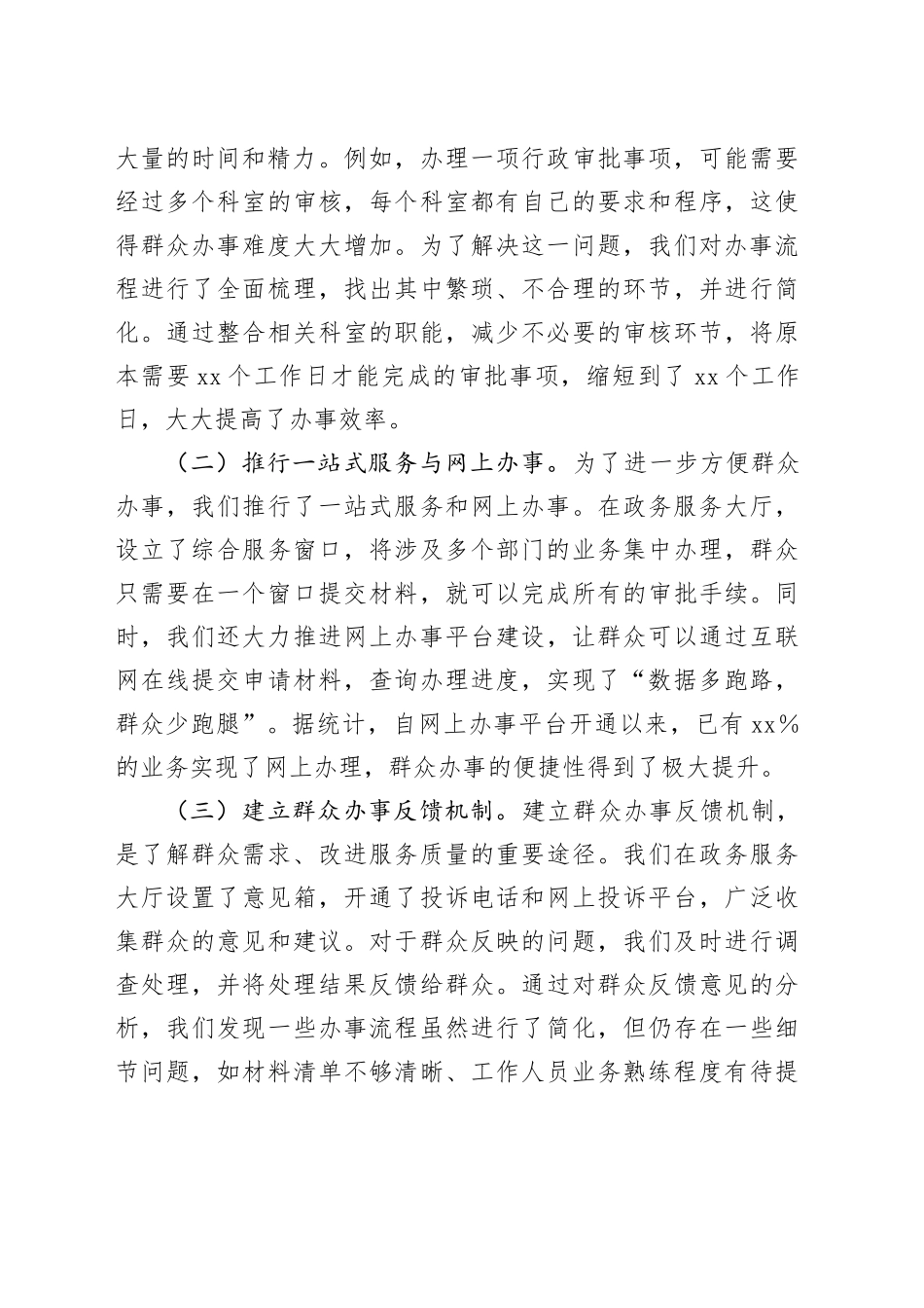 主题党课讲稿:以xxxx为引领,提升服务群众能力同志们:大家好!今天,我们围绕“学习xxxx,提升党员干部服务群众能力”这一主题开展党课学习。中央xxxx实施以来,党风政风得到显著改善,这不仅是对党员干部工作作风的规范,更是提升我们服务群众能力的重要契机。在日常工作中,我们要深刻领悟xxxx的精神实质,将其转化为服务群众的实际行动。接下来,我将从五个方面与大家深入探讨如何以xxxx为引领,不断提升服务群众的能力。一、树立群众导向,以xxxx推动服务意识转变(一)反思脱离群众的作风问题。在我们的工作中,曾经存在一些脱离群众的作风问题。部分党员干部习惯于坐在办公室听汇报、发文件,很少主动深入基层了解群众的实际需求。这种作风不仅导致工作决策与实际情况脱节,也严重损害了党和政府在群众心中的形象。根据相关调查数据显示,在xxxx实施前,群众对部分政府部门的满意度仅为xx%,其中很大一部分原因就是因为干部与群众沟通不畅,服务意识淡薄。一些干部在面对群众来访时,态度冷漠、敷衍了事,使得群众的问题得不到及时解决,久而久之,群众对干部的信任度不断降低。这些问题的存在,警示我们必须深刻反思,坚决摒弃脱离群众的不良作风。(二)强调服务群众是xxxx的出发点。中央xxxx的出发点和落脚点就是全心全意为人民服务。从改进调查研究,到精简会议活动,再到厉行勤俭节约,每一项规定都紧密围绕着群众利益。改进调查研究要求党员干部深入基层、深入群众,了解真实情况,这有助于我们制定出更符合群众需求的政策。精简会议活动和文件简报,能够让我们把更多的时间和精力投入到为群众办实事上。厉行勤俭节约则是为了把有限的资源用在刀刃上,更好地为群众谋福利。因此,我们要深刻认识到,服务群众是xxxx的核心要义,必须始终牢记为人民服务的宗旨。(三)树立全心全意为人民服务意识。树立全心全意为人民服务意识,是党员干部的首要任务。我们要从思想深处认识到,我们手中的权力是人民赋予的,必须用来为人民谋利益。在日常工作中,要时刻以群众利益为重,想群众之所想,急群众之所急。以我们单位的窗口服务部门为例,工作人员积极转变服务态度,主动为群众提供帮助,耐心解答群众的问题。通过开展服务意识培训,工作人员的服务态度得到了极大改善,群众的满意度从原来的xx%提升到了xx%。这充分说明,只要我们树立起全心全意为人民服务的意识,就能够赢得群众的认可和支持。二、简化办事流程,以xxxx优化群众办事体验(一)梳理繁琐办事流程并简化。在过去,群众办事往往面临着繁琐的流程,需要跑多个部门,提交大量的材料,耗费大量的时间和精力。例如,办理一项行政审批事项,可能需要经过多个科室的审核,每个科室都有自己的要求和程序,这使得群众办事难度大大增加。为了解决这一问题,我们对办事流程进行了全面梳理,找出其中繁琐、不合理的环节,并进行简化。通过整合相关科室的职能,减少不必要的审核环节,将原本需要xx个工作日才能完成的审批事项,缩短到了xx个工作日,大大提高了办事效率。(二)推行一站式服务与网上办事。为了进一步方便群众办事,我们推行了一站式服务和网上办事。在政务服务大厅,设立了综合服务窗口,将涉及多个部门的业务集中办理,群众只需要在一个窗口提交材料,就可以完成所有的审批手续。同时,我们还大力推进网上办事平台建设,让群众可以通过互联网在线提交申请材料,查询办理进度,实现了“数据多跑路,群众少跑腿”。据统计,自网上办事平台开通以来,已有xx%的业务实现了网上办理,群众办事的便捷性得到了极大提升。(三)建立群众办事反馈机制。建立群众办事反馈机制,是了解群众需求、改进服务质量的重要途径。我们在政务服务大厅设置了意见箱,开通了投诉电话和网上投诉平台,广泛收集群众的意见和建议。对于群众反映的问题,我们及时进行调查处理,并将处理结果反馈给群众。通过对群众反馈意见的分析,我们发现一些办事流程虽然进行了简化,但仍存在一些细节问题,如材料清单不够清晰、工作人员业务熟练程度有待提高等。针对这些问题,我们及时进行了整改...