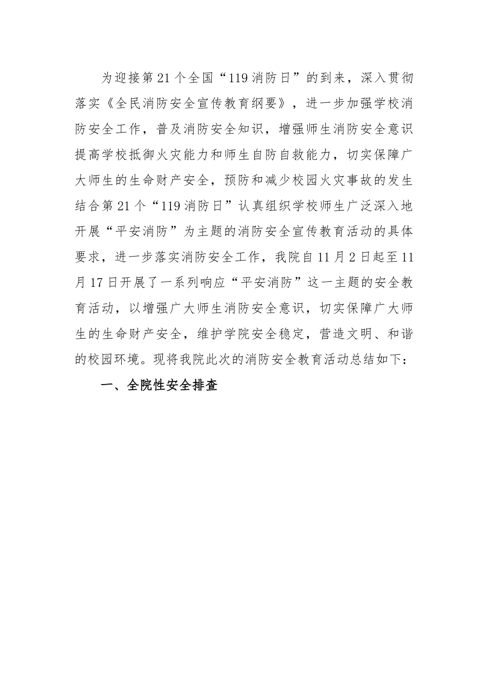 消防主题教育活动总结1为了进一步加强学院消防安全教育,普及消防安全知识,加强学院火灾风险防控工作,构建一个安全的校园环境,10月12日下午,机械工程学院与保卫处组织开展了“防范火灾隐患,共建平安校园”消防安全教育活动。学校保卫处相关教师通过腾讯会议为大家详细介绍了各种消防知识和预防火灾方法,从大家身边的消防安全隐患讲起,通过播放一些火灾现场视频,指导同学们重视火灾的预防,做到防患于未然。会后,老师组织同学们到室外实践,在老师的指导下,同学们依次操作灭火器,扑灭现场点燃的火堆。本次活动使同学们对消防安全工作的重要性和意义有了更深的认识,增强了同学们的消防安全意识,帮助大家积累了相关的消防知识,让同学们更直观的了解灭火器的使用方法,大大提高了学生的消防安全工作主体意识和防火减灾防范意识,对于提高学校消防安全管理能力、火灾自救能力,创建安全、文明、和谐的校园环境具有重要意义。消防主题教育活动总结2为迎接第21个全国“119消防日”的到来,深入贯彻落实《全民消防安全宣传教育纲要》,进一步加强学校消防安全工作,普及消防安全知识,增强师生消防安全意识提高学校抵御火灾能力和师生自防自救能力,切实保障广大师生的生命财产安全,预防和减少校园火灾事故的发生结合第21个“119消防日”认真组织学校师生广泛深入地开展“平安消防”为主题的消防安全宣传教育活动的具体要求,进一步落实消防安全工作,我院自11月2日起至11月17日开展了一系列响应“平安消防”这一主题的安全教育活动,以增强广大师生消防安全意识,切实保障广大师生的生命财产安全,维护学院安全稳定,营造文明、和谐的校园环境。现将我院此次的消防安全教育活动总结如下:一、全院性安全排查11月2日至4日我院自律会组织开展了安全排查活动,其覆盖范围包括全院男女生宿舍楼以及教学楼。安全排查的主要内容包括:学生宿舍是否存在安全隐患(是否乱拉电线网线、是否使用违规电器、排查摆放位置、未报修或报修未能及时修理的物品等)、宿舍楼教学楼消防栓灭火器的.使用情况(卫生状况、破损状况等)。11月2日晚首先进行男生宿舍安全排查,我院男生宿舍集中于B区1、2、6、7栋,在排查过程中6栋105、109宿舍乱拉网线,存在安全隐患。在11月3日晚进行的女生宿舍安全排查中C区10#317、318阳台漏水,经过深入了解,这两个宿舍成员自一年前报修过多次,均未得到解决;C区15栋301客厅插座坏掉,对该宿舍使用电源造成很大困扰,并存在安全隐患。在4日下午进行的宿舍楼、教学楼消防栓灭火器排查中发现,很多消防栓灭火器长时间未清理,有的出现破损。此次安全排查,其中B区6栋105、109宿舍乱拉网线问题已经予以解决,而其他问题还需学校方面予以帮助解决。二、教室火场逃生演练为了加强学院学生对防御火灾及火灾逃生知识的教育,使同学熟悉教室地形及突发状况逃生路线,我院于11月9日上午举行了火灾逃生演练。本次演练旨在做好火灾突发状况的应急准备工作,提高同学的安全意识,加强自我保护的能力。此次演练,由自律会保卫部主要负责,其他部门予以配合。参加此次逃生演练的班级有:09会计、10国贸1班、10国贸2班、10物流、11国贸1班、11国贸2班、11会计、11电商班1班、11电商(闽台合作)班、11市营2班。在逃生演练前期准备工作中,11月8号中午十二点保卫部召集参加逃生演练的十个班级的班长副班长(11级为班级助理)在文科楼B栋303开逃生演练准备会议,会议中主要强调:副班长提前跟任课老师说明情况,希望老师按时下课学生十点整听到哨声响起有序跑出教室;撤离过程中避免出现忙乱奔跑、相互拥挤、推挡、踩踏等现象;撤离地点为中山篮球场,到达后做好点名工作;辅导员老师会亲临现场进行督导指挥。11月9号上午9点半自律会工作人员在303集合,分配好工作后,九点四十分全部到达指定地点准备进行疏散、引导等工作,自律会宣传部派出三人在各指定地点进行拍照。伴随响亮的哨声响起,同学们迅速从各个楼层最近的通道、楼梯口、大门撤离。演练现场秩序井然,避免了忙乱奔跑、相互拥挤、推挡、踩踏等现象的出现。在老师及学院学生干部的带领指挥下,同学们及时从安全疏通...
