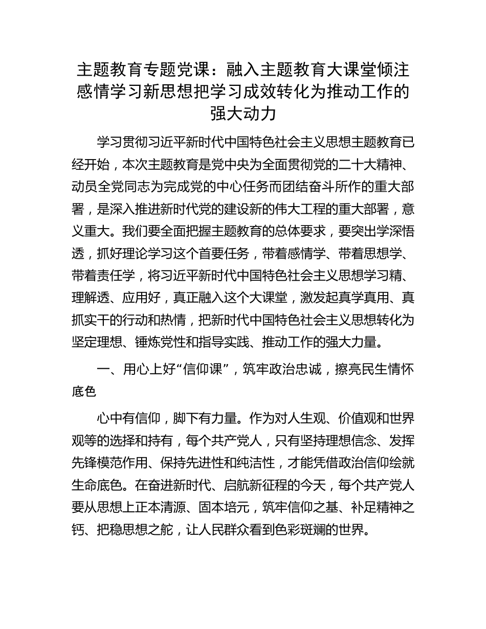 主题教育专题党课:融入主题教育大课堂倾注感情学习新思想把学习成效转化为推动工作的强大动力学习贯彻习近平新时代中国特色社会主义思想主题教育已经开始,本次主题教育是党中央为全面贯彻党的二十大精神、动员全党同志为完成党的中心任务而团结奋斗所作的重大部署,是深入推进新时代党的建设新的伟大工程的重大部署,意义重大。我们要全面把握主题教育的总体要求,要突出学深悟透,抓好理论学习这个首要任务,带着感情学、带着思想学、带着责任学,将习近平新时代中国特色社会主义思想学习精、理解透、应用好,真正融入这个大课堂,激发起真学真用、真抓实干的行动和热情,把新时代中国特色社会主义思想转化为坚定理想、锤炼党性和指导实践、推动工作的强大力量。“”一、用心上好信仰课,筑牢政治忠诚,擦亮民生情怀底色心中有信仰,脚下有力量。作为对人生观、价值观和世界观等的选择和持有,每个共产党人,只有坚持理想信念、发挥先锋模范作用、保持先进性和纯洁性,才能凭借政治信仰绘就生命底色。在奋进新时代、启航新征程的今天,每个共产党人要从思想上正本清源、固本培元,筑牢信仰之基、补足精神之钙、把稳思想之舵,让人民群众看到色彩斑斓的世界。(一)政治信仰是破解难题、凝聚力量的伟大旗帜。党员“”干部要修好马克思主义心学,学懂弄通做实习近平新时代中国特色社会主义思想,做马克思主义坚定信仰者、忠实践行者,不断提高政治判断力、政治领悟力、政治执行力;坚持学以致用、知行合一,把工作摆进去,把职责摆进去,用党的创新理论指导实践、推动工作、破解难题,始终以党的意志为意志,以党的旗帜为旗帜,与党中央的决策部署同频共振、同向同行。要始终把人民对美好生活的向往作为工作的出发点和落“”脚点,坚持人民至上,全心为民服务,以时时放心不下的责任感,深入基层一线,察民情,解民忧,纾民困,知民意,“”“”把百姓事当成自己事,努力提高办事效率,增加人民的满意度。要树立正确的价值观、名利观、权力观,坚持权为民所用、情为民所系、利为民所谋,公正用权,依法用权,廉洁“”用权,自觉净化社交圈、生活圈、朋友圈,管好自己事,“”带好自家人,筑牢拒腐防变防线,健全品行优良的人格,赢得社会的好口碑。(二)正确的信仰成就事业、实现目标的基础。信仰上的坚定来源于理论上的清醒,每个共产党人要进一步深化对中国特色社会主义理论体系的学习理解,提高政治敏锐性和政治鉴别力,胸怀共产主义远大理想,坚定贯彻现阶段党的路线方针政策,脚踏实地地做好本职工作,把理想与现实统一起来,为党的伟大事业努力奋斗。主题教育的第一堂课要固本培元,党员干部要自觉用习近平新时代中国特色社会主义思想凝心铸“”“魂,更加自觉深刻领悟两个确立的决定性意义,增强四个”“”“”意识、坚定四个自信、做到两个维护,在思想上政治上“”行动上同党中央保持高度一致,以革命理想大于天的精神坚守信仰、净化心灵,在真学真信、常学常新中夯实信仰之基,深扎信仰之根。(三)坚定政治信仰要坚持学习、提升理论修养。共产党人坚守信仰,就要增强对中国特色社会主义的理论自信、道路自信、制度自信。开展主题教育,就是要教育引导党员干部自觉加强科学理论学习,掌握马克思主义立场观点和方法,牢固树立正确的人生观、价值观,坚守共产党人的政治灵魂和精神家园,坚定共产主义远大理想和中国特色社会主义共同理想,做到任何时候、任何情况信仰不动摇、方向不偏差,自觉听党话、跟党走。要时刻敬畏党纪党规,把纪律作为言行指南,坚持原则不动摇、执行标准不走样、履行程序不变通,坚决维护纪律的严肃性和权威性,坚定不移沿着正确的中国道路奋勇前行。“”二、用绩上好专业课,提升能力本领,更好服务人民群众进入新发展阶段,经济社会发展仍然有很多亟待解决的问题,这些问题都需要党员干部着手解决,党员干部的履职能力面临着巨大考验。党员干部必须要有适应本职工作的较高专业水平,全面提升自身专业化能力和实战水平,在面对各种困难矛盾中,能挑起重担。(一)面对新形势新任务,必须重视专业知识学习。置身民族复兴的关键一程,面对加速演进...