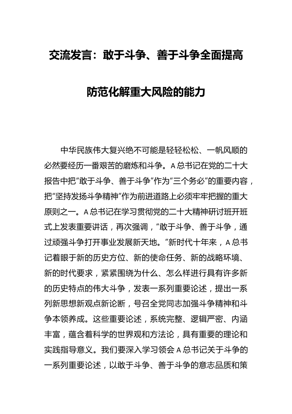 交流发言:敢于斗争、善于斗争全面提高防范化解重大风险的能力中华民族伟大复兴绝不可能是轻轻松松、一帆风顺的必然要经历一番艰苦的磨炼和斗争。A总书记在党的二十大报告中把“敢于斗争、善于斗争”作为“三个务必”的重要内容,把“坚持发扬斗争精神”作为前进道路上必须牢牢把握的重大原则之一。A总书记在学习贯彻党的二十大精神研讨班开班式上发表重要讲话,再次强调,“敢于斗争、善于斗争,通过顽强斗争打开事业发展新天地。”新时代十年来,A总书记着眼于新的历史方位、新的使命任务、新的战略环境、新的时代要求,紧紧围绕为什么、怎么样进行具有许多新的历史特点的伟大斗争,发表一系列重要论述,提出一系列新思想新观点新论断,号召全党同志加强斗争精神和斗争本领养成。这些重要论述,系统完整、逻辑严密、内涵丰富,蕴含着科学的世界观和方法论,具有重要的理论和实践指导意义。我们要深入学习领会A总书记关于斗争的一系列重要论述,以敢于斗争、善于斗争的意志品质和策略艺术,努力为全面建设社会主义现代化国家、全面推进中华民族伟大复兴而拼搏奋斗。一、坚持常观大势、常思大局,切实肩负起防范化解重大风险的政治职责防范化解重大风险,首先必须解决好思想认识这个“总开关”。不解决“怎么看”,就无法解决“怎么办”,看不到、看不全、看不透风险就是最大的风险。我们必须立足**实际,善于从政治和全局的高度认识**面临的风险,进而增强防范化解重大风险的政治自觉。“看”风险,必须有战略思维和全局观念。**是京畿要地,区位特殊,责任重大,是首都的政治“护城河”,**的稳定和安全直接关乎首都的稳定和安全。看**的风险,不能就风险本身看风险,不能孤立地看风险,不能局限于一时一地一领域看风险,而是必须从政治“护城河”的高度,运用战略思维、具有全局眼光。战略思维是统筹全局、善于把握事物发展总体趋势和方向的思维方法。古人讲:“不谋万世者,不足谋一时;不谋全局者,不足谋一域。”A总书记特别重视战略思维,强调战略思维永远是中国共产党人应该树立的思维方式。认识和处置风险都要首先讲政治、讲大局,把重大风险上升到政治和全局的高度,上升到事关国家安全、社会稳定、人民福祉的高度来认识。要把防范化解重大风险作为树牢“四个意识”、坚定“四个自信”、坚决做到“两个维护”的具体行动,始终保持如履薄冰的谨慎、居安思危的忧患,不断增强工作的全局性、系统性、预见性,坚决防止局部的风险挑战发展成系统性的风险挑战,以**之稳拱卫首都安全,以**之进服务全国改革发展大局。“看”风险,就要坚持唯物论,一切从实际出发,坚持辩证法,从矛盾问题入手,客观分析**经济社会发展面临的形势。当前,**正处于历史性窗口期和战略性机遇期,也处于深化改革的攻坚期和转型升级的阵痛期、关键期,大事多、好事多,难事和风险也多。比如,作为钢铁大省,**经济发展正在转型升级、爬坡过坎,产业结构优化升级任务很重,在化解过剩产能过程中平衡好去产能、保就业、防风险的关系,积极稳妥安置下岗职工,压力很大;生态环境治理的任务越来越重,特别是雾霾天气成为心头之患尽管通过有效治理取得有目共睹的成效,但距离广大人民群众的期望还有不小差距;脱贫攻坚任务很重,贫困县的数量特别是北京周边贫困县的数量还不少,等等。可以说我们现在面临的矛盾更加复杂,是一个船到中流浪更急、人到半山路更陡的时候,是一个愈进愈难、愈进愈险而又不进则退、非进不可的时候。面对可能出现的重大风险,我们该怎么办?古人说:“事者,生于虑,成于务,失于傲。”就是要坚持底线思维,增强忧患意识,既要保持清醒头脑和战略定力,增强防范化解重大风险的信心和勇气,不为风险压倒,不悲观不懈怠,又要常观大势、常思大局科学预见形势发展走向和隐藏其中的风险挑战,做到未雨绸缪。二、坚持“两点论”和“重点论”相统一,有针对性地打好防范化解重大风险攻坚战现实中,风险无处不在、无时不有、复杂多样。**面临的重大风险,既包括自身政治、意识形态、经济、科技社会、党的建设等领域以及来自自然界的风险,也包括外部环境变化带来的冲击等。如果发生重...