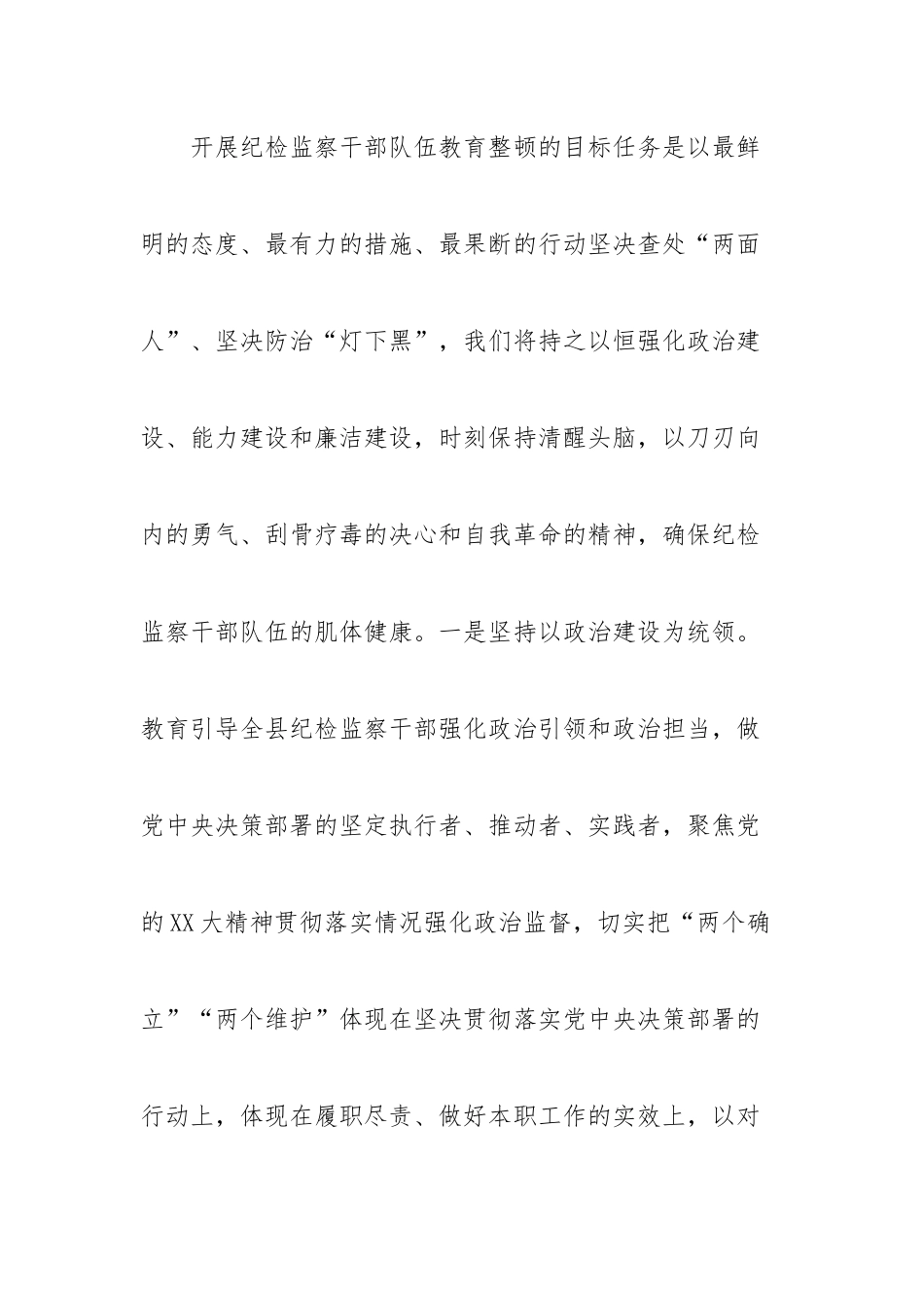 县纪委书记在全市纪检监察干部队伍教育整顿动员部署会上的表态发言尊敬的各位领导、同志们:根据会议安排,下面我代表XX县纪委监委,就落实好此次会议精神,扎实开展全县纪检监察干部队伍教育整顿,努力锻造忠诚干净担当、敢于善于斗争的纪检监察干部队伍,作表态发言如下:一、强化政治自觉,真正做到触及思想灵魂纪检监察机关是党的纪律部队,开展纪检监察干部队伍教育整顿是坚持打铁还需自身硬的必然要求,我们将坚决落实中央和省市关于纪检监察干部队伍教育整顿的各项工作部署。坚持用用习近平总书记重要讲话和重要指示批示精神引领纪检监察机关自身建设,在深学笃行中不断提高政治判断力、政治领悟力、政治执行力,切实把对“两个确立”的坚定拥护转化为“两个维护”的自觉行动。充分发挥领导干部示范引领作用,自觉立标杆、做示范,引导全县纪检监察干部以更加鲜明的态度、更加坚定的立场、更加自觉的行动接受刻骨铭心的革命性锻造和深入灵魂的精神洗礼,锤炼忠诚干净担当的政治品格。二、把准目标任务,推动各项工作走深走实开展纪检监察干部队伍教育整顿的目标任务是以最鲜明的态度、最有力的措施、最果断的行动坚决查处“两面人”、坚决防治“灯下黑”,我们将持之以恒强化政治建设、能力建设和廉洁建设,时刻保持清醒头脑,以刀刃向内的勇气、刮骨疗毒的决心和自我革命的精神,确保纪检监察干部队伍的肌体健康。一是坚持以政治建设为统领。教育引导全县纪检监察干部强化政治引领和政治担当,做党中央决策部署的坚定执行者、推动者、实践者,聚焦党的XX大精神贯彻落实情况强化政治监督,切实把“两个确立”“两个维护”体现在坚决贯彻落实党中央决策部署的行动上,体现在履职尽责、做好本职工作的实效上,以对党的绝对忠诚体现最强的党性。二是坚持以能力建设为支撑。督促纪检监察干部系统学习掌握基本功,提高把握政策、监督执纪、做好思想政治工作等能力,不断加强实践锻炼深入学,推动干部在干中学、学中干,积极在党风廉政建设和反腐败斗争一线砥砺品格操守,在各种风险挑战中筑牢坚强屏障,打通监督执纪“最后一公里”,让群众感受到全面从严治党就在身边。三是坚持以廉洁建设为保障。坚持刀刃向内,自觉接受党内和社会各方面最严格的监督,健全完善纪检监察权力运行内控机制,强化廉政风险点排查、内部督查,加大严管严治、自我净化力度,严防“灯下黑”。三、扭住关键环节,确保教育整顿取得实效我们将坚持严的要求与实的举措有机结合,严格对标对表,有力有效推进,确保教育整顿交出合格答卷。一是以学习教育为根本铸就政治忠诚。切实用习近平新时代中国特色社会主义思想凝心铸魂、统领工作,持续加强政治教育、党性教育和纪法教育,更加深刻领悟“两个确立”的决定性意义,更加自觉做到“两个维护”。二是以检视整治为重点清除害群之马。刀刃向己自查自纠,动真碰硬推进整改,真刀真枪、自剜腐肉、真改真治,坚决查处“两面人”和一切违法纪律的行为。三是以巩固提升为关键健全严管体系。严肃党内政治生活,强化日常管理监督,推动完善制度机制,以规范化、法治化、正规化建设实效保障提升纪检监察干部队伍建设水平。我们将以此次会议为导向,在市纪委监委的有力指导下,以最坚决的态度、最优良的作风、最严明的纪律、最务实的举措推进教育整顿,把教育整顿与学习贯彻习近平新时代中国特色社会主义思想主题教育统筹衔接,与中央和省市纪委全会部署的主要任务紧密结合,确保各项业务工作和队伍建设相互促进、同步发力,切实把教育整顿的成果转化为推动纪检监察工作高质量发展的强大动力和实际成效。