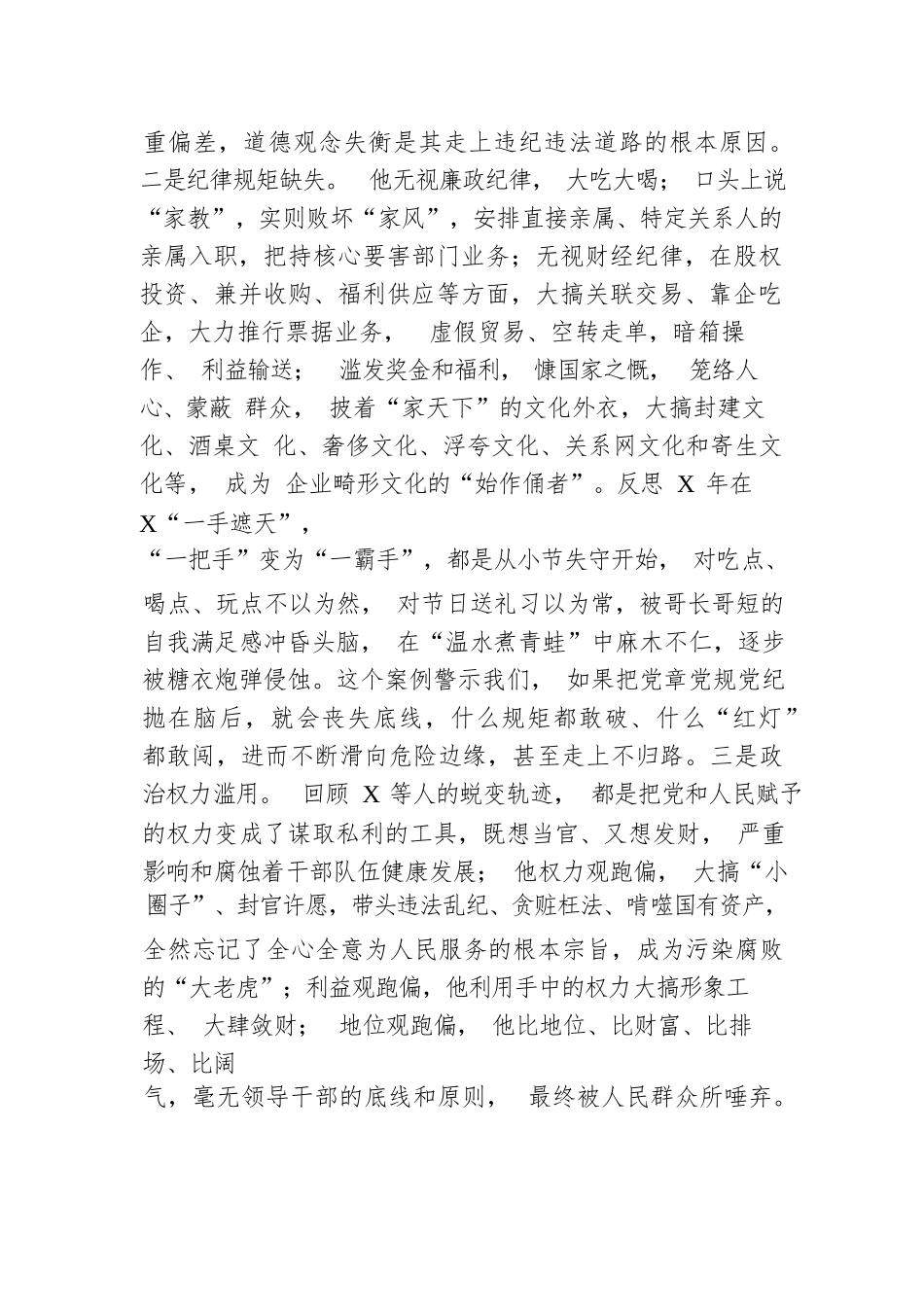 国企总经理关于严重违纪违法案以案促改专题民主生活会个人对照检查材料根据X公司党委通知精神,结合公司召开的X严重违纪违法典型案例警示教育大会相关内容要求,深刻对照政治纪律、政治规矩、法律意识、风险意识极其淡薄,政绩观严重扭曲,贪大喜功、脱实向虚,偏离主责主业,对上级决策部署打折扣、搞变通等违纪违法事实,按照公司党委工作安排,认真进行自我检视,深入查摆自身存在的问题,现将对照检查材料汇报如下:一、对严重违纪违法案件的认识通过对典型案例的分析讨论,主要认识如下:一是理想信念背弃。认真剖析这起案件,X等人长期不注重理论学习、党性锻炼,嘴上马列主义、实则自由主义,带头弱边、虚化和边缘化党的领导,成为党的建设最大的“破坏者”;要求别人“走正道、干实事、守规矩、勇担当”,实则表里不一、装腔作势,说一套、做一套,打折扣、搞变通,阳奉阴违、胆大妄为,典型“两面人”;大讲企业“特殊论”,大搞X“家文化”,实则“精神绑架”;思想“缺钙”,底色蜕变,无视党纪国法,对党不忠诚不老实,不注重世界观、人生观的改造,私欲膨胀,背弃了共产主义理想和党的宗旨,不重视科技创新、阻碍绿色低碳发展,成为高质量发展的“绊脚石”;政治上丧失信念、经济上贪得无厌,权力观、政绩观、事业观严重偏差,道德观念失衡是其走上违纪违法道路的根本原因。二是纪律规矩缺失。他无视廉政纪律,大吃大喝;口头上说“家教”,实则败坏“家风”,安排直接亲属、特定关系人的亲属入职,把持核心要害部门业务;无视财经纪律,在股权投资、兼并收购、福利供应等方面,大搞关联交易、靠企吃企,大力推行票据业务,虚假贸易、空转走单,暗箱操作、利益输送;滥发奖金和福利,慷国家之慨,笼络人心、蒙蔽群众,披着“家天下”的文化外衣,大搞封建文化、酒桌文化、奢侈文化、浮夸文化、关系网文化和寄生文化等,成为企业畸形文化的“始作俑者”。反思X年在X“一手遮天”,“一把手”变为“一霸手”,都是从小节失守开始,对吃点、喝点、玩点不以为然,对节日送礼习以为常,被哥长哥短的自我满足感冲昏头脑,在“温水煮青蛙”中麻木不仁,逐步被糖衣炮弹侵蚀。这个案例警示我们,如果把党章党规党纪抛在脑后,就会丧失底线,什么规矩都敢破、什么“红灯”都敢闯,进而不断滑向危险边缘,甚至走上不归路。三是政治权力滥用。回顾X等人的蜕变轨迹,都是把党和人民赋予的权力变成了谋取私利的工具,既想当官、又想发财,严重影响和腐蚀着干部队伍健康发展;他权力观跑偏,大搞“小圈子”、封官许愿,带头违法乱纪、贪赃枉法、啃噬国有资产,全然忘记了全心全意为人民服务的根本宗旨,成为污染腐败的“大老虎”;利益观跑偏,他利用手中的权力大搞形象工程、大肆敛财;地位观跑偏,他比地位、比财富、比排场、比阔气,毫无领导干部的底线和原则,最终被人民群众所唾弃。二、存在的主要问题(一)政治立场方面一是政治站位不高。在贯彻落实上级党组织工作部署方面,没有做到同频共振,理解力、领悟力、执行力不够;对如何聚焦主责主业、做强做优深入思考不足,缺乏一定的大局意识、全局观念;对习近平新时代中国特色社会主义思想学习理解不深入,认识不全面,对新思想、新理论、新举措没有系统研究,主动学习的制度性建设抓得不实;日常工作对经营业绩关注多,但对上市公司其他工作掌控不全面;点、线、系统化思维不强,针对行业发展面临的“双碳”限制、大气污染联防联控、创新管理高质量发展等问题集中讨论的少,主动沟通少,抓工作力度不够。二是认知觉悟不够。在党言党、在党护党做的不够好,对于奉献精神衰退、利益观不正、政治立场不坚定、是非观念不清的党员,缺乏政治敏锐性,没有直面指出错误及时批评教育;对利用虚假贸易使X进入世界五百强的过程中,要求党员转发一些链接和图片,没有明确阻止;对不良行为自觉抵制要求不严。三是组织建设不强。在组织生活中,与一般干部职工交流谈心较少,讲成绩较多、针对工作问题、个人缺点从思想根源、触及灵魂深处上做的还不够;党委民主议事制度不够完善,重要事项前置沟通研究少,集体决议后监督落实检查少;对基层...