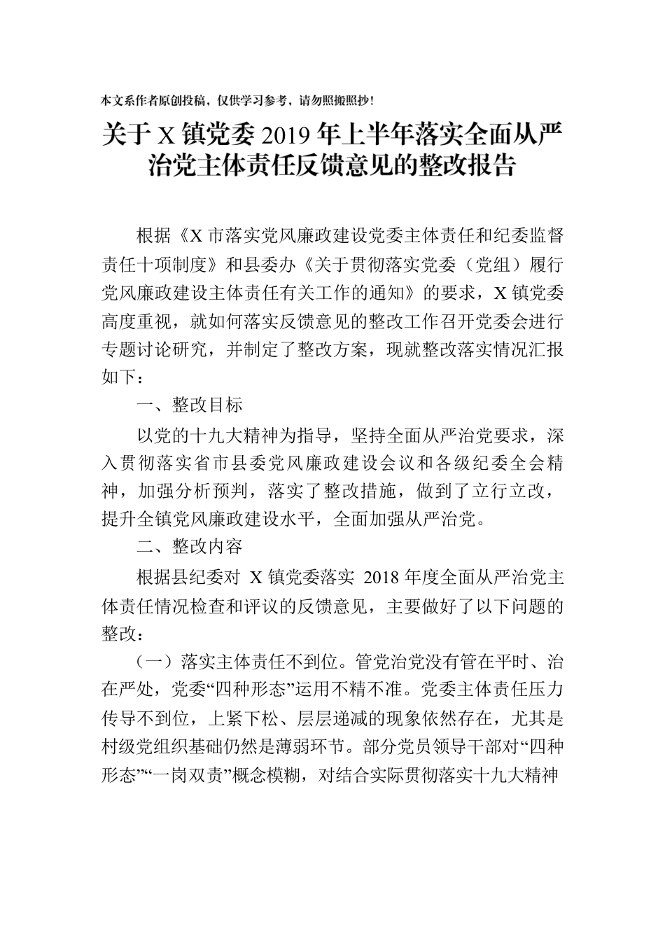 X2019根据《X市落实党风廉政建设党委主体责任和纪委监督责任十项制度》和县委办《关于贯彻落实党委(党组)履行党风廉政建设主体责任有关工作的通知》的要求,X镇党委高度重视,就如何落实反馈意见的整改工作召开党委会进行专题讨论研究,并制定了整改方案,现就整改落实情况汇报如下:一、整改目标以党的十九大精神为指导,坚持全面从严治党要求,深入贯彻落实省市县委党风廉政建设会议和各级纪委全会精神,加强分析预判,落实了整改措施,做到了立行立改,提升全镇党风廉政建设水平,全面加强从严治党。二、整改内容根据县纪委对X镇党委落实2018年度全面从严治党主体责任情况检查和评议的反馈意见,主要做好了以下问题的整改:(一)落实主体责任不到位。管党治党没有管在平时、治在严处,党委“四种形态”运用不精不准。党委主体责任压力传导不到位,上紧下松、层层递减的现象依然存在,尤其是村级党组织基础仍然是薄弱环节。部分党员领导干部对“四种形态”“一岗双责”概念模糊,对结合实际贯彻落实十九大精神思考不深,抓廉政知识学习效果不够明显。针对存在问题,进一步增强“四个意识”,注重思想建党和制度建党相统一,强化党风廉政建设责任分工,出台制定了《X镇关于落实2019年党风廉政建设责任分工情况和“一岗双责”制度落实情况的通知》,切实把责任传导到每个班子、中层、党员干部身上。每季度定期召开“一岗双责”汇报会和班子会议专题研究党风廉政建设工作,定期开展监督检查,确保责任落到实处。积极领导支持镇纪委开展工作,上半年开展正风肃纪行动X次,进一步增强党员干部廉洁自律意识,形成良好执纪监督氛围。(二)履行“一岗双责”不到位。部分班子成员管党治党主体责任意识较为薄弱,履行“一岗双责”、排查廉政风险点存在一定的形式主义,对分管领域内的党风廉政建设工作没有切实记在心上、扛在肩上。部分班子成员对党委工作及党风廉政建设主体责任不了解、不关注、不用心,“一岗双责”落实不到位,主体责任记事本记录不规范。针对存在问题,在日常工作中,班子成员切实强化责任意识和担当意识,按照相关要求记好记事本,切实扛起职责范围内的党风廉政建设的领导责任,把党风廉政建设目标任务要求融入日常分管业务工作之中,既抓业务又抓党务,严格履行好“一岗双责”。(三)村财乡管制度执行不到位。村级财务管理不规范,村财乡管制度执行不到位,镇分管领导、农经员审核把关不严,责任落实不到位。村干部违规插手村级工程项目建设、违规领取责任补贴、村级违反中央八项规定精神等问题还依然存在。认真对照农村基层作风巡查反馈的共性问题开展自查自纠,落实好整改,截止目前已有X个村退回违规报销资金。严把村财乡管审核关,严格执行村级财务管理相关制度,规范村级财务管理。加强村级工程项目建设的招投标等日常监管,开展村干部不插手本村工程项目建设的阳光承诺。(四)对部分村级基层党组织领导不力。下辖部分村党员干部不团结、搞互斗,少数党员一心谋上访,不谋村发展,2018年涉纪信访X件,重复访达X件。农村党员干部违纪违规问题时有发生,X名党员被给予党纪处分,其中有X人被开除党籍、X人移送司法机关。牢固树立“四个意识”,不断强化党委的领导核心作用,针对X三个问题多、矛盾多、情况复杂的地方,加大治理力度,采取切实措施,及时解决群众反映强烈的问题。组织村干部和各村党员学习X等身边的典型案例X次,切实加强警示教育,注重源头预防。三、整改情况(一)针对落实主体责任不到位问题的整改情况:1、加强学习教育,营造廉政文化氛围(1)加强党规政纪教育。镇党委把党风廉政教育纳入党组中心学习组和主题党日活动的专题学习内容,以学习党章、党规政纪教育、典型案例为重点,党委书记、联系领导、党支部书记讲廉政党课等形式,上半年共计组织学习X次,进一步加强对党员干部的理想信念教育、党性党纪教育、廉洁从政教育,营造廉政文化氛围,宣传廉政文化理念,进一步增强党员干部拒腐防变的意识。(2)加强廉政谈话教育。坚持党政主要负责人与镇属部门负责人、“一把手”与班子成员、分管领导与分管科室干部廉政谈话制度,上半年廉政谈...