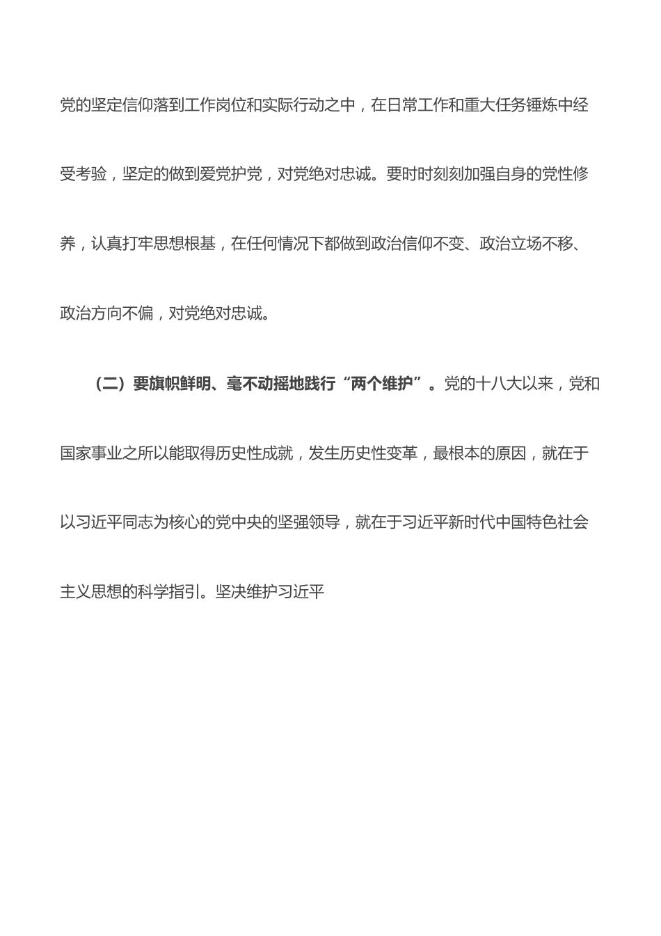 组织部长谈做到“两个维护”表态发言同志们:作为一名党员干部,一定要把对党的绝对忠诚,做到“两个维护”,视为坚定不移的政治品格,只有这样才能激励我们永葆初心、担当使命。下面,结合学习内容和我个人的思考,谈几点体会:一、“坚守绝对忠诚,做到‘两个维护’”的重要意义与根本要求(一)要在立场坚定中树立绝对忠诚的理念。天下至德,莫大于忠。我们中国共产党人,入党之日就宣誓要对党绝对忠诚,这是共产党人的政治灵魂,是共产党人经受住任何考验的精神支柱,饱含了我们对共产主义事业的坚定信仰。历史经验也告诉我们只有忠诚于党,始终以党的旗帜为旗帜,以党的方向为方向,以党的意志为意志,才能找准人生目标,把正前进方向。我们要自觉把对党的坚定信仰落到工作岗位和实际行动之中,在日常工作和重大任务锤炼中经受考验,坚定的做到爱党护党,对党绝对忠诚。要时时刻刻加强自身的党性修养,认真打牢思想根基,在任何情况下都做到政治信仰不变、政治立场不移、政治方向不偏,对党绝对忠诚。(二)要旗帜鲜明、毫不动摇地践行“两个维护”。党的十八大以来,党和国家事业之所以能取得历史性成就,发生历史性变革,最根本的原因,就在于以习近平同志为核心的党中央的坚强领导,就在于习近平新时代中国特色社会主义思想的科学指引。坚决维护习近平总书记党中央的核心、全党的核心地位,维护党中央权威和集中统一领导,是党和国家前途命运所系,是全国各族人民根本利益所在,是最根本的政治纪律和政治规矩,在任何时候、任何地方所有共产党都必须旗帜鲜明、毫不动摇地加以维护。(三)要在工作实践中率先垂范诠释绝对忠诚。“以令率人,不若身先”党员领导干部要在对党忠诚中坚定地走在前面,无论在任何时候,面临任何情况,面对任何任务,都要听党话、跟党走,无条件执行党的决策指示。我们只有自己过得硬,腰板挺得直,说话才有底气,行事才有分量,党的各项事业才会得到社会各界和人民群众有力支持。在实际工作中,对我们党员领导干部而言,体现对党绝对忠诚和“两个维护”的根本表现就是要把我们的一切言行都置于党章党规党纪要求之中,把我们的一切工作都置于党的路线方针政策之中,对党忠诚老实,为党奉献奋斗。二、严肃检视自身存在的问题(一)对理论和政策学习还不够到位。对理论武装头脑的紧迫性认识不足,学习不系统,碎片化,一般通读多,重点精读少,在潜意识上有“吃老本”的思想。(二)在履行党建职责的担当作为上做得还不够好。抓软弱涣散村工作不到位,一村一策措施不够精准,对整改工作的标准要求的不够高。(三)发展村集体经济工作还有不足,推进不够平衡。有工作基础的乡镇街道推进较好,能够实现所有村全部脱壳。工作基础差的推进不力,项目争取不到位,工作进展缓慢。(四)工作作风方面还有不足。深入基层的程度、频次不够,到自己联系的乡镇多,到其它乡镇少,到市直单位也较少。(五)关心关爱干部不够。在干部患病、家庭出现重大变故等时刻,组织关心爱护不及时,对干部心理疏导措施少。存在这些问题的主要原因:在思想建设方面:日常工作生活中只注重了工作大局,在大是大非面前能够保持清醒的头脑,但忽略了日常积累,特别是对学习坚持得不够。自己应当充分认识到所谓九层之台、起于垒土,合抱之木、生于毫末,一切质的飞跃,都是由量的积累所造就的,也只有把功夫下在平常,利用好经常,通过利用好在车上、在睡前这些点滴时间,多读原著、学原文、悟原理,了解最新的党的方针理论,让所有碎片时间化零为整,积少成多,从而不断丰厚自身的理论基础,提高自身的政治素养。在具体工作方面:日常重视对组织工作的思考谋划,重视研究贯彻执行上级的文件要求,这种情况造成了深入基层的次数较少,了解基层党员干部群众的所思所想所盼还不够深入具体。对基层党支部的党建工作过多注重了面上的谋划,对点的关注还没有做到细致具体,在抓两头带中间的过程中,对先进典型相对比较用力,个别软弱涣散基层党支部研究帮扶得还不到位。在对干部的管理中,作为一名管干部的干部,在日常工作生活中观察、了解每位干部的工作状态和心理状态是基本的工作任...