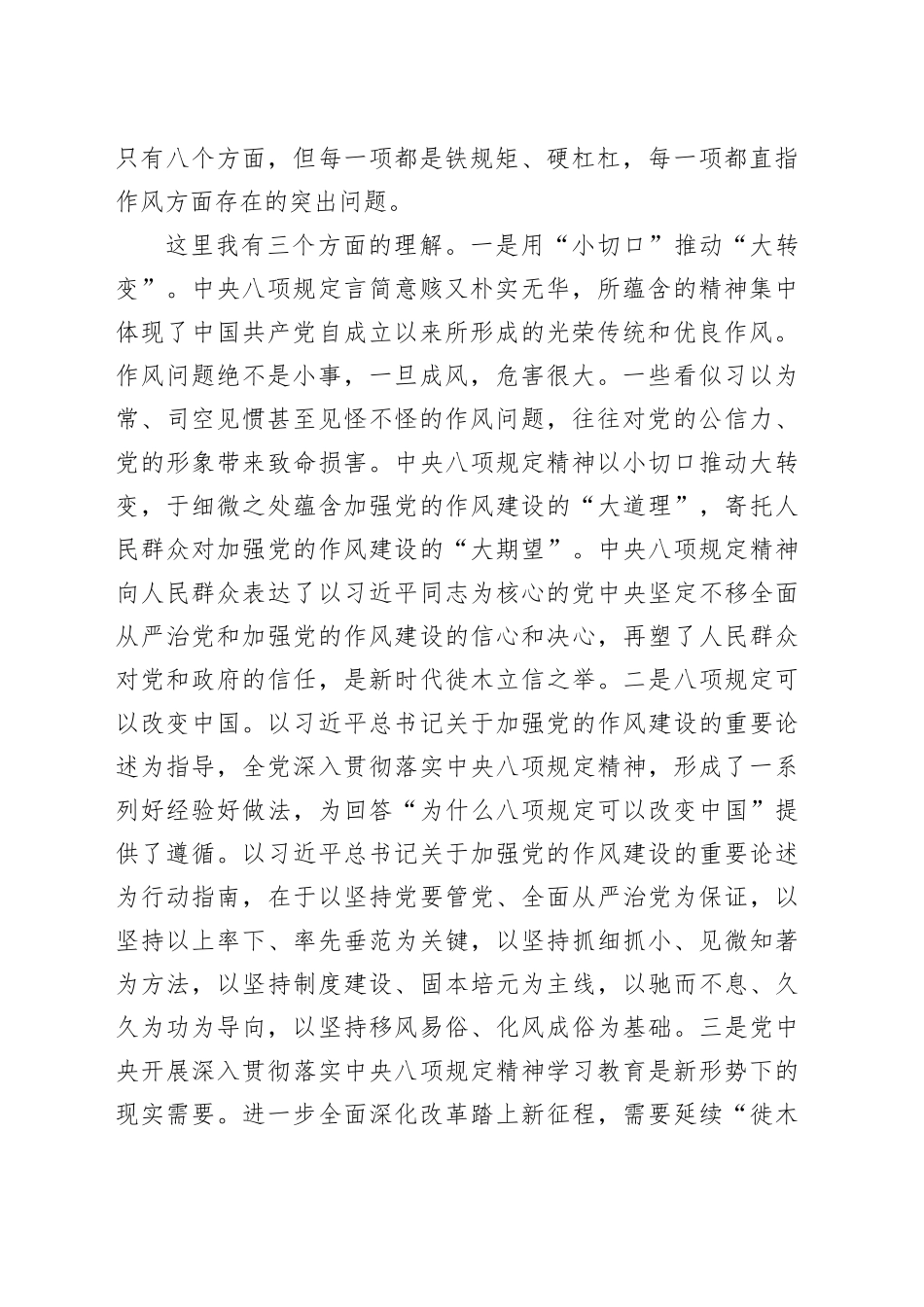 深入贯彻中央八项规定精神学习教育研讨发言提纲:以高度的政治自觉贯彻落实中央八项规定及其实施细则精神各位领导、同志们:开展深入贯彻中央八项规定精神学习教育是以习近平同志为核心的党中央作出的重大决策,是纵深推进全面从严治党的重要举措,是密切党群、干群关系的必然要求,是提升干事创业精气神的现实需要。中央八项规定是我们改进作风的第一步,是我们作为共产党人应该做到的基本要求,而非最高标准,更不是最终目的。党员干部要提高政治站位,增强政治自觉,切实把思想和行动统一到党中央决策部署上来,下真功、见实效,做到党性党风党纪一起抓、正风肃纪反腐相贯通,推动全面从严治党向纵深发展,为推进工作现代化提供有力保障。这里,聚焦研讨主题,与大家分享三点想法。一、彰显全面从严治党坚定信心,推动党风政风和社会风气大转变中央八项规定及其实施细则精神的核心要义在于反“四风”,锤炼党性,确保党员干部廉洁从政,担当作为,密切党群干群关系,夯实执政之基,净化政治生态。面对严峻复杂的形势,以习近平同志为核心的党中央适时制定中央八项规定,标志着新时代全面从严治党开局破题。中央八项规定虽然看似只有八个方面,但每一项都是铁规矩、硬杠杠,每一项都直指作风方面存在的突出问题。这里我有三个方面的理解。一是用“小切口”推动“大转变”。中央八项规定言简意赅又朴实无华,所蕴含的精神集中体现了中国共产党自成立以来所形成的光荣传统和优良作风。作风问题绝不是小事,一旦成风,危害很大。一些看似习以为常、司空见惯甚至见怪不怪的作风问题,往往对党的公信力、党的形象带来致命损害。中央八项规定精神以小切口推动大转变,于细微之处蕴含加强党的作风建设的“大道理”,寄托人民群众对加强党的作风建设的“大期望”。中央八项规定精神向人民群众表达了以习近平同志为核心的党中央坚定不移全面从严治党和加强党的作风建设的信心和决心,再塑了人民群众对党和政府的信任,是新时代徙木立信之举。二是八项规定可以改变中国。以习近平总书记关于加强党的作风建设的重要论述为指导,全党深入贯彻落实中央八项规定精神,形成了一系列好经验好做法,为回答“为什么八项规定可以改变中国”提供了遵循。以习近平总书记关于加强党的作风建设的重要论述为行动指南,在于以坚持党要管党、全面从严治党为保证,以坚持以上率下、率先垂范为关键,以坚持抓细抓小、见微知著为方法,以坚持制度建设、固本培元为主线,以驰而不息、久久为功为导向,以坚持移风易俗、化风成俗为基础。三是党中央开展深入贯彻落实中央八项规定精神学习教育是新形势下的现实需要。进一步全面深化改革踏上新征程,需要延续“徙木立信”的传统;人民群众对党的作风建设提出了深入要求;基层党员干部需要释放新活力;反腐败斗争提出新挑战,以作风建设的成效预防腐败问题的发生,阻断风腐转换的渠道;党员思想认识面临新情况,必须再次给全党拧紧纪律规矩的“发条”,推动纪律规矩“化风成俗”,增强贯彻落实中央八项规定精神的自觉性。二、展现敢于刀刃向内的强大勇气,为推进中国式现代化建设提供坚强作风保障中央八项规定制定实施以来,我们党坚持以零容忍的态度坚持不懈整治“四风”,集中力量整治人民群众反映强烈的形式主义和官僚主义、干部作风不严不实、侵害群众利益等突出问题,坚决破除特权思想和特权行为,对享乐主义、奢靡之风等歪风陋习露头就打,剜除了腐败溃烂的毒疮,保证了党的肌体健康,永葆了党的纯洁性,促进政治生态“改土换水”、出清向好。对于全面从严治党永远在路上,积极参与开展好本次学习教育,我认为要做好三个方面。一是深研细悟、常学常新。开展深入贯彻中央八项规定精神学习教育,学好习近平总书记关于加强党的作风建设的重要论述和中央八项规定及其实施细则精神是第一步。这种学习不是简单的条文记忆,而是触及灵魂的思想洗礼,是运用马克思主义立场观点方法解决作风问题的思想武装。要摒弃“雨过地皮湿”式的浅尝辄止,全面学、系统学、经常学,深入思考、深刻领会,着力提高政治判断力、政治领悟力、政治执行力,明确什么能干、什么不能干,与时...