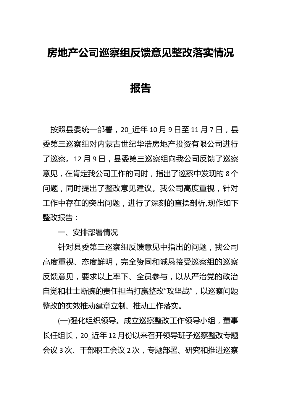 房地产公司巡察组反馈意见整改落实情况报告按照县委统一部署,20_近年10月9日至11月7日,县委第三巡察组对内蒙古世纪华浩房地产投资有限公司进行了巡察。12月9日,县委第三巡察组向我公司反馈了巡察意见,在肯定我公司工作的同时,指出了巡察中发现的8个问题,同时提出了整改意见建议。我公司高度重视,针对工作中存在的突出问题,进行了深刻的查摆剖析,现作如下整改报告:一、安排部署情况针对县委第三巡察组反馈意见中指出的问题,我公司高度重视、态度鲜明,完全赞同和诚恳接受巡察组的巡察反馈意见,要求以上率下、全员参与,以从严治党的政治自觉和壮士断腕的责任担当打赢整改“攻坚战”,以巡察问题整改的实效推动建章立制、推动工作落实。(一)强化组织领导。成立巡察整改工作领导小组,董事长任组长,20_近年12月份以来召开领导班子巡察整改专题会议3次、干部职工会议2次,专题部署、研究和推进巡察反馈问题整改落实工作。(二)抓实责任分解。经多次完善,形成了《关于落实县委第三巡察组反馈意见的整改方案》,根据《巡察反馈问题整改清单》,领导班子主动辨析问题,班子成员和科室负责人主动认领问题、划定责任,上下层层带动,深入分析查找问题的根源,制定巡察整改问题台账,逐项制定整改落实的举措;把整改事项落实到责任领导、责任科室和具体责任人,明确了完成目标和时限,要求不回避立行立改不敷衍改出成效,确保一件一件落实、一条一条兑现。二、整改落实情况(一)聚焦贯彻落实党的路线方针政策和党中央决策部署情况,推动被巡察党组织和党员干部践行党的初心使命,做到“两个维护”方面。1.存在问题:学习制度不健全,对____重要思想和全面扩大开放重要指示精神缺乏系统全面的学习,没有制定学习计划,未撰写学习心得。整改措施:进一步完善健全学习制度,围绕增强党员干部的责任感和主动性,用好“学习强国”等教育_台,有针对性地抓好党员学习培训,学习____,坚持读原文、悟原理,用党的最新理论武装头脑、指导实践、推动工作。整改完成情况:制定了党的十九大精神和____学习计划,撰写了学习心得等,现已全部整改完成。2.存在问题:落实中央关于加强国有企业党的建设部署要求行动迟缓。整改措施:贯彻落实《关于在深化国有企业改革中坚持党的领导加强党的建设的若干意见》,坚持和加强党的全面领导。整改完成情况:认真深入的学习了《关于在深化国有企业改革中坚持党的领导加强党的建设的若干意见》,现已全部整改完成。3.存在问题:现代企业制度建立不完善。整改措施:逐步健全公司人才绩效考核、财务管理等规章制度。整改完成情况:制定了详细的绩效考核、财务管理制度,现已全部整改完成。4.存在问题:党组对意识形态工作的重要性认识不足,缺乏总体规划部署。整改措施:落实意识形态工作责任制,把意识形态工作纳入干部学习、民主生活会、述职报告内容,党组定期研究、定期向县委意识形态领导小组报告工作。抓好意识形态舆论引导工作,旗帜鲜明针对重点部位和薄弱环节开展监管。整改完成情况:成立了公司小组,严格认真的向县委领导小组定期报告工作,现已全部整改完成。(二)聚焦群众身边腐败问题和不正之风,切实增强群众获得感幸福感安全感方面5.存在问题:财经纪律执行不严格、不规范。整改措施:明确各类各项支出费用要有相应的文件支撑或部务会记录。组织财务人员完善了账务流程、严格落实财务制度。整改完成情况:将未附的协议书、合同书等补充到财务账簿,现已全部整改完成。(三)聚焦基层党组织软弱涣散、组织力欠缺问题,强化政治功能,打造坚强战斗堡垒方面6.存在问题:公司法人结构不合理。整改措施:进一步学习相关法律法规,完善企业相关制度,全面推进企业依法治企。整改完成情况:深入学习公司法,逐步完善法人结构。7.存在问题:党支部战斗堡垒作用发挥不充分整改措施:指派专人负责“主题党日”活动的开展和记录。指派专人定期参加组织部开展的党建业务培训会。健全党支部“三会一课”的会议记录。整改完成情况:制定详细的学习计划,完善“三会一课”的会议记录,现已全部整改完成。8.存在问题:落实全面从严治党“两个责任”不够有...
