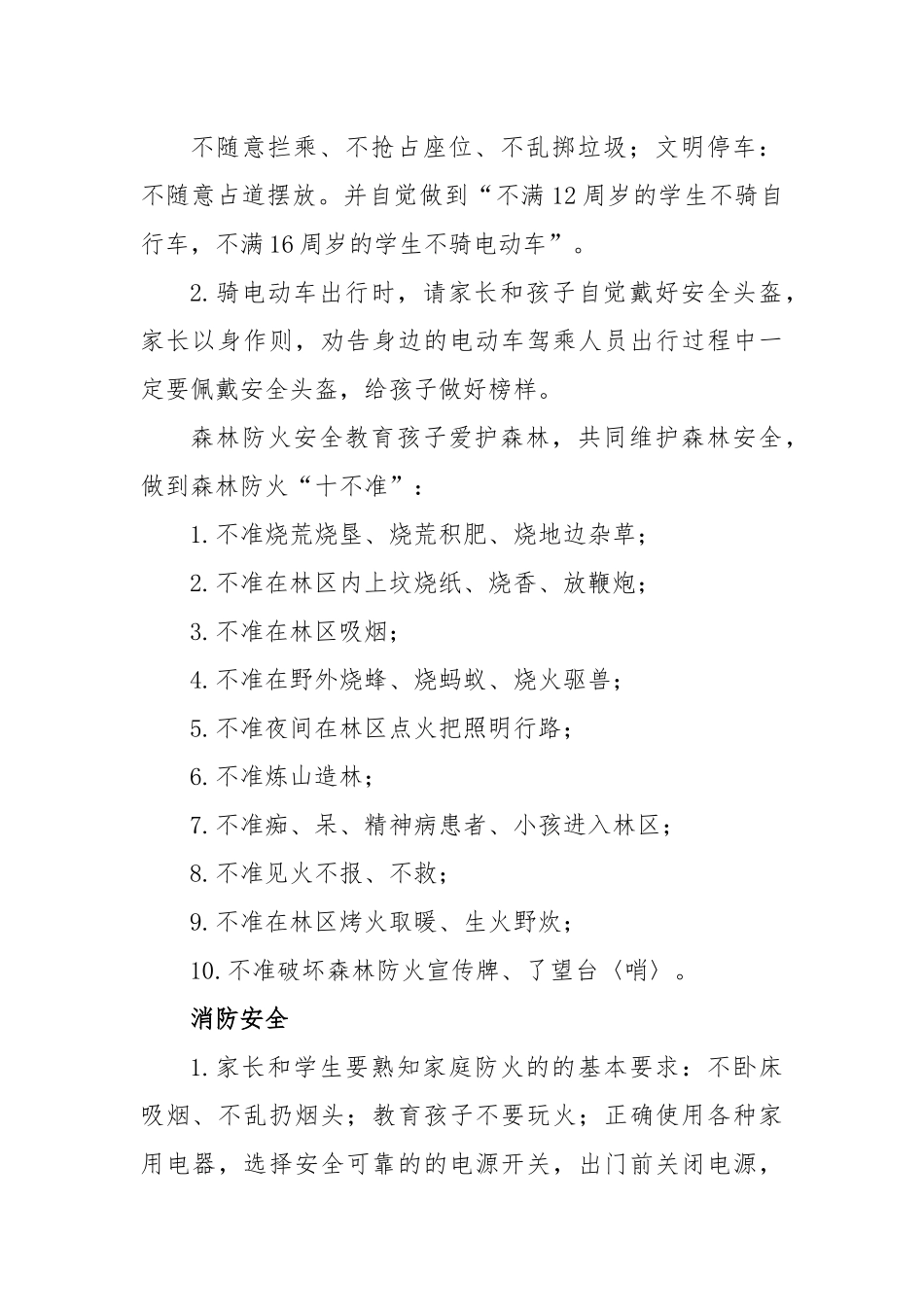 学校安全告家长书尊敬的家长:您好!孩子的安全关系到每一个家庭的幸福,为了避免安全事故的发生,我们恳请各位家长密切配合,务必增强安全意识和监护意识,切实承担起监护责任,加强对孩子的教育和管理。现提醒家长教育孩子做到以下几点:预防溺水1.教育孩子不去河、湖、水边玩耍,做到“六不准”(即不准私自下水游泳;不准擅自与他人结伴游泳;不在无家长陪伴的情况下游泳;不准到不熟悉的水域游泳;不准到无安全设施、无救护人员的水域游泳;不准不会水性的学生擅自下水施救)。2.提醒孩子做到“四不要”(即不要在没有家长陪同下私自下水游泳;不要在未设置警示标识的水域游泳;不要在没有安全保障的地方和野外的水源地游泳;不要在上下学的途中和度假期在水源周边戏水)。3.时刻关注孩子的去向,做到“四知”(即知去向;知活动内容;知同伴;知归时)。交通安全1.教育孩子外出时必须严格遵守交通规则,遵守文明公约:不闯红灯、不走车行道、不乱穿马路、不攀越交通护栏、不沿马路并肩行走;文明乘车:不乱上乱下、不强行上下、不随意拦乘、不抢占座位、不乱掷垃圾;文明停车:不随意占道摆放。并自觉做到“不满12周岁的学生不骑自行车,不满16周岁的学生不骑电动车”。2.骑电动车出行时,请家长和孩子自觉戴好安全头盔,家长以身作则,劝告身边的电动车驾乘人员出行过程中一定要佩戴安全头盔,给孩子做好榜样。森林防火安全教育孩子爱护森林,共同维护森林安全,做到森林防火“十不准”:1.不准烧荒烧垦、烧荒积肥、烧地边杂草;2.不准在林区内上坟烧纸、烧香、放鞭炮;3.不准在林区吸烟;4.不准在野外烧蜂、烧蚂蚁、烧火驱兽;5.不准夜间在林区点火把照明行路;6.不准炼山造林;7.不准痴、呆、精神病患者、小孩进入林区;8.不准见火不报、不救;9.不准在林区烤火取暖、生火野炊;10.不准破坏森林防火宣传牌、了望台〈哨〉。消防安全1.家长和学生要熟知家庭防火的的基本要求:不卧床吸烟、不乱扔烟头;教育孩子不要玩火;正确使用各种家用电器,选择安全可靠的的电源开关,出门前关闭电源,定期排查家中电器、电线、设备是否存在安全隐患,不使用“三无电器”;在家庭中配备必要的灭火器材。2.指导孩子学习并掌握消防安全基本知识,懂得预防火灾的方法,懂得如何使用灭火器,懂得通过消防通道疏散和应急逃生方法。家庭储备75°酒精、84消毒液等消毒物品,存放的位置要避免高温,严禁接触火源,严禁孩子碰触此类物品。饮食安全1.教育孩子提高食品安全防范意识,注意饮食安全。不吃过期变质的食物,尽量选择新鲜的食品,少吃冷饮,不可暴饮暴食,警惕急性肠道传染病。2.引导孩子购买食物时,注意食品包装有无生产厂家、生产日期,保质期,食品原料等内容,不能购买三无产品不吃没有卫生保障的食品,不吃没有清洗干净的食物,不喝生水;帮助孩子养成合理、良好的饮食习惯。心理安全孩子的成长需要父母的陪伴,家长要多与孩子沟通交流,关心孩子的生活和学习,切忌用粗暴的方式教育子女营造愉快的家庭氛围,教育孩子树立正确的人生观、价值观,学会与人沟通、与人和睦相处,学会倾听与倾诉,遇事不走极端。网络安全提醒孩子提高自我防备,注意个人信息的保护,不要将重要的信息如家庭地址、个人电话等告诉陌生人。不要轻信网友,远离校园贷款、网络诈骗。不沉迷于手机或网络游戏,要文明上网,讲求网络道德,不登录不健康的网站。同时注意控制上网时间,保护视力。孩子的安全是您和我们最大的牵挂,希望各位家长能以孩子安全为重,配合学校做好以上工作。根据自己孩子的性格特点,在涉及安全的各个方面做好安全教育和监护工作。家长们千忙万忙,对孩子安全教育不可忘,您们的一句话,一个提醒,可能会对孩子的人生产生毕生的影响孩子的健康成长,是家长们的幸福,是学校的欣慰,是祖国的期望。让我们密切配合,共同营造安全、祥和的育人氛围。