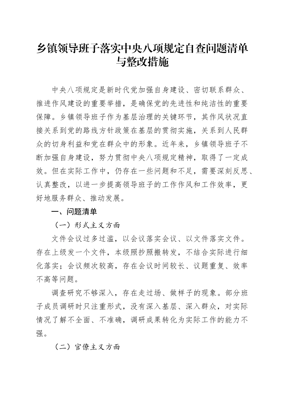 乡镇领导班子落实中央八项规定自查问题清单与整改措施中央八项规定是新时代党加强自身建设、密切联系群众、推进作风建设的重要举措,是确保党的先进性和纯洁性的重要保障。乡镇领导班子作为基层治理的关键环节,其作风状况直接关系到党的路线方针政策在基层的贯彻实施,关系到人民群众的切身利益和党在群众中的形象。近年来,乡镇领导班子不断加强自身建设,努力贯彻中央八项规定精神,取得了一定成效。但在实际工作中,仍存在一些问题和不足,需要深刻反思、认真整改,以进一步提高领导班子的工作作风和工作效率,更好地服务群众、推动发展。一、问题清单(一)形式主义方面文件会议过多过滥,以会议落实会议、以文件落实文件。存在上级发一个文件,本级照抄照搬转发,不结合实际进行细化落实;会议频次较高,存在会议时间较长、议题重复、效率不高等问题。调查研究不够深入,存在走过场、做样子的现象。部分班子成员调研时只注重形式,没有深入基层、深入群众,对实际情况了解不全面、不准确,调研成果转化为实际工作的能力不强。(二)官僚主义方面服务群众意识不强,存在推诿扯皮、敷衍塞责的现象。对群众的诉求关注不够,解决问题不及时、不彻底,存在“踢皮球”的现象;在接待群众来访时,态度生硬,缺乏耐心和热情。落实上级政策简单粗暴,不考虑基层实际困难。在执行上级政策时,存在生搬硬套、机械落实的情况,没有充分考虑乡镇的实际情况和群众的承受能力,导致政策落实效果不佳。(三)享乐主义方面公务接待超标准,存在铺张浪费现象。在公务接待中,偶尔存在超标准接待的情况,如提高接待规格、增加接待项目等;同时,对餐饮浪费现象制止不力,存在一定的铺张浪费行为。工作日午间饮酒问题。个别干部存在工作日午间饮酒的现象,影响了正常工作开展和工作效率。(四)奢靡之风方面公款吃喝、公款送礼现象偶有发生。在一些特殊节日或工作活动中,存在公款购买礼品、土特产等用于送礼的现象;部分干部存在违规接受管理服务对象宴请的情况。车辆管理不规范,存在公车私用、私车公养问题。个别干部存在公车私用的情况,如在非工作时间使用公车办理私事;同时,存在私车公养的现象,如使用单位加油卡为私车加油等。二、整改措施(一)整治形式主义精简文件会议,提高工作效率。严格控制文件数量,对可发可不发的文件坚决不发,对上级文件需结合实际进行转发的,要重点突出、简洁明了;合理安排会议,减少会议数量,控制会议时间,提高会议效率,确保会议质量和效果。加强调查研究,提高决策科学性。建立健全调查研究制度明确调研主题、内容和要求,确保调研深入基层、深入群众,了解真实情况;加强对调研成果的分析和应用,将其转化为实际工作的思路和措施,提高决策的科学性和合理性。(二)整治官僚主义强化服务意识,提高服务质量。加强干部宗旨意识教育,树立以人民为中心的发展思想,增强服务群众的自觉性和主动性;建立完善首问负责制、限时办结制等制度,明确工作职责和责任分工,确保群众诉求得到及时、有效的解决。加强政策宣传,确保政策落实到位。加大对上级政策的宣传力度,通过多种渠道和方式,向群众宣传政策内容,提高群众对政策的知晓率和理解度;在政策落实过程中,充分考虑基层实际困难,加强与上级部门的沟通协调,确保政策落实不走样。(三)整治享乐主义严格执行公务接待制度,杜绝铺张浪费。严格按照上级规定的接待标准执行公务接待,杜绝超标准接待现象;加强对公务接待的监督管理,定期对公务接待情况进行检查,发现问题及时纠正;倡导勤俭节约的风尚,加强对干部的教育引导,杜绝餐饮浪费行为。加强工作纪律检查,杜绝工作日午间饮酒问题。加大对工作纪律的检查力度,定期或不定期对干部工作纪律情况进行检查,尤其是工作日午间饮酒问题;对发现的违规饮酒行为,严肃处理,绝不姑息迁就。(四)整治奢靡之风加强廉洁自律教育,筑牢思想防线。定期组织干部学习党纪国法和廉洁自律有关规定,通过观看警示教育片、参观廉政教育基地等方式,加强对干部的廉洁自律教育,提高干部拒腐防变的能力。严肃财经纪律,加强对公款使用的监管。严格执行财务管理制...