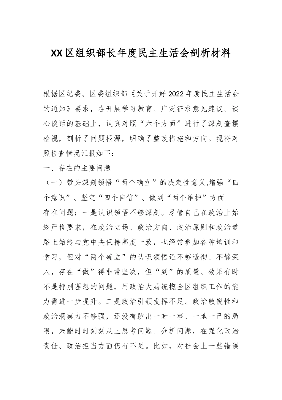 XX区组织部长年度民主生活会剖析材料根据区纪委、区委组织部《关于开好2022年度民主生活会的通知》要求,在开展学习教育、广泛征求意见建议、谈心谈话的基础上,认真对照“六个方面”进行了深刻查摆检视,剖析了问题根源,明确了整改措施和方向。现将对照检查情况汇报如下:一、存在的主要问题(一)带头深刻领悟“两个确立”的决定性意义,增强“四个意识”、坚定“四个自信”、做到“两个维护”方面存在问题:一是认识领悟不够深刻。尽管自己在政治上始终严格要求,在政治立场、政治方向、政治原则和政治道路上始终与党中央保持高度一致,也经常参加各种培训和学习,但对“两个确立”的认识领悟还不够透彻、不够深入,存在“做”得非常坚决,但“到”的质量、效果有时不是特别理想的问题,用政治大局统揽全区组织工作的能力需进一步提升。二是政治引领发挥不足。政治敏锐性和政治洞察力不够强,还没有跳出一时一事、一地一己的局限,未能时时刻刻从上思考问题、分析问题,在强化政治责任、政治担当方面仍有不足。比如,对社会上一些错误的政治言论,没有从政治的高度充分认识其严重危害性,没有旗帜鲜明地作坚决斗争和坚决制止,在将思想指引和行动指南贯通融通到具体的组织工作上还有欠缺。三是贯彻落实不够深入。贯彻执行上级精神有时习惯照搬照抄,结合实际分类指导、对症施策不够,落实上还存在跟不上、慢半拍、不到位的现象。比如,抓党建促基层治理能力提升,虽然建立了“街道党工委+社区党委+小区党支部+楼栋党小组+党员中心户”的组织架构,实际工作中党员主动参与小区治理积极性不高共驻共建形成合力不够,服务群众的成效有待提升。(二)带头用习近平新时代中国特色社会主义思想凝心铸魂方面存在问题:一是在学得“深”上有差距。日常学习主要是参加区委理论中心组学习、组织部部务会学习和个人自学多是看报纸、读文件、划重点、列条目,满足于一般性、概念化学习过程,真正对习近平新时代中国特色社会主义思想理解领悟得还不够深刻,对党的创新理论缺乏深钻细研的精神,离学而用、学而行还有很大差距。二是在站得“高”上有差距。不善于从更高的政治要求、政治影响、政治后果上分析思考问题,对一些苗头性、倾向性问题不够敏感,没有做到时时处处从政治上想问题、做决策、办事情,对新时代组织工作遇到的困境和难题,向党的创新理论问计问策不够主动,以理论的主动把握历史的主动还有不足。三是在看得“透”上有差距。不能透过现象看本质,对标往深里走、往心里走、往实里走,运用习近平新时代中国特色社会主义思想和党的创新理论指导、推进全区组织工作不到位。对主管和分管的组织、老干部、编制和党校工作等方面的要求和精神关注多、学得多,对分管以外的如生态文明、经济社会等方面知识学得不深、研究不多,系统性把握新理论、新观点、新战略不够,在知信合一、贯彻执行上还有差距。(三)带头坚持和加强党的全面领导方面存在问题:一是统筹全局意识不够强。作决策、抓工作还存在本位主义、实用主义,注重自己主管和分管的工作,缺乏战略高度、辩证思维。比如,作为牵头部门,抓党建促基层治理能力提升,从全局统筹谋划推进不够,调动各部门力量打好“组合拳”作用发挥不明显,基层治理工作仍有短板,统筹发挥职能作用还有待提升。二是破解难题能力待提升。思想上还存在认为组织工作程序严格、办事规范、原则性强,很多时候拘泥于上级的安排部署,凡事习惯找依据,执行规定动作多,创新自选动作少,有一些工作难题还没有拿出务实有效的创新举措。比如,在推进干部担当作为上,尽管连续几年开展评选,但激励干部担当作为方法手段单一、措施不够有力,鼓励创新、宽容失败、合理容错的正向激励机制还未真正形成。三是干部队伍建设有短板。2021年以来,干部队伍导向出了问题,选人用人坚持标准不好,发扬民主听取基层意见不够,人为造成遗留问题。比如,乡镇换届未继续提名的干部没有妥善安排,撤并的西贾乡一批干部没有安置,事业单位改革不彻底、人员不到位,教育系统选聘校长(园长)社会反响大。这些工作,我作为组织部长,坚持原则不够,监督把关不够,发挥作用不...
