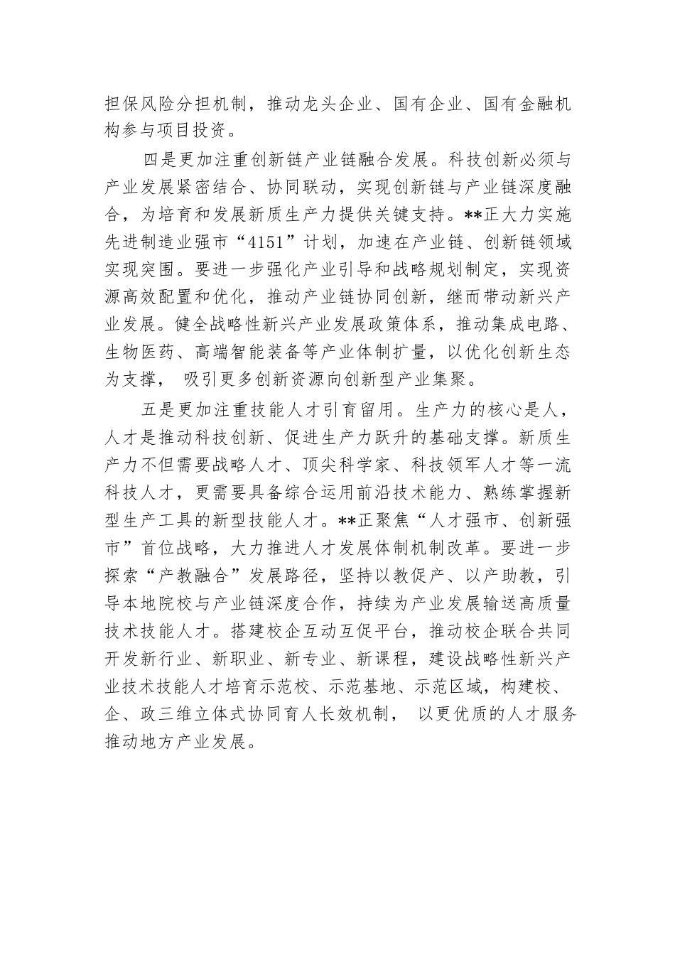 在2024年全省发展新质生产力座谈会上的汇报发言尊敬的各位领导,同志们:党的二十届三中全会要求“健全因地制宜发展新质生产力体制机制”“加快形成同新质生产力更相适应的生产关系”。市委九届六次全会指出,“聚力新质生产力发展,在建设现代化产业体系上打头阵当尖兵作示范”。当前,新质生产力已经在实践中形成并展示出对高质量发展的强劲推动力,逐渐成为未来城市竞争的新引擎。因地制宜发展新质生产力,需要与之相匹配的生产关系,而从本质上讲,营商环境即是各种生产关系的系统集成。对**而言,探索打造与新质生产力发展相适应的创新型营商环境,将是未来发展的一条必由之路。一是更加注重科创平台牵引驱动。科创平台是集聚人才、技术、资金等全量创新要素,有效整合政、产、学、研、用各类资源的综合型创新服务平台,也是推动新质生产力从“实验室”到“生产线”的关键载体。**正以建设科创走廊为牵引,加快打造高能级创新平台矩阵。要进一步把握前沿技术发展趋势,推动科创平台收敛聚焦主攻方向,以“小切口”带动“大突破”,加快形成“小而精”“小而专”“小而尖”的战略竞争优势。强化科创平台间联动协作,打造多级联动、梯次衔接的科创平台体系,加快高能级孵化器、众创空间等孵化平台建设,形成创新发展合力。鼓励民营经济参与科创平台建设,发挥平台企业、龙头企业、科技领军企业等主体的辐射带动作用,推动中小企业共建科创平台,形成大中小企业联动发展的创新格局。二是更加注重科技成果转化落地。科技成果转化是科技创新全过程的“最后一公里”,打通创新成果转化堵点,推动企业“样品”变“产品”、“产品”变“商品”,是新质生产力企业面临的重要挑战。**正实施“越快转”科技成果转化专项行动,打通科技成果转化“梗阻”。要进一步优化科技成果转化服务生态,整合各类科技要素资源,吸引评估咨询、转化交易、金融服务等服务机构集中入驻,打造集成果展示、技术交易、产业孵化、融资路演等功能于一体的成果转化服务平台。鼓励高校和科研院所建立科技成果转化运营机构或部门,加快培育并引进一批示范带动作用强、行业影响力大的技术转移机构。推动国有企业带头优先使用首台(套)装备、首批次材料、首版次软件等自主创新成果,为关键核心技术提供早期应用场景和试用环境。三是更加注重金融活水引聚浇灌。企业是科技创新主体,金融则是科技创新“血液”,是培育新质生产力的重要保障。**正不断做强做优科技金融这篇文章,全力发挥金融要素保障作用。要进一步发展“耐心资本”,构建信贷、债券、保险、创业投资、融资担保等多层次科技金融服务体系。完善基金考核指标体系,推动政府引导基金重点投向具有市场前景的实验室成果项目、中试研发项目、颠覆性技术项目。鼓励金融机构将“科创指数”作为企业融资授信的依据,建立融资担保风险分担机制,推动龙头企业、国有企业、国有金融机构参与项目投资。四是更加注重创新链产业链融合发展。科技创新必须与产业发展紧密结合、协同联动,实现创新链与产业链深度融合,为培育和发展新质生产力提供关键支持。**正大力实施先进制造业强市“4151”计划,加速在产业链、创新链领域实现突围。要进一步强化产业引导和战略规划制定,实现资源高效配置和优化,推动产业链协同创新,继而带动新兴产业发展。健全战略性新兴产业发展政策体系,推动集成电路、生物医药、高端智能装备等产业体制扩量,以优化创新生态为支撑,吸引更多创新资源向创新型产业集聚。五是更加注重技能人才引育留用。生产力的核心是人,人才是推动科技创新、促进生产力跃升的基础支撑。新质生产力不但需要战略人才、顶尖科学家、科技领军人才等一流科技人才,更需要具备综合运用前沿技术能力、熟练掌握新型生产工具的新型技能人才。**正聚焦“人才强市、创新强市”首位战略,大力推进人才发展体制机制改革。要进一步探索“产教融合”发展路径,坚持以教促产、以产助教,引导本地院校与产业链深度合作,持续为产业发展输送高质量技术技能人才。搭建校企互动互促平台,推动校企联合共同开发新行业、新职业、新专业、新课程,建设战略性新兴产业技术技能人才培...
