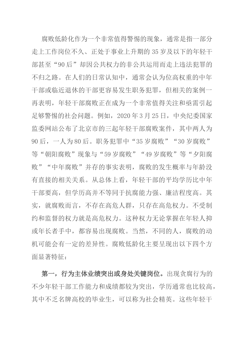 在干部年轻化这一用人导向的指引下,越来越多的年轻干部走上了领导岗位,成为事业发展的中坚力量。但从近年来纪检监察部门发布的违规违纪违法案件来看,与干部队伍年轻化趋势相伴随的是,年轻干部腐败案件时有发生,腐败低龄化现象突显。习近平总书记在中央党校(国家行政学院)中青年干部培训班开班式上强调:“年轻干部要时刻警醒自己,培育积极健康的生活情趣,坚决抵制享乐主义、奢靡之风,永葆共产党人清正廉洁的政治本色。”党的十九届中央纪委五次全会也特别指出,要“高度关注年轻干部违纪违法问题,加强教育管理监督。”有鉴于此,系统总结腐败低龄化的主要特征,深入考察腐败低龄化的成因,针对性地设计预防腐败低龄化的具体措施,就显得十分必要和紧迫。一、腐败低龄化的显著特征腐败低龄化作为一个非常值得警惕的现象,通常是指一部分走上工作岗位不久、正处于事业上升期的35岁及以下的年轻干部甚至“90后”却因公共权力的非公共运用而走上违法犯罪的不归之路。在人们的日常认知中,通常会认为位高权重的中年干部或临近退休的干部更容易发生职务犯罪,但相关的案例一再表明,年轻干部腐败正在成为一个非常值得关注和亟需引起足够警惕的社会问题。例如,2020年3月25日,中央纪委国家监委网站公布了北京市的三起年轻干部腐败案件,其中两人为90后,一人为80后。职务犯罪中“35岁腐败”“30岁腐败”等“朝阳腐败”现象与“59岁腐败”“49岁腐败”等“夕阳腐败”“中年腐败”并存的事实表明,腐败的发生概率与年龄没有直接的相关关系。从总体上看,年轻干部的平均学历比中年干部要高,但学历高并不等同于抗腐能力强、廉洁程度高。其实,就腐败而言,不存在高危人群,只存在高危权力。不受制约和监督的权力就是高危权力。这种权力无论掌握在年轻人抑或年长者手中,都容易出现腐败。当然,不同的人,腐败的动机可能会有一定的差异性。腐败低龄化主要呈现出以下四个方面显著特征:第一,行为主体业绩突出或身处关键岗位。出现贪腐行为的不少年轻干部工作能力和成绩都较为突出,学历通常也比较高,其中不乏名牌高校的毕业生,可以称为社会精英。这些年轻干部因为能力、业绩和学历出众,年纪轻轻就担任了一定的职务,有的还成为单位一把手。有的年轻干部虽然没有身居高位,但他们所在的部门或岗位经常是权力较为集中或资金较为密集的部门或岗位,因而手中往往也掌握着一定的权力或资源。也有的年轻干部只是普通的办事人员,工作业绩也不突出,但其占据了财务、出纳、税务等资金密集或权力集中的岗位,因而掌握了便于腐败的“小微职权”。例如,某县级市社保中心90后办事人员茆某利用职务便利,分46次贪污社保资金270余万元。第二,经济腐败为主且腐败目的多样。出现贪腐行为的年轻干部往往经受不住金钱的诱惑,其腐败问题以经济腐败为主,主要包括收受贿赂(如为商人谋求不正当利益并收受其贿赂的赃款、为亲朋好友多丈量拆迁房屋面积以套取征地补偿款并拿取一定的“回扣”)、贪污公款(如通过虚报项目的方式套取扶贫资金、利用职务之便和监管漏洞骗取社保基金)、挪用公款(如利用职务便利将单位公款挪为己用),等等。从腐败目的来看,具有多样性的特点。有的为了美色而腐,将贪腐所得用来频繁更换女友或包养多个情妇或打赏网络主播;有的为了赌博而腐,将贪腐所得拿到赌场寻求刺激;有的为了游戏而腐,将贪腐所得拿来升级游戏装备和购买游戏点卡。从查办的案件来看,无论出于何种目的,不少落网的年轻干部的涉案资金已经挥霍无几。第三,小吏大贪现象在违规违纪违法的年轻干部中较为突出。因为工作年限相对较短、年纪相对较轻,所以年轻干部的职务大多在科级、处级或科处级以下,有的年轻干部甚至没有担任领导职务或没有行政级别。当然,也有个别年轻干部担任单位主要领导甚至“一把手”。从总体上看,年轻干部的职务虽然不高,但是胆子却比较大,从事工作没多久就走上了非法敛财的违法犯罪道路,心中缺少对法律的基本敬畏,也没有起码的良知和道德底线,而且涉案金额经常比较大,小吏大贪现象在违规违纪违法的年轻干部中较为突出,其中贪腐金额超过我国《刑法》规定的三百万...