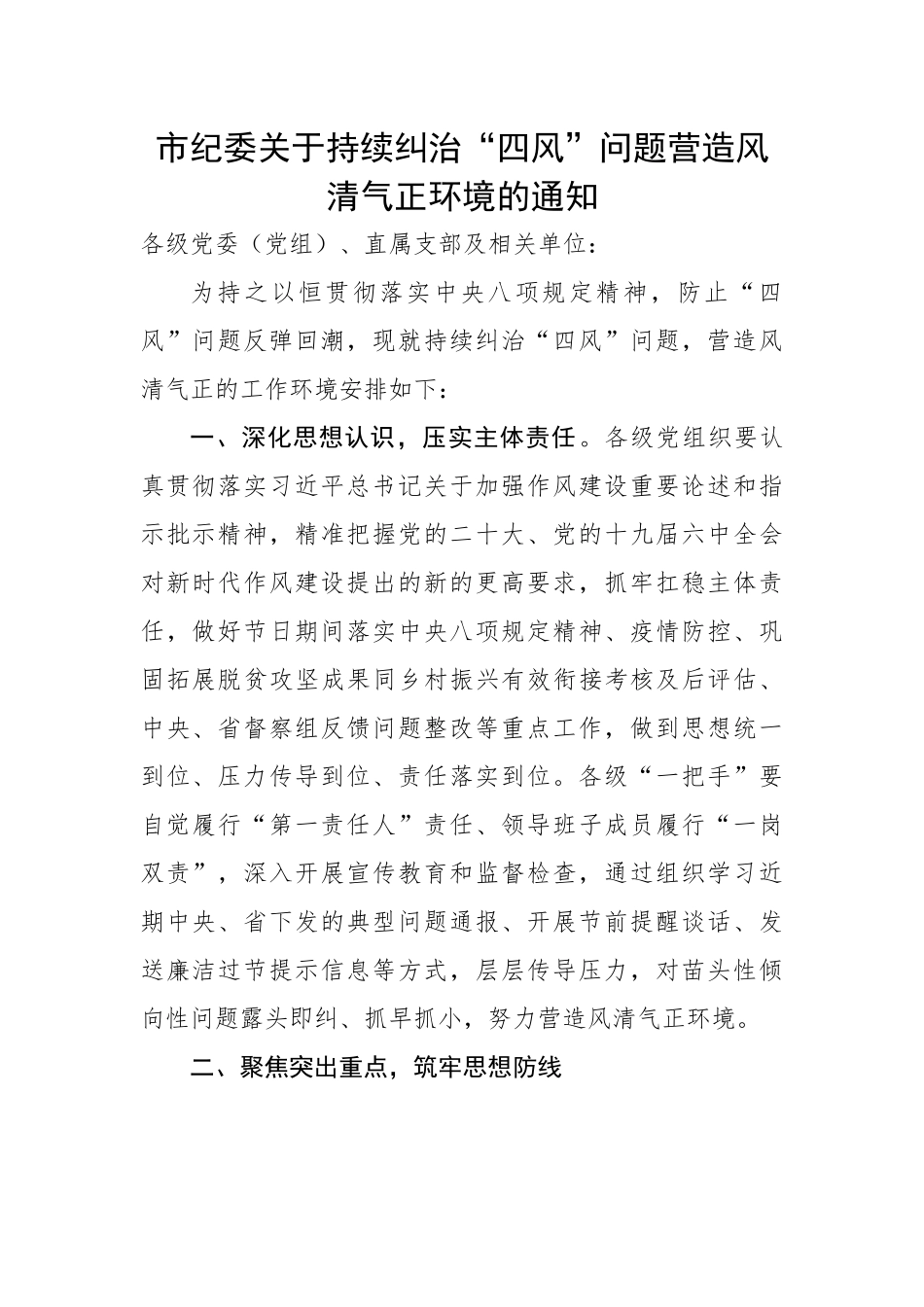 市纪委关于持续纠治“四风”问题营造风清气正环境的通知各级党委(党组)、直属支部及相关单位:为持之以恒贯彻落实中央八项规定精神,防止“四风”问题反弹回潮,现就持续纠治“四风”问题,营造风清气正的工作环境安排如下:一、深化思想认识,压实主体责任。各级党组织要认真贯彻落实习近平总书记关于加强作风建设重要论述和指示批示精神,精准把握党的二十大、党的十九届六中全会对新时代作风建设提出的新的更高要求,抓牢扛稳主体责任,做好节日期间落实中央八项规定精神、疫情防控、巩固拓展脱贫攻坚成果同乡村振兴有效衔接考核及后评估、中央、省督察组反馈问题整改等重点工作,做到思想统一到位、压力传导到位、责任落实到位。各级“一把手”要自觉履行“第一责任人”责任、领导班子成员履行“一岗双责”,深入开展宣传教育和监督检查,通过组织学习近期中央、省下发的典型问题通报、开展节前提醒谈话、发送廉洁过节提示信息等方式,层层传导压力,对苗头性倾向性问题露头即纠、抓早抓小,努力营造风清气正环境。二、聚焦突出重点,筑牢思想防线。各级党员干部特别是各级领导干部要坚定理想信念,增强组织纪律观念,不折不扣落实中央八项规定精神和省关于“八条禁令”,并对标“十四个严禁”,做好节日安排:严禁违规吃喝;严禁违规用公款购买赠送烟花爆竹、鲜花、烟酒食品、土特产等年货节礼;严禁以各种名义违规发放津补贴、奖金和实物;严禁违规用公款组织各类年会、节会、庆典等总结表彰活动;严禁公款旅游以及违规接受管理和服务对象等旅游活动安排;严禁违规使用公车或私车公养;严禁违规收送名贵特产和礼品、礼金、消费卡、有价证券等;严禁违规大操大办婚丧喜庆等事宜借机敛财;严禁违规出入私人会所;严禁组织或参加用公款支付的高消费娱乐健身等活动;严禁接受或提供可能影响公正执行公务的健身娱乐等活动;严禁违规参加各类老乡会、校友会、战友会;严禁在参加公务活动用餐或个人餐饮消费时铺张浪费;严禁奢侈浪费和其他各种违纪行为。三、坚持挺纪在前,严格监督执纪。各级纪检监察机关要切实担负起作风建设监督责任,紧盯酒店饭店会所、内部接待场所、旅游景点、窗口单位等4类场所。聚焦“四个着力”,即着力发现和查处通过物流快递等方式违规收送礼品、违规收送电子红包、违规接受管理和服务对象宴请、躲进内部场所公款吃喝、公务活动餐饮浪费、违规使用公车、违规发放津贴补贴、借操办婚丧喜庆之机收钱敛财等“节日病”;着力发现和查处以培训、考察、会议为名搞公款旅游,年底突击花钱搞“四风”问题;着力发现和查处窗口单位吃拿卡要、耍官威搞特权、冷硬横推等群众身边的腐败问题和不正之风;着力发现和整治在疫情防控、安全生产等领域落实责任不到位、推进工作不严不实,以及以总结部署工作等名义随意向基层派任务要材料等给基层造成严重负担的形式主义、官僚主义问题。采取明察暗访、随机抽查、突击检查等方式,既聚焦老问题、又紧盯新动向,及时发现和纠正“十四个严禁”问题,对发现的顶风违纪问题严查快处。全市各级党组织和纪检监察机关要严格执行重要节点值班、报告制度,对节日期间发现“四风”舆情反映、问题线索以及其他重要情况,第一时间向市纪委监委报告,对查处的典型案件指名道姓、通报曝光,对管党治党失职失责的,要坚决追究主体责任、领导责任,持续释放遵规守纪比平时要求更严、违纪失责比平时处理更重的强烈信号,不断巩固拓展作风建设成果。