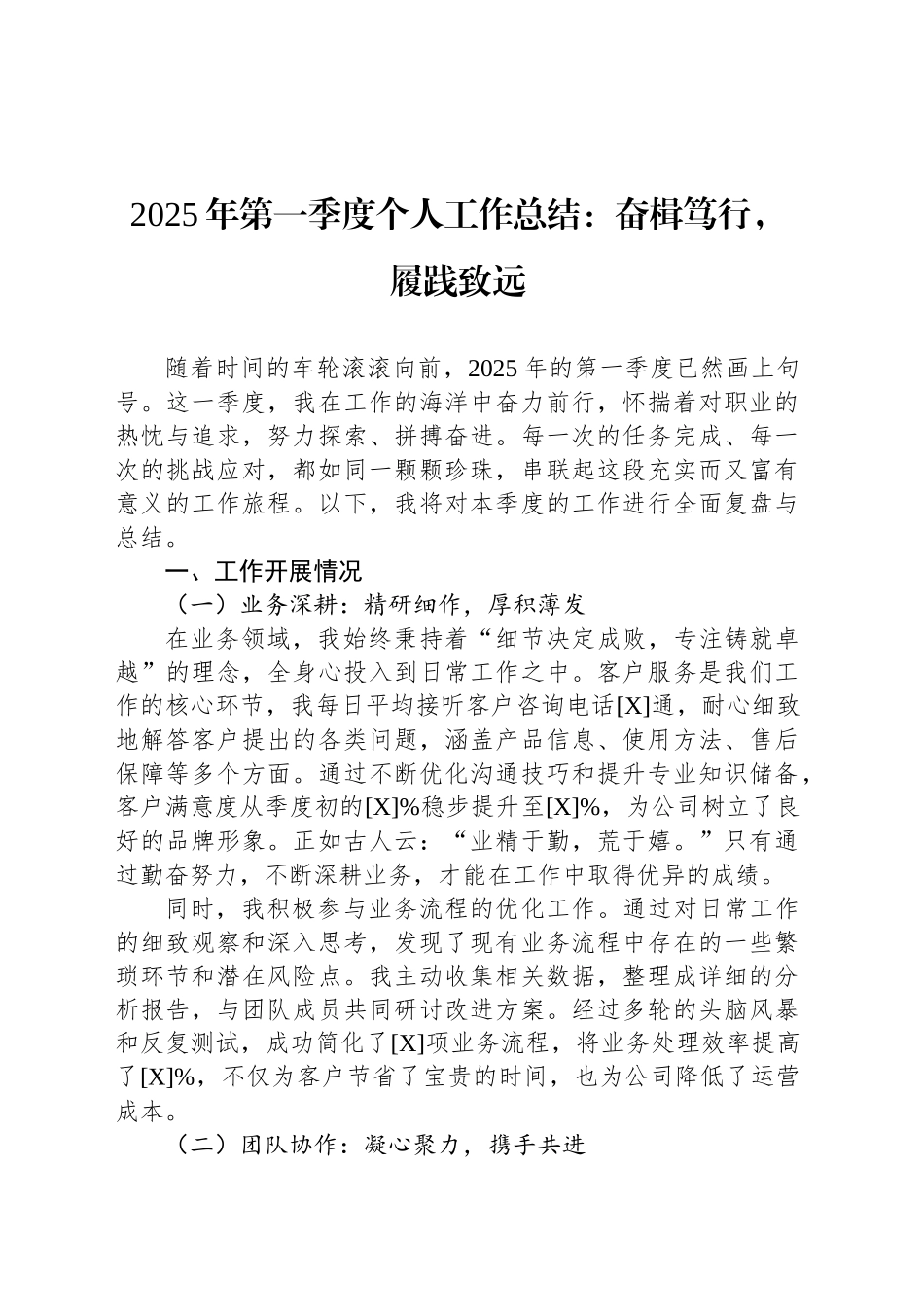 2025年第一季度个人工作总结:奋楫笃行,履践致远随着时间的车轮滚滚向前,2025年的第一季度已然画上句号。这一季度,我在工作的海洋中奋力前行,怀揣着对职业的热忱与追求,努力探索、拼搏奋进。每一次的任务完成、每一次的挑战应对,都如同一颗颗珍珠,串联起这段充实而又富有意义的工作旅程。以下,我将对本季度的工作进行全面复盘与总结。一、工作开展情况(一)业务深耕:精研细作,厚积薄发在业务领域,我始终秉持着“细节决定成败,专注铸就卓越”的理念,全身心投入到日常工作之中。客户服务是我们工作的核心环节,我每日平均接听客户咨询电话[X]通,耐心细致地解答客户提出的各类问题,涵盖产品信息、使用方法、售后保障等多个方面。通过不断优化沟通技巧和提升专业知识储备,客户满意度从季度初的[X]%稳步提升至[X]%,为公司树立了良好的品牌形象。正如古人云:“业精于勤,荒于嬉。”只有通过勤奋努力,不断深耕业务,才能在工作中取得优异的成绩。同时,我积极参与业务流程的优化工作。通过对日常工作的细致观察和深入思考,发现了现有业务流程中存在的一些繁琐环节和潜在风险点。我主动收集相关数据,整理成详细的分析报告,与团队成员共同研讨改进方案。经过多轮的头脑风暴和反复测试,成功简化了[X]项业务流程,将业务处理效率提高了[X]%,不仅为客户节省了宝贵的时间,也为公司降低了运营成本。(二)团队协作:凝心聚力,携手共进“孤举者难起,众行者易趋。”团队协作是推动工作顺利开展的强大动力。在第一季度,我积极融入团队,与同事们紧密配合,共同完成了多项重要任务。在团队讨论中,我充分发挥自己的主观能动性,积极分享自己的想法和经验,为团队出谋划策。在面对困难和挑战时,我与同事们相互支持、相互鼓励,共同寻找解决方案。例如,在一次重要的业务推广活动中,我们团队面临着时间紧、任务重、资源有限的多重压力。为了确保活动的顺利进行,我与负责策划的同事密切沟通,根据目标客户群体的特点和需求,共同制定了极具针对性的推广方案;与负责执行的同事紧密协作,合理分配工作任务,确保各项工作有条不紊地推进;与负责后勤保障的同事积极配合,及时解决活动中出现的各种问题。在大家的共同努力下,此次活动取得了圆满成功,超出预期目标[X]%,极大地提升了公司的市场知名度和产品销量。(三)自我提升:学无止境,精进不休在这个快速发展的时代,只有不断学习,才能跟上时代的步伐,不被淘汰。本季度,我利用业余时间广泛学习专业知识,阅读了[X]本行业相关书籍,参加了[X]次线上培训课程,深入学习了最新的行业动态、市场趋势和专业技能。通过学习,我不仅拓宽了自己的知识面,还提升了自己的专业素养和综合能力。同时,我注重将所学知识应用到实际工作中,不断进行实践和创新。例如,在客户服务工作中,运用所学的沟通技巧和心理学知识,更好地理解客户的需求和情绪,为客户提供更加优质、个性化的服务;在业务流程优化工作中,借鉴所学的项目管理方法和数据分析工具,使优化方案更加科学、合理,实施过程更加高效、可控。二、存在问题(一)工作效率仍需提高在面对多项任务并行的情况时,有时会出现手忙脚乱、顾此失彼的现象,导致工作效率低下。例如,在处理客户咨询电话的同时,还要完成业务报表的制作和数据整理工作,由于没有合理安排时间和任务优先级,常常会出现工作延误的情况。这反映出我在时间管理和任务规划方面还存在不足,需要进一步学习和改进。(二)沟通能力有待加强在与同事和客户沟通时,有时会因为表达不够清晰、准确导致信息传递出现偏差,影响工作进度和效果。比如,在向客户介绍产品时,使用了过多的专业术语,没有考虑到客户的接受程度,导致客户对产品的理解出现困难;在与同事沟通工作时,没有充分听取对方的意见和建议,过于强调自己的观点,容易引发不必要的矛盾和误(三)创新思维不足在工作中,习惯于按照传统的思维方式和工作方法来解决问题,缺乏创新意识和突破精神。当遇到新的挑战和问题时,往往不能迅速地提出创新性的解决方案,而是依赖于以往的经验和做法。这在一定程度上限制了工作的效率和质量,也不利...