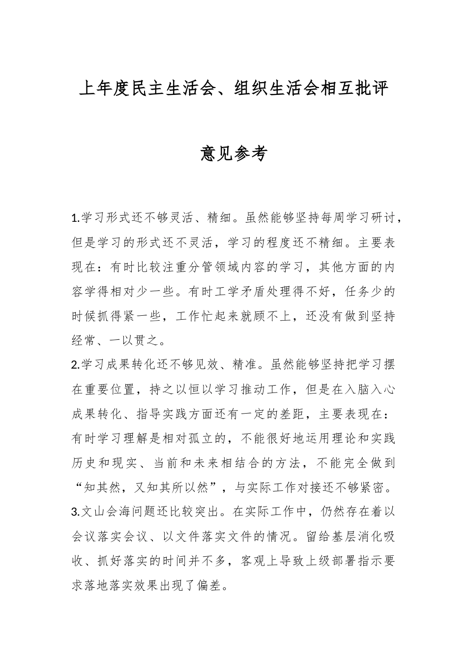 上年度民主生活会、组织生活会相互批评意见参考1.学习形式还不够灵活、精细。虽然能够坚持每周学习研讨,但是学习的形式还不灵活,学习的程度还不精细。主要表现在:有时比较注重分管领域内容的学习,其他方面的内容学得相对少一些。有时工学矛盾处理得不好,任务少的时候抓得紧一些,工作忙起来就顾不上,还没有做到坚持经常、一以贯之。2.学习成果转化还不够见效、精准。虽然能够坚持把学习摆在重要位置,持之以恒以学习推动工作,但是在入脑入心成果转化、指导实践方面还有一定的差距,主要表现在:有时学习理解是相对孤立的,不能很好地运用理论和实践历史和现实、当前和未来相结合的方法,不能完全做到“知其然,又知其所以然”,与实际工作对接还不够紧密。3.文山会海问题还比较突出。在实际工作中,仍然存在着以会议落实会议、以文件落实文件的情况。留给基层消化吸收、抓好落实的时间并不多,客观上导致上级部署指示要求落地落实效果出现了偏差。4.真抓实干意识还不强。工作急于求成,想尽快出几个亮点、干几件大事,让党员感觉有所作为,让上级看着有新业绩,说穿了是缺少一心为公、一心为了党员和服务对象的政治胸怀,没有严格做到习近平总书记要求的“谋事要实、创业要实、做人要实”。5.管理措施还不完善。干部任用考核上,动态管理、系统评价的体系还不完备,政治、品行、作风、廉洁的评价标准还比较粗糙,重选轻管的问题还不同程度存在。对党员的管理,也更多停留在人管人上,绩效管理、目标管理的机制比较欠缺,更多的还是靠党员的自觉、领导的要求,激发党员积极性、主动性上做的工作不够。6.理想信念不坚定,精神状态懈怠。具体来说。一是政治站位不高,对思想政治建设重要性认识不足。面对当前新形势新要求,把更多精力放在促进经济发展等“硬指标”上把政治理论学习当成了“软指标”。认为只要把主要精力放在抓落实、做具体工作上,政治上不出大问题就可以了从而淡化政治学习和党性修养,疏于学习提升,思想上放松了警惕。7.缺乏敬畏之心,对落实党要管党、从严治党方针的重要性紧迫性认识还不深刻,有松懈思想。有的同志在思想上有惰性,奉行经验主义、实用主义、本本主义。固守陈腐的观念、传统的习惯、往日的经验,忙于日常事务,学习兴趣不高,态度消极。对落实工作有用的学一点,关系不大的就放一放,生搬硬套,学习效果不明显。8.自我要求松懈,缺乏责任担当。不愿多干事,不想多谋事,只求平稳过渡,缺乏担当。个别同志对于不属于自己分管的工作,能够不管的就尽量不管,事不关己高高挂起;还有一些同志害怕得罪人,不敢说真话,该提醒的时候碍于情面没有及时提醒,该发表意见的时候也很少作声,表面上看是“当好人、做好人”,其实是“私心”在作怪。9.工作落实上存在的种种问题,究其原因在于有的同志责任意识弱化,担当意识不强,主动性、创造性开展工作能力不够,面对工作任务存在抵触心理,甚至找借口、片面强调困难,不能主动担当、直面困难、解题破题。在服务发展上出现的偏差,根本原因在于班子成员本领恐慌意识在下降,对于新发展理念缺乏深入细致学习,没有学通弄懂何谈落地落实?尤其是今年以来,面对新形势新任务新挑战,不能从自身出发加强学习,不能主动更新知识体系、思想观念和工作方法,造成了新发展理念落实效果不佳。10.对基层和党员反映强烈的问题,不能立即解决、力行力改,服务意识弱化,导致工作目的扭曲和工作方法变形。有的同志明哲保身,不求上进,不求有功,但求无过。个别党员干部奉行“好人主义”的处世哲学,在价值观中讲中庸,不扎实开展积极、健康的思想斗争,接受不了应有的批评,使监督难以开展起来。班子内部批评与互相批评还不够经常,对于发现的问题不能一针见血指出,批评监督不到位。11.自我约束有所松懈,示范带头标准跟不上时代的要求,对党员干部在严明责任、严肃纪律和严格管理上降低了标杆、放松了标准,导致有些干部自我约束不力,不能自觉遵守各项规章制度。12.在落实意识形态工作责任制方面,对意识形态工作的极端重要性和紧迫性认识程度低,对社会上、网络上传播的一些隐蔽性较强的负面信息警惕性不高...