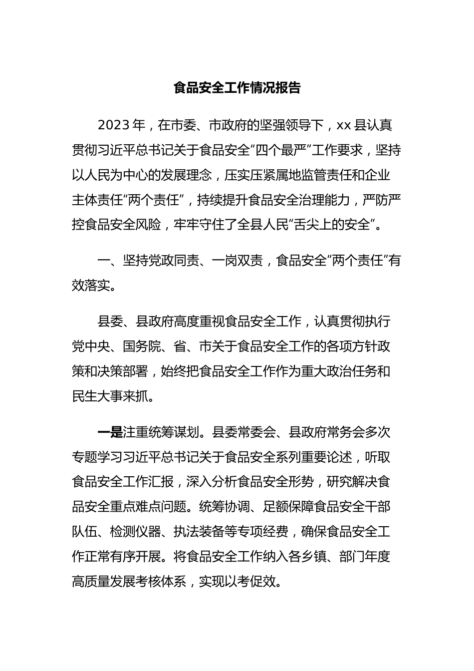 食品安全工作情况报告2023年,在市委、市政府的坚强领导下,xx县认真贯彻习近平总书记关于食品安全“四个最严”工作要求,坚持以人民为中心的发展理念,压实压紧属地监管责任和企业主体责任“两个责任”,持续提升食品安全治理能力,严防严控食品安全风险,牢牢守住了全县人民“舌尖上的安全”。一、坚持党政同责、一岗双责,食品安全“两个责任”有效落实。县委、县政府高度重视食品安全工作,认真贯彻执行党中央、国务院、省、市关于食品安全工作的各项方针政策和决策部署,始终把食品安全工作作为重大政治任务和民生大事来抓。一是注重统筹谋划。县委常委会、县政府常务会多次专题学习习近平总书记关于食品安全系列重要论述,听取食品安全工作汇报,深入分析食品安全形势,研究解决食品安全重点难点问题。统筹协调、足额保障食品安全干部队伍、检测仪器、执法装备等专项经费,确保食品安全工作正常有序开展。将食品安全工作纳入各乡镇、部门年度高质量发展考核体系,实现以考促效。二是注重体系架构。县食安办充分发挥抓总职能,形成“横向聚合力、纵向明责任、环节抓关键、主体控风险、执法严惩戒、宣传扩影响”的食品安全“六位一体、精准明责”工作机制。各乡镇成立13个食品安全办公室,不断加强乡镇食品安全监管员、协管员队伍建设。确定各级包保干部618人。前三季度完成包保主体3069户督导任务,完成率100%,有力推动落实食品安全属地责任。三是注重压实主责。落实食品生产企业主体责任,全部实现“一企一档”管理,建立诚信档案。实施分级分类监管,按风险程度将食品生产企业分为“A、B、C、党”四级,并根据日常监督检查情况,进行动态调整,目前B级风险(良好)以上企业达到80%。建立食品安全追溯体系,3户婴幼儿配方米粉生产企业完成追溯平台建设工作。开展食品生产企业全覆盖监督检查,出动执法人员386人次,检查食品生产企业185户次,下达责令整改通知书16份。二、坚持关口前移、主动排查,食品安全防范能力不断提升。将着力点落在“防”字上,切实加强食品安全风险隐患排查和食品抽检检测,把被动式防范变为主动式排查,及时发现并全力防控食品安全问题。一是强化食品抽查。根据市市场监督管理局印发《2023年吉安市食品安全监督抽检计划的通知》,聘请第三方机构抽检各类食品和食用农产品790批次,经检验合格763批次,不合格27批次,合格率96.58%。其中校园食品(食用农产品)抽检89批次,不合格1批次,合格率98.9%,达到省里97%以上的要求。完成食品快速检测2811批次。二是强化日常检查。常态化对全县餐饮和食品销售经营户进行日常监督检查,共计监督巡查餐饮店、食品店3078户次,其中餐饮店1613户次,食品店1465户次,督促食品经营户891户办理了食品经营许可证,4241人办理了健康证。三是强化暗访督查。定期和不定期对糕点、粮食制品、肉制品、食用油、乳制品、酒类、饮料、调味品等日常食品,大型商超、餐饮店、单位食堂、集贸市场、旅游景区、车站等重点场所单位,以及食品进货来源、制作过程、健康证办理等薄弱环节开展暗访督查,共检查食品生产经营单位3078户次,下发责令整改意见书22份。三、坚持底线思维、源头管控,食品安全全链监管成效良好。以问题为导向,控源头、强监管、严执法,健全从农田到餐桌全过程监管体系,实现全链条无缝链接。一是狠抓源头监管。食品安全源头在农产品,农产品质量安全是保障食品安全的重要前提和基础。投资300余万元建设农产品检测室,购置仪器设备59台套,具备农药残留、兽药残留、重金属等检测能力。13个乡镇均建立农产品检测室,配备一台农残快检仪和相关试剂耗材等仪器设备,配备专职乡镇监管员,每月定期开展农产品快速检测。每村选定1名村干部担任农产品质量安全协管员。县乡村三级共有监管人员198名,其中县级22名、乡镇38名、村级协管员138名,形成了县、乡、村三级网格化监管工作机制。截止目前共完成农产品检测5026批次,其中定量检测500批次、快速检测4526批次。二是狠抓专项监管。深入开展山茶油、缓解体力疲劳功能保健食品、母婴产品行业等专项整治行动。检查山茶油生产经营单位162家次,发现风险隐患8个...