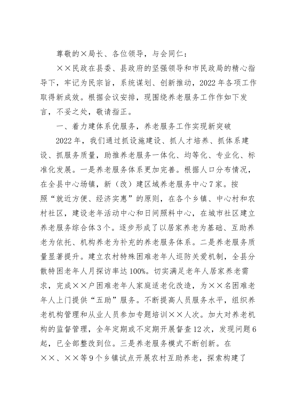 在2023年民政工作暨党风廉政建设工作会议上的发言尊敬的×局长、各位领导,与会同仁:××民政在县委、县政府的坚强领导和市民政局的精心指导下,牢记为民宗旨,系统谋划、创新推动,2022年各项工作取得新成效。根据会议安排,现围绕养老服务工作作如下发言,不妥之处,敬请指正。一、着力建体系优服务,养老服务工作实现新突破2022年,我们通过抓设施建设、抓人才培养、抓体系建设、抓服务质量,助推养老服务一体化、均等化、专业化、标准化发展。一是养老服务体系更加完善。根据人口分布情况,在全县中心场镇,新(改)建区域养老服务中心7家。按照“就近方便、经济实惠”的原则,在各个乡镇、中心村和农村社区,建设老年活动中心和日间照料中心,在城市社区建立养老服务综合体3个。逐步形成了以居家养老为基础、互助养老为依托、机构养老为补充的养老服务体系。二是养老服务质量显著提升。建立农村特殊困难老年人巡防关爱机制,全县分散特困老年人月探访率达100%。切实满足老年人居家养老需求,完成××户困难老年人家庭适老化改造,为××名困难老年人上门提供“五助”服务。不断提高人员服务水平,组织养老机构管理和从业人员参加专题培训××人次。加大对养老机构的监督管理,全年定期或不定期开展督查12次,发现问题6起,已全部整改到位。三是养老服务模式不断创新。在××、××等9个乡镇试点开展农村互助养老,探索构建了以“××××××××××××××”为依托的“×××××”农村互助养老新模式。一年来,累计动员××家社会组织为有需求的困难老年人提供助餐、助医、助洁等服务近××余人次,困难老年人的养老服务需求得到了不同程度的保障。其经验做法获得市政府主要领导肯定性批示,并代表××在全省农村养老服务发展现场会议上作经验交流发言,成功举办全市农村互助养老服务工作现场会。二、着力补短板提能力,推动为老服务取得新成效我县在推动养老服务工作中取得了一定成效,但与市局的要求和群众的期盼还有一定差距。下一步,我们将进一步采取措施,不断提高全县养老服务水平。一是在组织领导上再加强。成立以县人民政府县长为组长的养老服务工作领导小组,形成政府主导、部门协同的工作格局。完善工作协调推进机制,定期召开全县养老服务工作推进会,专题听取养老服务工作开展情况并解决存在的问题,研究部署下一步工作。二是在服务设施上再提升。完成××县失能老人养护院项目建设,提高对失能老人的照护能力。推进公办敬老院改革,通过关停、撤并和改扩建部分敬老院的方式,切实提升养老机构服务能力。同时,积极编报××区域性养老服务中心、××社区养老服务综合体等项目,向上加强对接,争取落地落实。三是在服务质量上再优化。持续推进农村互助养老服务,印发《××县农村互助养老服务工作实施方案》,完善以“志愿服务为基础、辖区政府为主导、民政予以适当补助”的保障机制,充分整合农村日间照料中心、幸福大院、养老机构等服务资源,有机结合居家养老服务、农村困难老年人适老化改造、特殊困难老年人巡防关爱等政策,加快服务队伍和阵地建设,力争2023年乡镇覆盖率达100%。打造城市社区“15分钟养老服务圈”,满足老年人助餐送餐、医疗康复、生活照料等需求。以培养专业服务人才为抓手,开展养老护理员技能培训。充分发挥“五社联动”作用,链接社会资源,引导老年协会、志愿服务队、社工机构等社会组织参与为老服务。四是在日常监管上再严格。从构建安全监管体系、提升安全管理水平、做实安全督导检查、提升智慧化安全监管能力四个方面着手,全面提升养老服务安全监管水平。成立县级养老服务指导中心,逐步将区域性养老服务中心和有条件的乡镇敬老院收归县级直管,把对养老机构监督管理作为重要职能。紧盯食品安全、消防安全、燃气安全、疫情防控和防养老诈骗等重点领域,开展专项培训、宣传教育、督促检查,为养老机构老年人的生命财产安全提供坚实保障。同时,对在建养老项目建设资料、资金拨付、建设质量和项目进度等方面加强监管。三、着力惠民生增福祉,奋力开创××民政新局面2023年,我将主推两件大事:一是完成第三批省级城乡社区治理试...