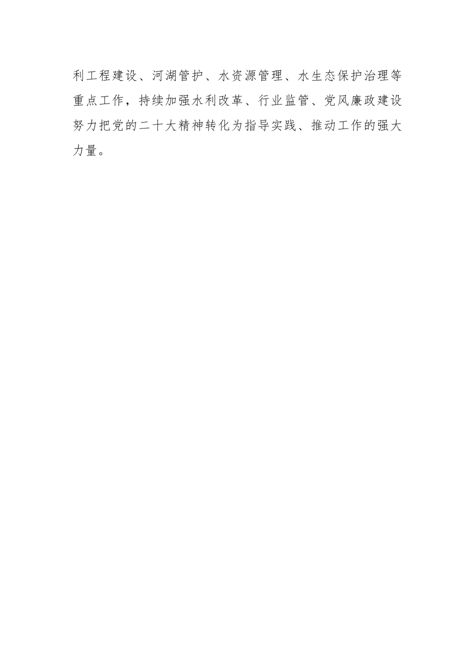 党员领导干部上一年度民主生活会个人检视剖析材料根据2022年度党员领导干部民主生活会通知要求,本人紧扣本次民主生活会的主题,紧紧围绕深入习近平新时代中国特色社会主义思想,学习贯彻党的二十大精神,坚持将个人自学和集体研讨相结合,与全局党员干部之间进行了深入的谈心谈话,进一步交流思想、交换意见,深入查找思想差距、理论短板、工作弱项,明确整改措施和今后努力方向。现将个人检视剖析情况如下:一、深入学习贯彻党的二十大精神情况10月16日上午,中国共产党第二十次全国代表大会在人民大会堂隆重开幕,习近平总书记代表第十九届中央委员会向大会报告。我全程认真观看了大会开幕式。会后,我通过互联网、微信官方账号和学习强国平台,全面、深入、系统地学习了报告全文及相关新闻报道和专家解读,深刻领会了党的二十大重要会议精神。作为一名党员领导干部水务部门的一把手,我紧紧围绕县委县政府各项部署要求坚持补短板、强监管,抓项目、促发展,着力抓好重大水利工程建设、河湖管护、水资源管理、水生态保护治理等重点工作,持续加强水利改革、行业监管、党风廉政建设努力把党的二十大精神转化为指导实践、推动工作的强大力量。二、个人有关情况说明(一)党史学习教育专题民主生活会整改情况2021年党史学习教育专题民主生活会,个人共梳理出6个方面16个问题,并制定方案,狠抓整改,所有问题已经完成年度整改任务,但还需要长期坚持几个方面:一是在理论学习方面,还需要持之以恒深学践悟习近平总书记新时代中国特色社会主义思想,精准把握其丰富内涵、内在逻辑、科学方法。二是在作风建设方面,还需要进一步建章立制,用制度管人管事管权,坚持严管厚爱相结合,提升治理效能,激发干事创业积极性。三是在抓落实方面,还需要进一步研究政策,解放思想,大胆突破,推动思想创新、能力创新和机制创新,解决好发展中的难点痛点堵点问题。(二)2022年度巡察整改专题民主生活会整改情况2022年10月巡察整改专题民主生活会上共梳理了3个方面23个问题。针对查摆出的问题,诚恳接受、全面认领,并根据反馈意见,细化梳理出具体问题23个,成立整改领导小组,制定下发《中共***党组关于十五届县委第一轮巡察反馈意见的整改落实方案》,并制定问题台账,扎实开展整改工作。整改过程中,我严格落实巡察整改第一责任人职责,高度重视县委巡察组反馈意见整改落实工作,亲自研究部署,亲自协调推进,坚持问题导向,以上率下,真抓实改保障了整改工作落实到位。目前,已完成整改问题17个,正在推进整改问题6个,整改完成率74%。(三)个人有关事项报告本人能严格遵守《关于领导干部报告个人有关事项的规定》,报告了个人有关事项情况,没有出现瞒报、漏报现象。严格遵守党员领导干部廉洁自律各项规定,从严要求家庭成员和身边工作人员,没有以个人或借他人名义经商办企业;办公用房面积**平方米,没有超标;公务用车按程序向县机关事务管理局公务用车平台申请使用,没有用公款报销或者支付应由个人负担的费用,不存在出入会所或持有会员卡的情况;妻子***,在***,儿子在***上班。现有商品房1套,面积***,位于***;没有大操大办、违规接受私人宴请和违规参加婚丧嫁娶等现象。2022年,我本人没有接受组织约谈、函询、受到问责或因“四风”问题被查处的情况。三、存在的主要问题(一)在带头深刻领悟“两个确立”的决定性意义,增强“四个意识”、坚定“四个自信”、做到“两个维护”方面。一是对“两个确立”领悟还不够深入。对“两个确立”的时代背景、重大意义、深刻内涵还缺乏更深层次的理解,对“两个确立”在新时代党和国家事业发展、推进中华民族伟大复兴历史进程的决定性意义领会还不够深入比如:对习近平总书记提出的“十六字”的治水思路缺乏系统的思考和可行性的规划,面对全县水资源供需矛盾问题,缺乏有效手段和创新举措。二是在践行“两个确立”的实践要求上有差距。在如何把握好“两个确立”思想理论的抽象性和实际行动的实践性上,缺少全面深入的思考;对于如何将党的创新理论融入到贯彻落实各项方针政策和水利工作部署之中,对加快推进水利基础设施建设助力**经济...