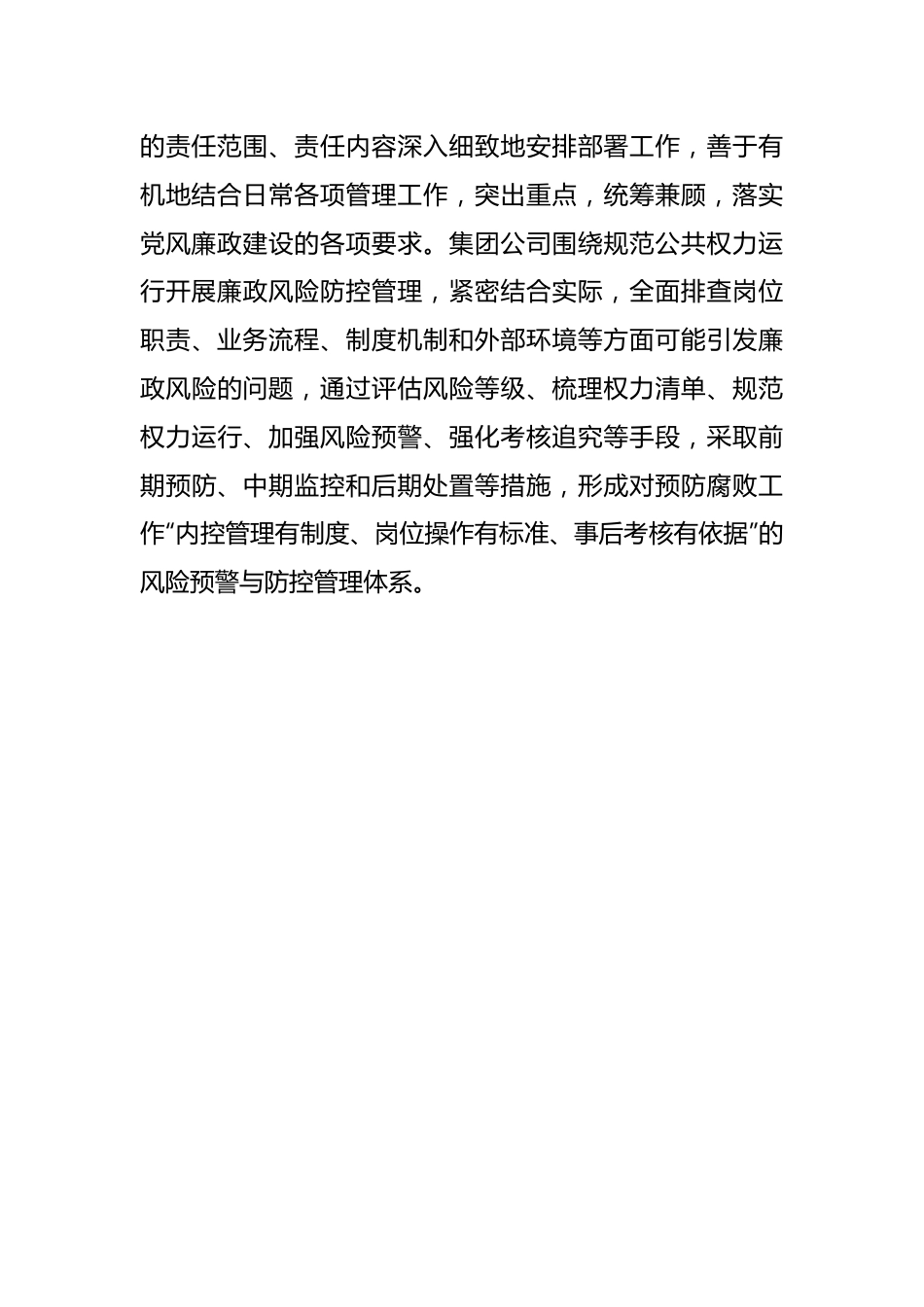 某国企领导廉政党课为全面贯彻落实中央“党要管党、从严治党”的总体部署,认真落实“两个责任”,进一步增强全体党员干部转变作风、遵章守纪、廉洁从业的意识,提高拒腐防变的能力,今天我们讲一堂廉政党课,主要目的是通过这种形式,让大家在思想上受到一次警示、警醒和教育,进一步牢筑思想防线自觉增强“免疫力”,深化反腐倡廉建设,为推进公司改革发展营造海晏河清的政治生态。一、为什么要加强党风廉政建设“物必先腐,而后虫生”。党风廉政建设,是广大干部群众始终关注的重大政治问题。反对腐败,建设廉洁政治,保持党的肌体健康,始终是我们党一贯坚持的鲜明立场。加强党风廉政建设,是落实党的宗旨,凝聚党心民心的本质要求。作为党员干部,老百姓对我们的期待其实很简单主要就是三件事,即经济社会要发展、民生要改善、干部要廉洁。做到了,我们就不负众望;做不到,就难辞其咎邓小平同志曾讲过,党员干部一要怕党,二要怕群众。这种“怕”,就是要对组织、对群众有敬畏之感,就是要正确对待、主动接受人民群众的监督。所以说,腐败就像一座无形的墙把我们党和人民群众隔开,任其发展下去,我们党就会失去根基、失去血脉、失去力量。对于党员干部来说清廉更是一种无声的力量,其道德行为具有放大和示范效应,一言一行都会影响和带动他人。正所谓“其身正,不令而行;其身不正,虽令不从”。一个官德失范的党员干部不可能有威信,也不可能在群众中产生凝聚力。只有保持清正廉洁的政治本色,才能心怀天下、无私奉献、为民谋利才能真正赢得民心、赢得事业、赢得未来。二、筑牢思想防线,守住纪律底线,推动公司党风廉政建设和反腐败工作向纵深发展(一)进一步落实党风廉政建设责任。集团公司党委同各部室及下属子公司负责人签订了党风廉政建设目标责任书这就意味着,各单位承担了本单位党风廉政建设责任,挑起了这副重担。党风廉政建设的责任关键是通过抓具体工作来落实,不能仅仅停留在责任书上。各单位要对照各自的责任范围、责任内容深入细致地安排部署工作,善于有机地结合日常各项管理工作,突出重点,统筹兼顾,落实党风廉政建设的各项要求。集团公司围绕规范公共权力运行开展廉政风险防控管理,紧密结合实际,全面排查岗位职责、业务流程、制度机制和外部环境等方面可能引发廉政风险的问题,通过评估风险等级、梳理权力清单、规范权力运行、加强风险预警、强化考核追究等手段,采取前期预防、中期监控和后期处置等措施,形成对预防腐败工作“内控管理有制度、岗位操作有标准、事后考核有依据”的风险预警与防控管理体系。各单位要定期对落实责任情况进行检查,职责划分不清的必须予以明确,工作不到位的要尽快到位。按照一级抓一级的要求,层层抓落实,要切实履行党风廉政责任制的要求。公司纪委要发挥职能部门的指导作用,加大监管力度要抓住财务管理、营销采购、工程项目招投标等企业管理的关键环节,建立健全企业内部监督制约机制,防止国有资产流失。要认真开展效能监察和企业内部审计工作,不断促进企业管理水平和效益的提高。(二)抓好廉洁文化活动。廉洁文化是党风廉政教育的应有之义,是惩防体系建设和企业文化的重要组成部分。搞好廉政文化活动,有利于营造反腐倡廉的政治环境,净化社会环境。廉政教育主要针对党员干部,提高党员干部的廉洁从业意识。廉洁文化针对包括党员干部在内的广大职工群众,目的是形成一种崇尚廉洁诚信,抵制不良风气的社会氛围,从而对党员干部勤政廉政产生积极的影响。我们要坚持党性原则,坚决抵制和克服自由主义和好人主义同一切损害国家、企业和职工利益的行为作斗争,坚决抵制一切不正之风。要提高认识,重视廉洁文化建设,把廉洁文化活动融入到企业文化建设中去,通过开展形式多样的群众性文化活动,促进党风廉政建设。三、正确认识当前反腐倡廉工作中存在的问题,保持清醒头脑,筑牢拒腐防变防线(一)当前的腐败现象呈现几个特点∶一是腐败“集团化”。个人腐败向团伙、集团腐败发展,串案、窝案、案中案明显增多。二是腐败“部门化”。主要特点是“公权私用”,“靠山吃山,靠水吃水”,“近水楼台先得月”,“公共权...