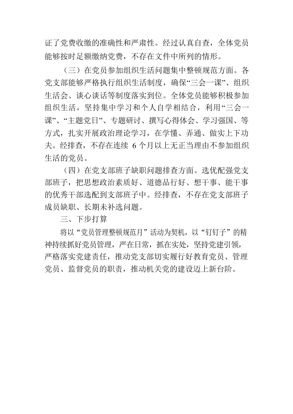 为进一步规范党员管理,确保每名党员都纳入党组织的有效管理之中,根据机关工委下发的《关于开展“党员管理整顿规范月”活动的通知》精神,**高度重视,认真开展了自检自查工作。现将工作情况汇报如下。一、提高认识,加强学习为确保“党员管理整顿规范月”活动的有序开展,深入传达学习《关于开展“党员管理整顿规范月”活动的通知》,要求以党支部为单位利用一个月时间,深入查摆问题,全面落实文件要求,确保排查工作不走过场,落到实处。二、突出重点任务,扎实推进在自检自查工作实施过程中,紧紧围绕4项重点任务作为“规范月”的活动载体和抓手,全面推进各项工作开展。(一)在党员组织关系管理问题集中整顿规范方面。党总支下设两个党支部,分别为***党支部和***党支部,***党支部下设*个党小组。党总支现有党员**人,其中在职党员**人,退休党员**人。经排查,不存在文件所列情形,所有党员组织关系均为本单位党组织管理的人员。(二)在党员党费收缴问题集中整顿规范方面。各党支部能够严格落实“一月一收缴,一月一公示”,严格按照工资基数对党费收缴比例进行更新核定,并仔细填写《党组织和党员上交党费情况统计表》,报市直机关工委备案,做到了党员缴纳党费有台账、党支部收缴党费有明细表,有力的保证了党费收缴的准确性和严肃性。经过认真自查,全体党员能够按时足额缴纳党费,不存在文件中所列的情形。(三)在党员参加组织生活问题集中整顿规范方面。各党支部能够严格执行组织生活制度,确保“三会一课”、组织生活会、谈心谈话等制度落实到位。全体党员能够积极参加组织生活,坚持集中学习和个人自学相结合,利用“三会一课”、“主题党日”、专题研讨、撰写心得体会、学习强国、等方式,扎实开展政治理论学习,在学懂、弄通、做实上下功夫。经排查,不存在连续6个月以上无正当理由不参加组织生活的党员。(四)在党支部班子缺职问题排查方面。选优配强党支部班子,把思想政治素质好、道德品行好、想干事、能干事的优秀干部选配到支部班子中。经排查,不存在党支部班子成员缺职、长期未补选问题。三、下步打算将以“党员管理整顿规范月”活动为契机,以“钉钉子”的精神持续抓好党员管理,严在日常,抓在实处,坚持党建引领,严格落实党建责任,推动党支部切实履行好教育党员、管理党员、监督党员的职责,推动机关党的建设迈上新台阶。