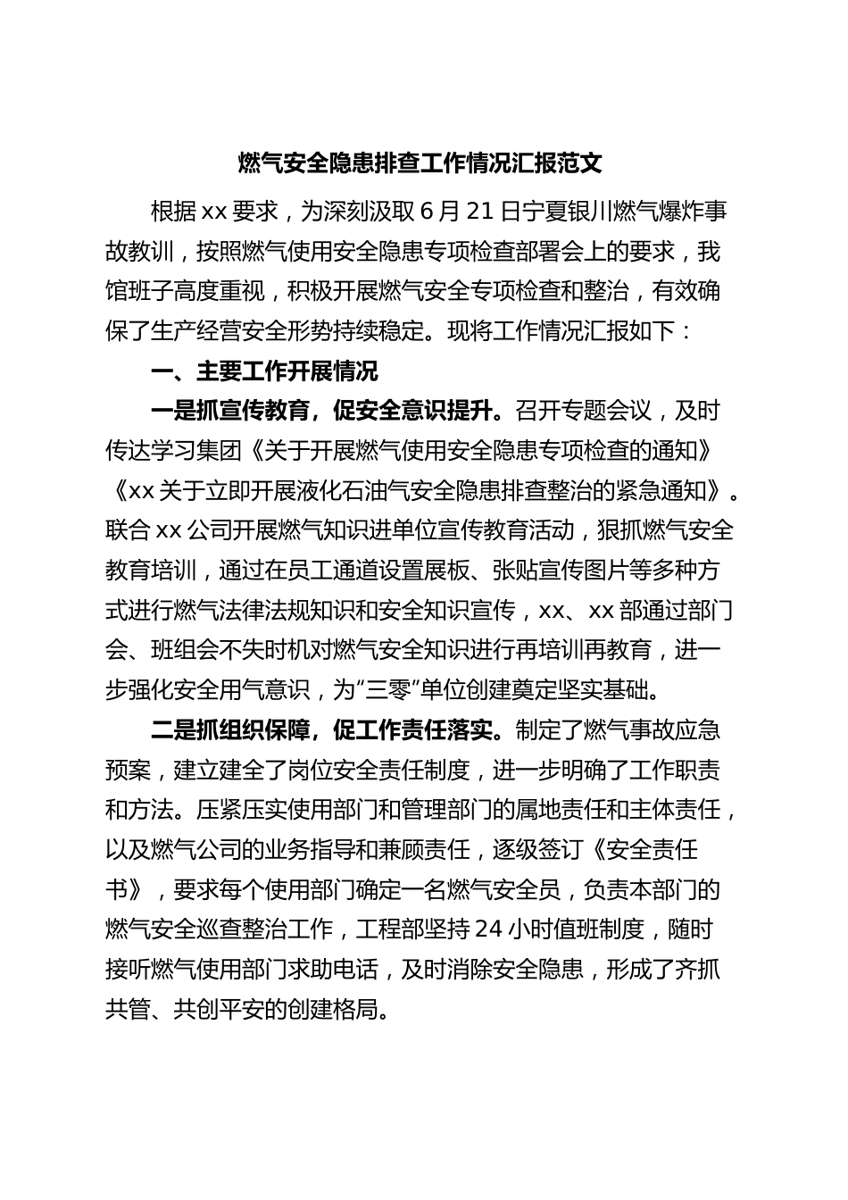 燃气安全隐患排查工作情况汇报范文根据xx要求,为深刻汲取6月21日宁夏银川燃气爆炸事故教训,按照燃气使用安全隐患专项检查部署会上的要求,我馆班子高度重视,积极开展燃气安全专项检查和整治,有效确保了生产经营安全形势持续稳定。现将工作情况汇报如下:一、主要工作开展情况一是抓宣传教育,促安全意识提升。召开专题会议,及时传达学习集团《关于开展燃气使用安全隐患专项检查的通知》《xx关于立即开展液化石油气安全隐患排查整治的紧急通知》。联合xx公司开展燃气知识进单位宣传教育活动,狠抓燃气安全教育培训,通过在员工通道设置展板、张贴宣传图片等多种方式进行燃气法律法规知识和安全知识宣传,xx、xx部通过部门会、班组会不失时机对燃气安全知识进行再培训再教育,进一步强化安全用气意识,为“三零”单位创建奠定坚实基础。二是抓组织保障,促工作责任落实。制定了燃气事故应急预案,建立建全了岗位安全责任制度,进一步明确了工作职责和方法。压紧压实使用部门和管理部门的属地责任和主体责任,以及燃气公司的业务指导和兼顾责任,逐级签订《安全责任书》,要求每个使用部门确定一名燃气安全员,负责本部门的燃气安全巡查整治工作,工程部坚持24小时值班制度,随时接听燃气使用部门求助电话,及时消除安全隐患,形成了齐抓共管、共创平安的创建格局。三是抓隐患排查,促问题整改落实。建立同燃气、消防等部门建立信息共享、及时反馈、共同管理等机制,在检查过程中,认真对照燃气安全检查标准,重点检查管线是否破裂、脱落,胶管两端卡箍是否松动;燃气管道周围是否堆放或悬挂物品;营业场所是否配有灭火器等进行检查。使用部门利用便携式检漏仪等设施设备每天对所有燃气管道、设施进行拉网式排查,对调压站进行检查、维护,认真检查机器设备运行情况,认真做好检查记录,建立隐患排查台账,设备检修维护台账、问题整改台账,能整改的现场整改、销号,不能立即整改的确定整改时限,确保安全隐患排查整改不缺项、不漏点,实现有效闭合管理。深化标准化建设,对燃气管线、操作流程设置标贴和制度上墙,坚持做好每日班前、班后燃气检测登记。更换安全阀门x个,张贴标识标签x余个。四是抓长效机制,促安全生产根基。大力加强安全教育培训体系建设,着力培养专业过硬、素质过硬、能力过硬、作风过硬、管理过硬的安全专业人才队伍。深刻吸取宁夏银川等安全事故教训,举一反三,压实责任,以最严标准最硬措施,深入开展风险隐患大排查大整治。运用隐患排查、重点隐患整治等手段,坚持岗点日查、部门周查、酒店月查、义务消防员检查和“日报告”相结合,采取“挂帐销号”的办法,组织安全检查整治和隐患排查治理,对影响安全稳定的设施隐患、思想隐患、管理隐患进行彻底整治,营造稳定和谐的安全生产环境。二、存在的不足通过此次燃气安全检查,还发现一些不足:一是有部分工作人员安全意识不够强,对燃气危险性认识不到位;二是燃气安全宣传培训教育还需进一步提升;三是燃气安全标准化管理工作还需进一步加强。三、下一步工作计划在今后的工作中,我们将以杜绝燃气安全重特大事故为目标,狠抓燃气安全监管工作,进一步提高安全检查工作的有效性。一是持续加大燃气安全相关设施、设备管理,做好日常监督检查,及时发现、处理和消除隐患,确保不留死角,不留隐患。二是深化燃气安全的认识,通过微信群、报纸等媒介,加强对燃气安全使用知识的宣传力度,进一步强化燃气安全知识的普及和教育,提高员工安全意识。三是监督落实燃气安全主体责任,完善应急预案,加强演练频次,切实提高员工处置突发事件的能力。