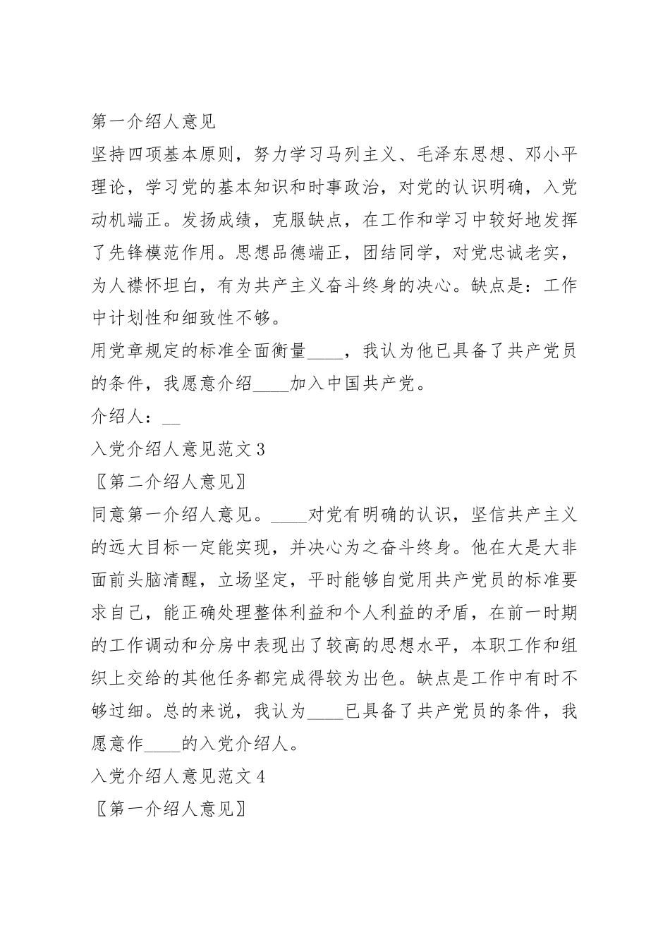 党员推荐入党介绍人意见100字_入党介绍人意见范文10篇很多读者对写党员推荐入党介绍人意见100字_入党介绍人意见范文10篇感到非常苦恼吧?编辑与大家分享几篇《党员推荐入党介绍人意见100字_入党介绍人意见范文10篇》美文汇总,欢迎大家借鉴,一起仿效,你也可以在此搜索更多与《党员推荐入党介绍人意见100字_入党介绍人意见范文10篇》相关的范例。入党介绍人要定期向党组织汇报对被介绍人的培养、教育和考察情况。那么关于入党介绍人意见该怎么写呢?下面是小编给大家整理的党员推荐入党介绍人意见100字_入党介绍人意见范文10篇,欢迎大家借鉴与参考,希望对大家有所帮助。入党介绍人意见范文1第二介绍人意见同意第一介绍人意见。____对党有明确的认识,坚信共产主义的远大目标一定能实现,并决心为之奋斗终身。他在大是大非面前头脑清醒,立场坚定,平时能够自觉用共产党员的标准要求自已,能正确处理整体利益和个人利益的矛盾。该_遵纪守法,为人诚信正直,对党忠诚老实,在群众中有较高的威信。缺点是个人的表达能力欠缺。总的来说,我认为____已具备了共产党员的条件,我愿意作____的入党介绍人,介绍其加入中国共产党。介绍人:__入党介绍人意见范文2第一介绍人意见坚持四项基本原则,努力学习马列主义、毛泽东思想、邓小平理论,学习党的基本知识和时事政治,对党的认识明确,入党动机端正。发扬成绩,克服缺点,在工作和学习中较好地发挥了先锋模范作用。思想品德端正,团结同学,对党忠诚老实,为人襟怀坦白,有为共产主义奋斗终身的决心。缺点是:工作中计划性和细致性不够。用党章规定的标准全面衡量____,我认为他已具备了共产党员的条件,我愿意介绍____加入中国共产党。介绍人:__入党介绍人意见范文3〖第二介绍人意见〗同意第一介绍人意见。____对党有明确的认识,坚信共产主义的远大目标一定能实现,并决心为之奋斗终身。他在大是大非面前头脑清醒,立场坚定,平时能够自觉用共产党员的标准要求自己,能正确处理整体利益和个人利益的矛盾,在前一时期的工作调动和分房中表现出了较高的思想水平,本职工作和组织上交给的其他任务都完成得较为出色。缺点是工作中有时不够过细。总的来说,我认为____已具备了共产党员的条件,我愿意作____的入党介绍人。入党介绍人意见范文4〖第一介绍人意见〗____自__年_月_日向党递交了入党申请书以来,坚持四项基本原则,努力学习马列主义、毛泽东思想和邓小平理论,学习党的基本知识和时事政治,我认为该_对党的认识明确,入党动机端正。1998年在__部门工作时,就曾被列为发展对象。调入我处工作后,能够更加严格要求自己,发扬成绩,克服缺点,在工作和学习中较好地发挥了先锋模范作用。思想品德端正,团结_,对党忠诚老实,为人襟怀坦白,廉洁自律,有为共产主义奋斗终身的决心。缺点是:工作中计划性和细致性不够。用党章规定的党员标准全面衡量____,我认为他已基本具备了共产党员的条件,我愿意介绍____加入中国共产党。入党介绍人意见范文5第二阶段考察意见_在更方面都有了较大的进步,学习生活中,能够联系群众,本着全心全意为人民服务的宗旨,热心助人,在专业课程的学习中刻苦努力,有明确的学习目标,在同学当中树立了良好的榜样,但是,还应该看到_在自身性格的历练方面应多多加强,待人接物应更加热情开朗,做事也应更加大胆泼辣,争取自身的全面突破。入党介绍人意见范文6第三阶段考察意见_较前段有更大的进步,这段时间内_认真参加党支部的各项活动,积极学习三个代表重要思想的深刻内涵,应用先进的方法论指导实践,在理论上不断充实完善自己,在学习生活中,用一名共产党员的标准严格要求自己,团结同学,热爱生活,在同学当中树立了良好的典范,在今后的学习当中,应注意培养独立思考的能力,多关注时事,政治敏锐性与把握大局的能力有待加强_取得了很大的进步,_积极向党组织靠拢,积极表现,有意识地培养自己作为一名共产党员应有的基本素质,继续加强理论方面的学习,在实践中不断完善与超越自我,在学习与生活中,全面平衡提高,继续发扬自身的优点,团结_,共同进步,希望能持之以恒,在今后的学习生活中,...